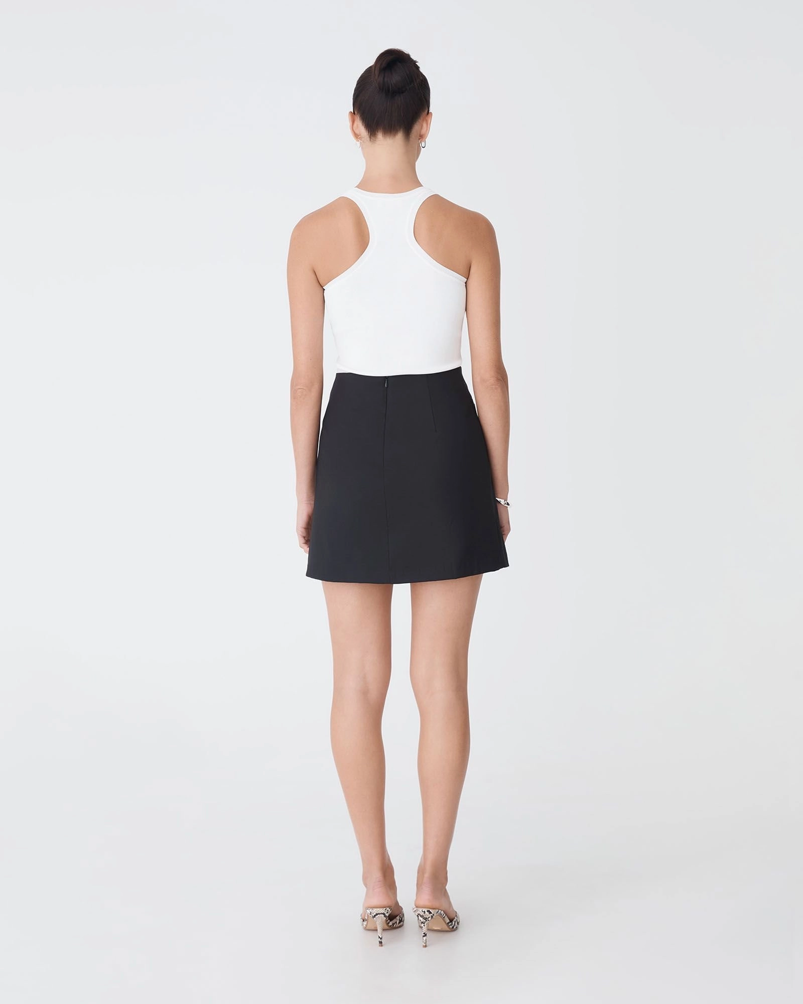 The Aaria Asymmetric Mini Skirt features a modern wrap-front silhouette with a fixed waistband and clean, tailored finish. Designed with a faux welt pocket and invisible back zipper for a polished look, this fully lined mini offers a comfortable fit in a slight stretch fabrication - perfect for day-to-night styling.