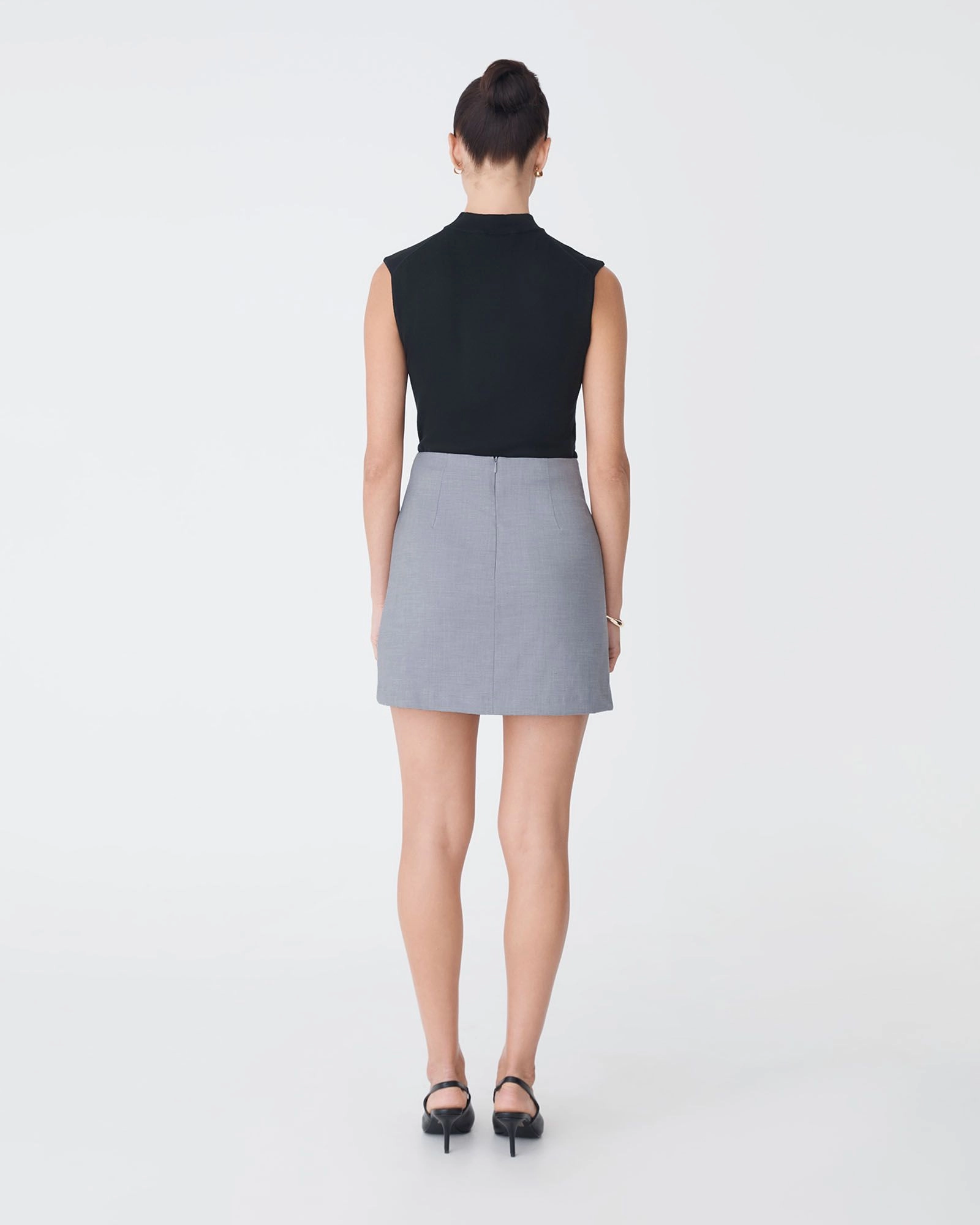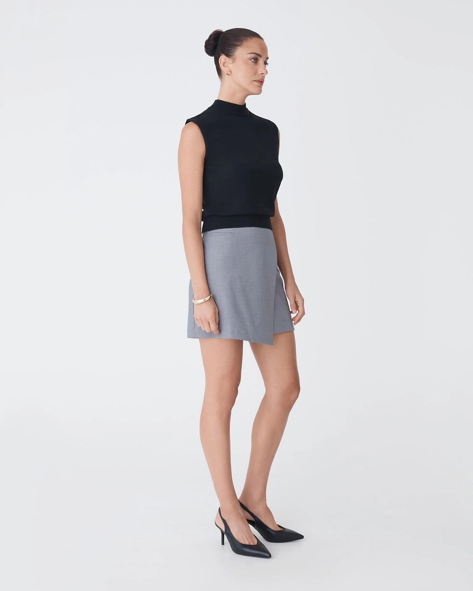 The Aaria Asymmetric Mini Skirt features a modern wrap-front silhouette with a fixed waistband and clean, tailored finish. Designed with a faux welt pocket and invisible back zipper for a polished look, this fully lined mini offers a comfortable fit in a slight stretch fabrication - perfect for day-to-night styling.