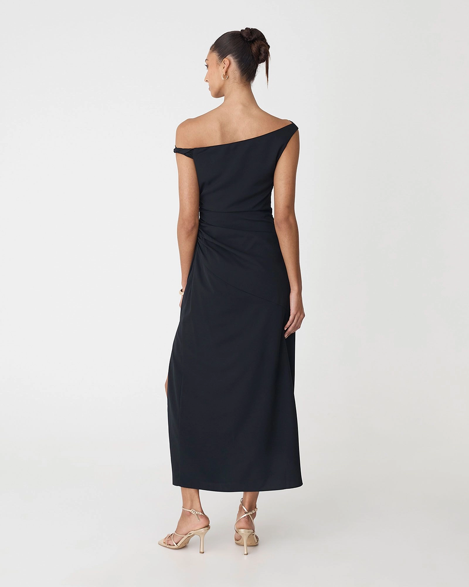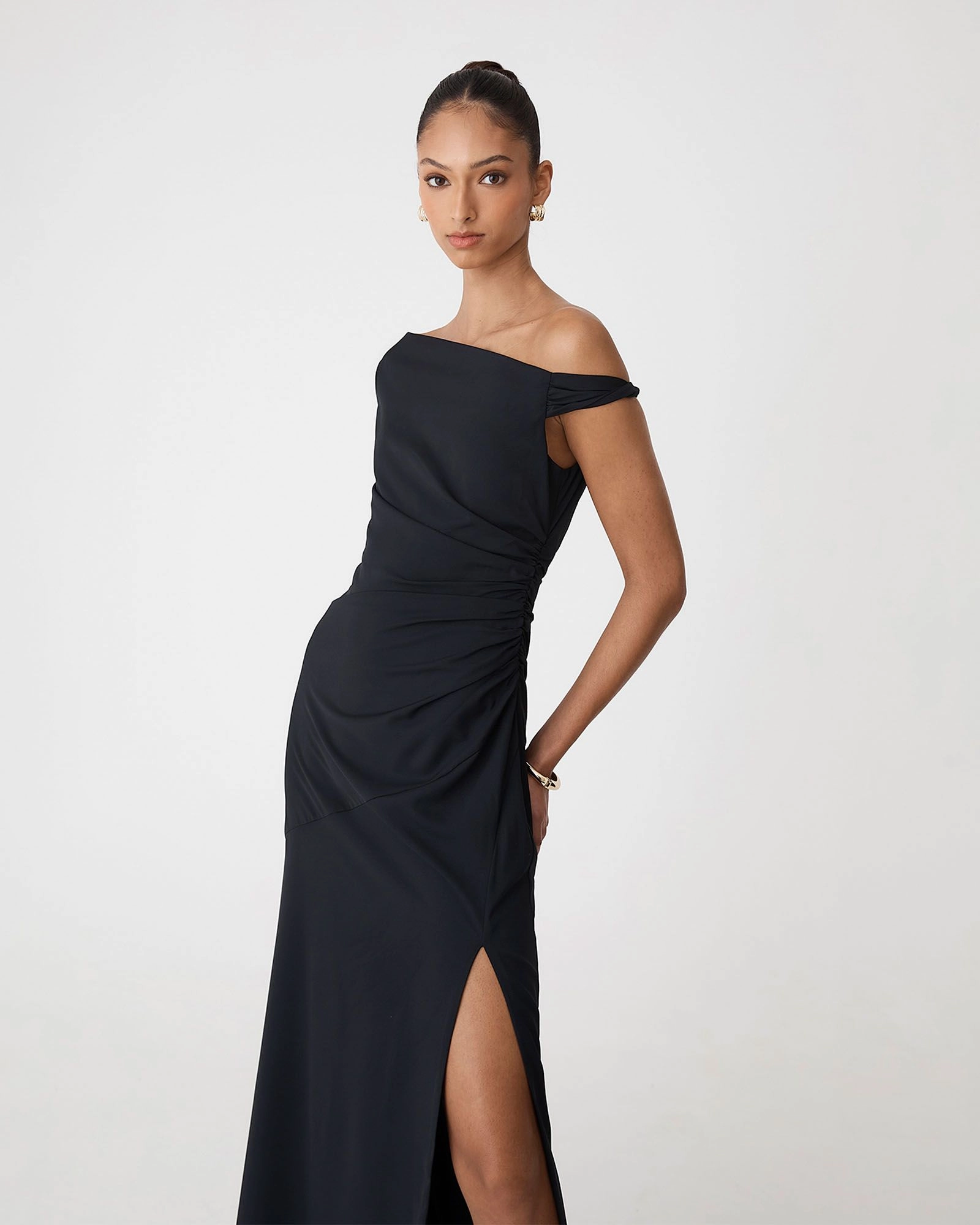 Elevate your evening wardrobe with the captivating Afina One Shoulder Twist Dress. Defined by its sculptural one-shoulder neckline and flattering ruched waist detail, the dress drapes into a graceful silhouette, complete with a thigh-high slit for a confident finish. Style with heels and minimal accessories to showcase its striking details.