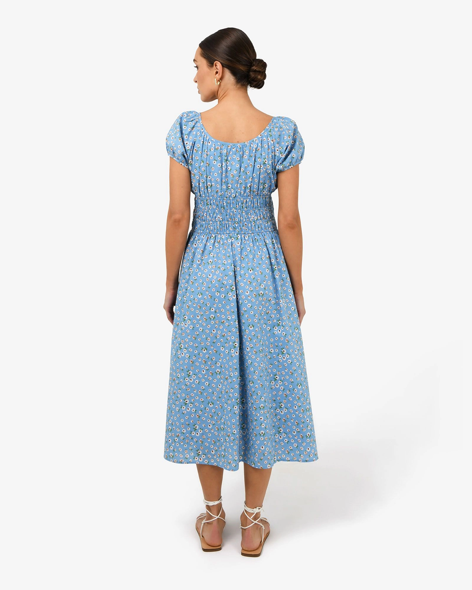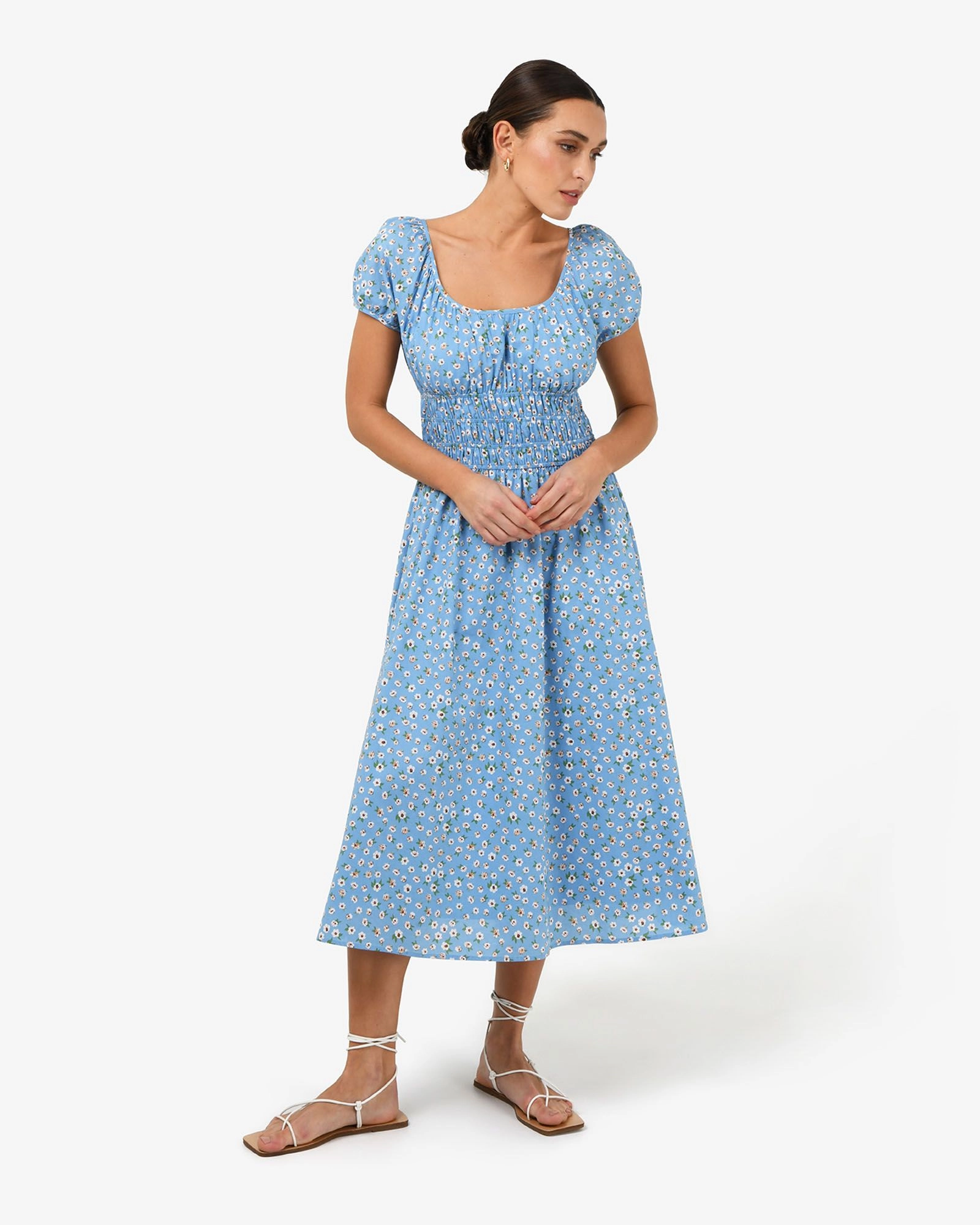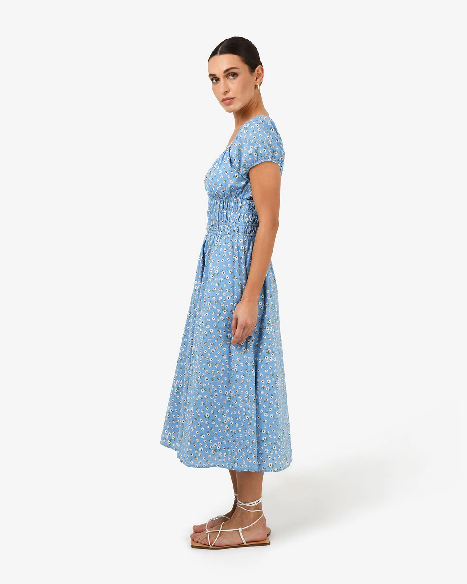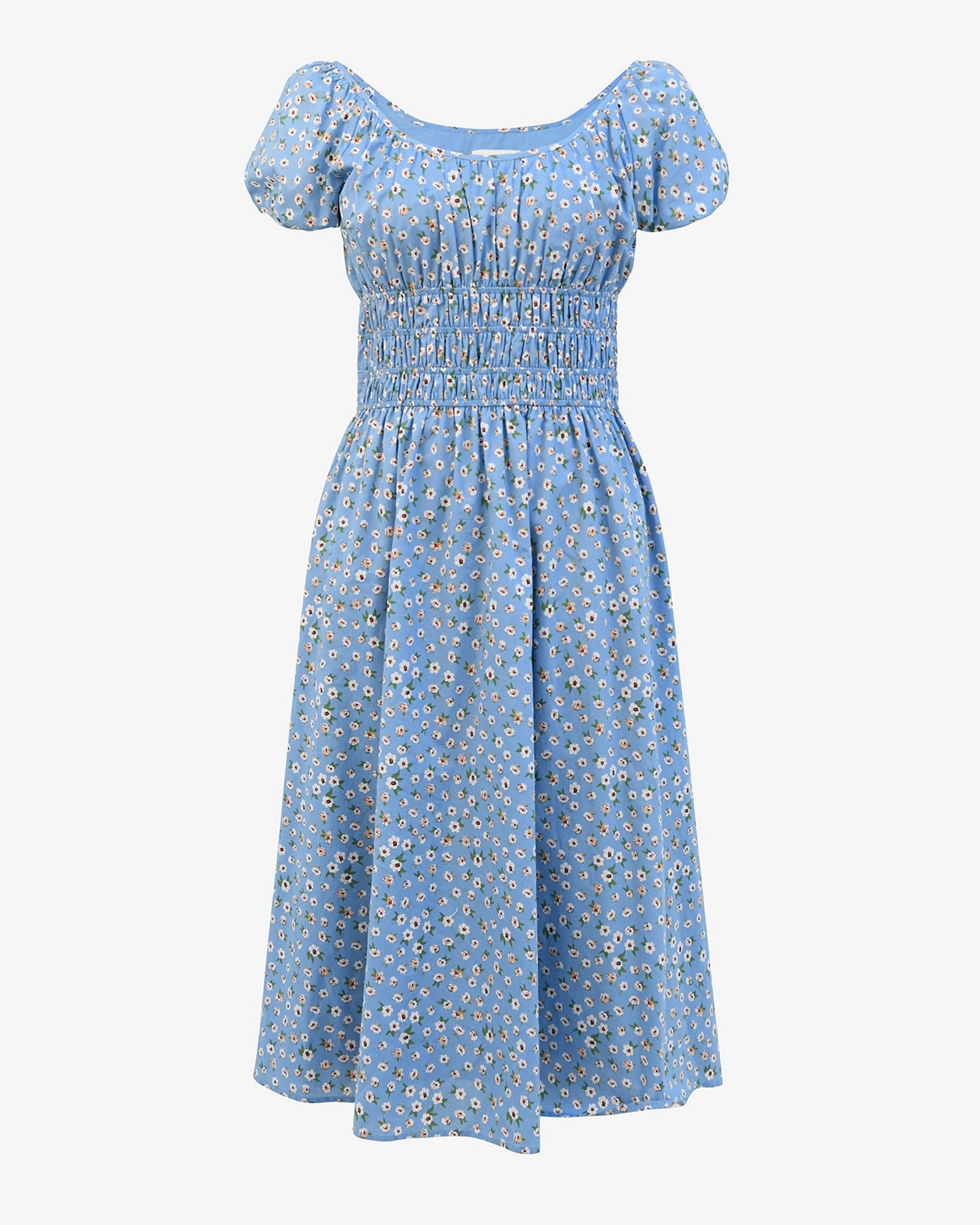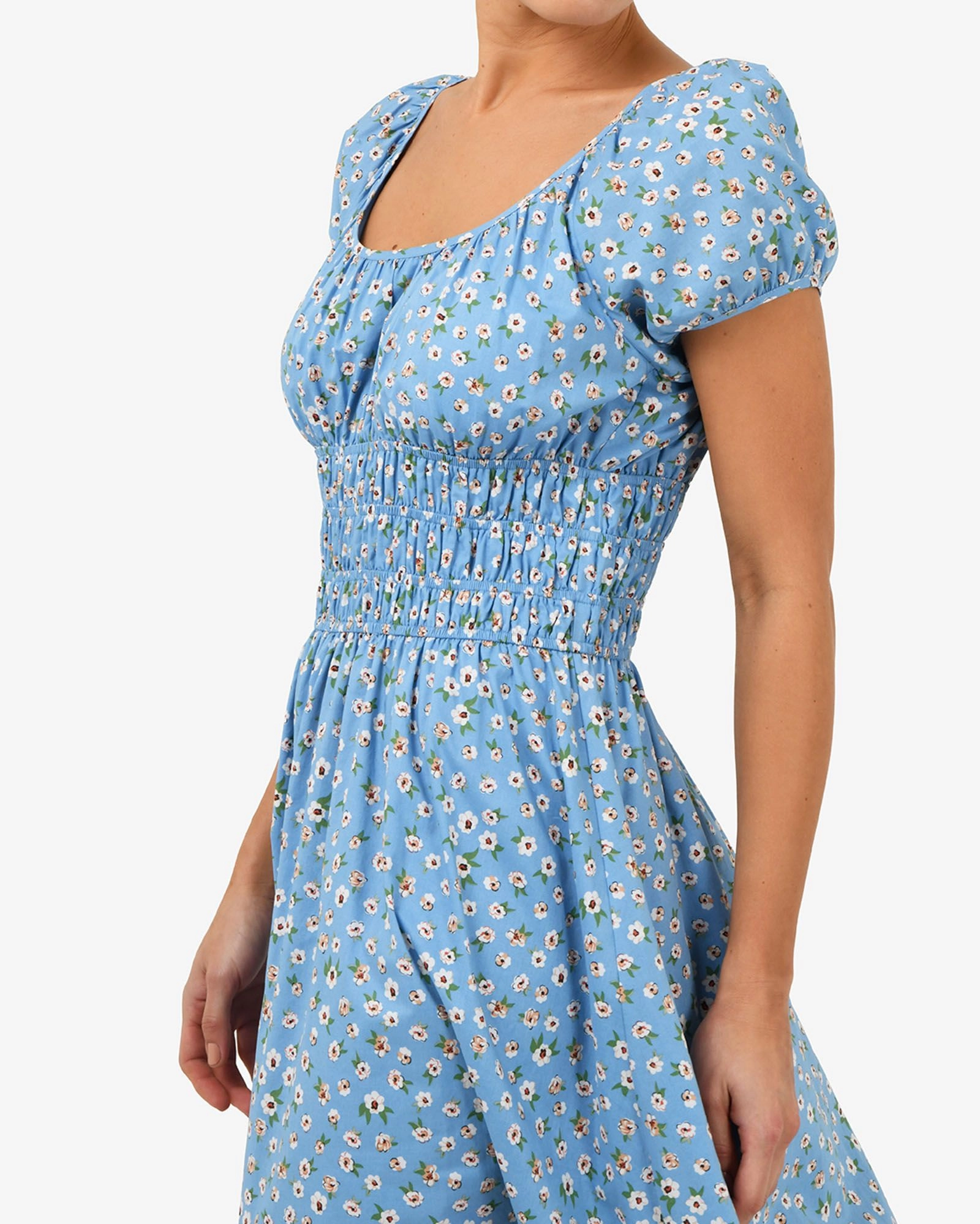 The Alisa Shirred Midi Dress features an all-over ditzy floral print with a fitted shirred bodice and short puff sleeves. Designed from lightweight, breathable cotton fabric, its A-line silhouette and midi length make it an ideal dress for warm-weather days. Style with boho resin jewellery and strappy sandals to complete your look.