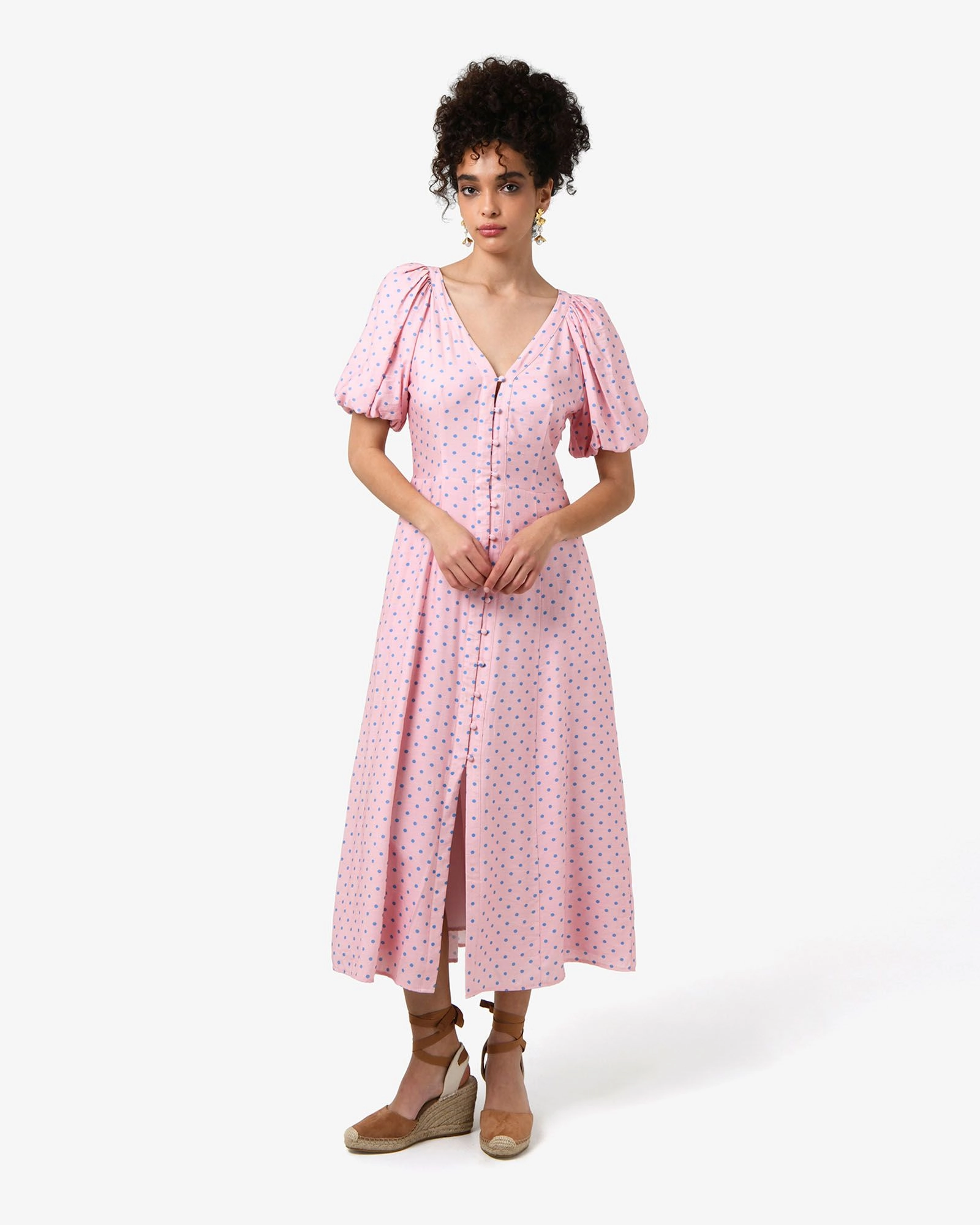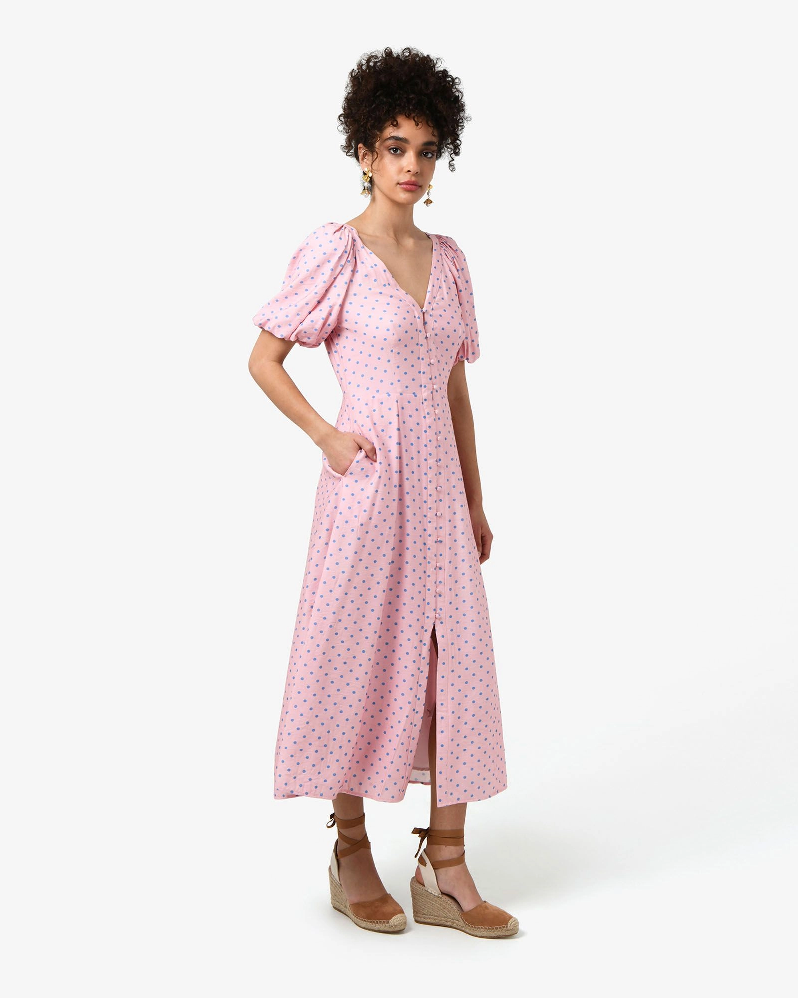 The Almeria Polka Dot Dress is a Spring piece that features a playful polka dot pattern, a V-neckline, puff short sleeves and functional side pockets. Fully lined and cut to a midi length, it can be accessorised with statement accessories to complete the look.