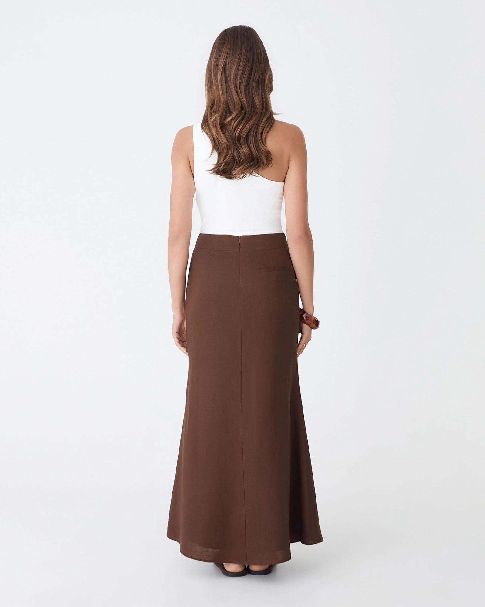 The Amelia Linen Blend Maxi Skirt features a breathable linen-blend fabrication with a flattering high-waisted, fixed waistband. Designed with an invisible back zipper, full lining and a flute hem, it falls to a graceful maxi length - perfect for effortless day to night styling. Keep it simple with a top and sandals, or dress it up with heels and statement jewellery.