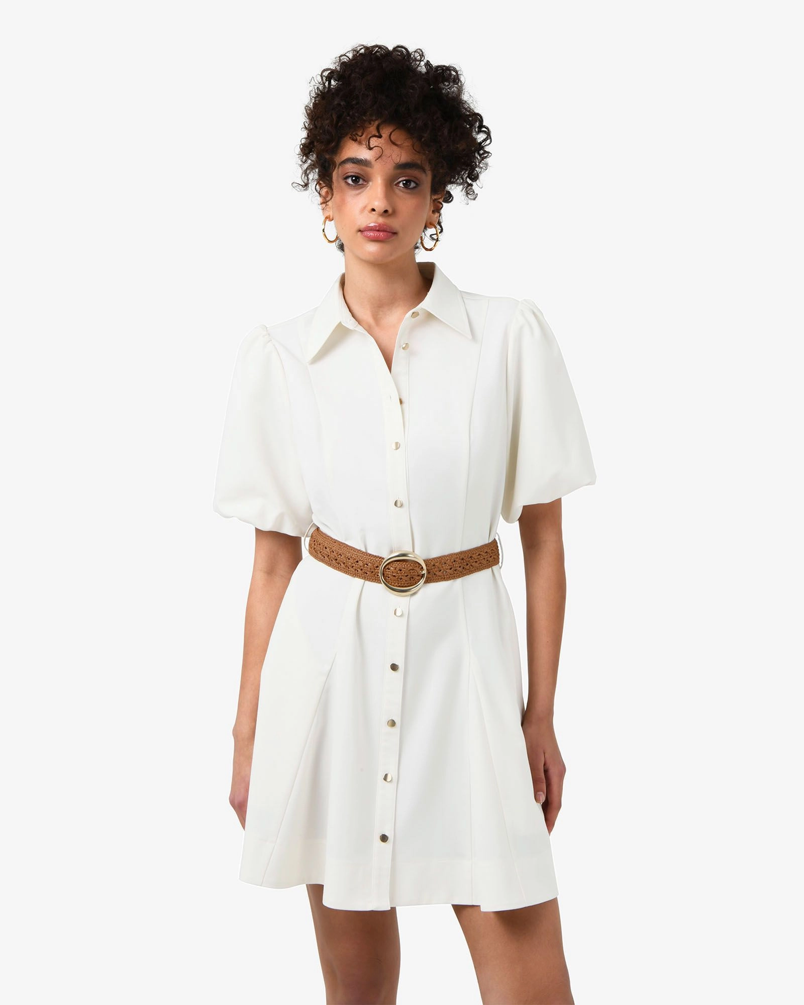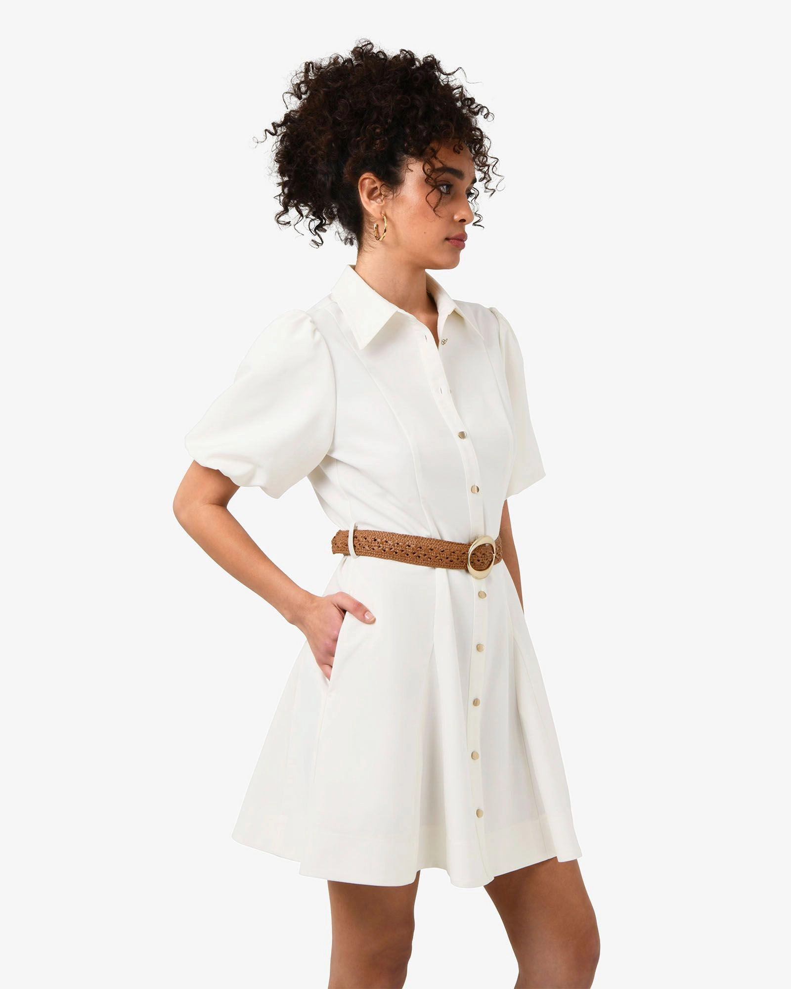 The Amera Belted Mini Dress combines playful sophistication and effortless style. Featuring a crisp shirt collar, button-up front and short puff sleeves, it is cinched at the waist with a matching detachable belt. Designed in a flattering A-line silhouette and mini length, it is utility-inspired with an elegant touch.