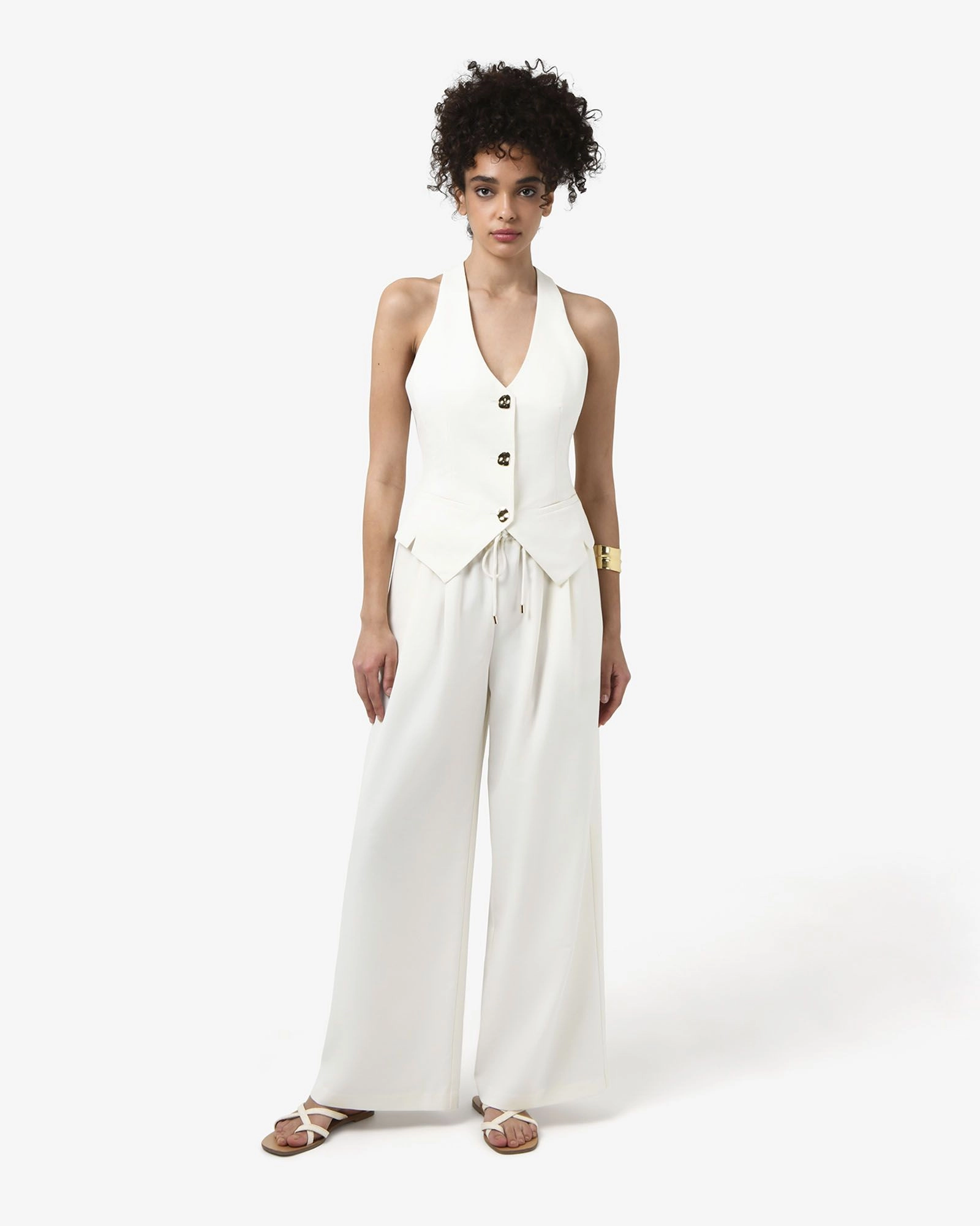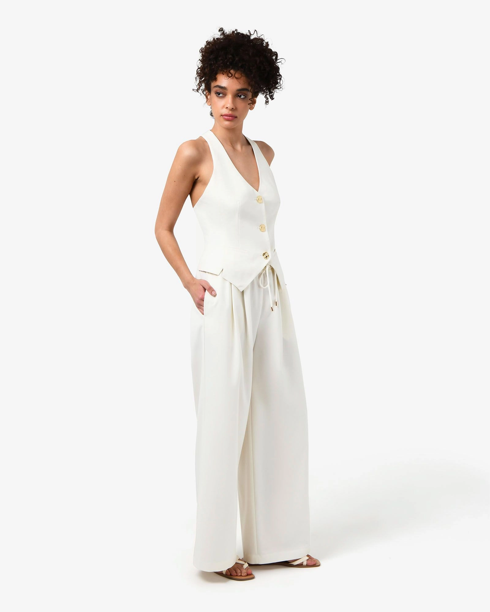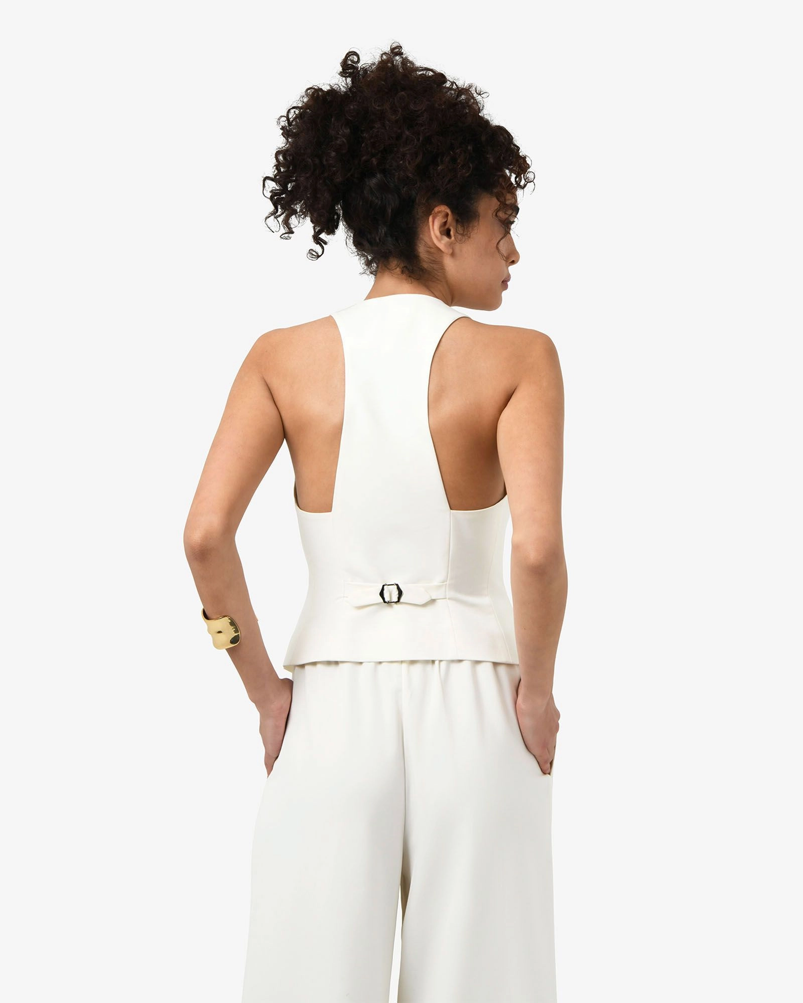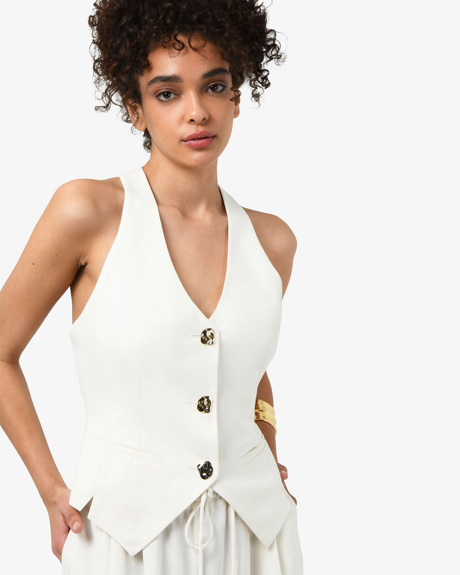 The Amera Racer Back Vest features a low V-neckline and a racer back for a sleek, modern silhouette. Designed with a front button-up closure with textured gold buttons, it has functional front welt pockets and a back waist adjuster for a tailored fit. Fully lined with slight stretch fabrication, style with shorts and skirts or pair it with the matching Amera Elastic Waist Pants for a coordinated ensemble.