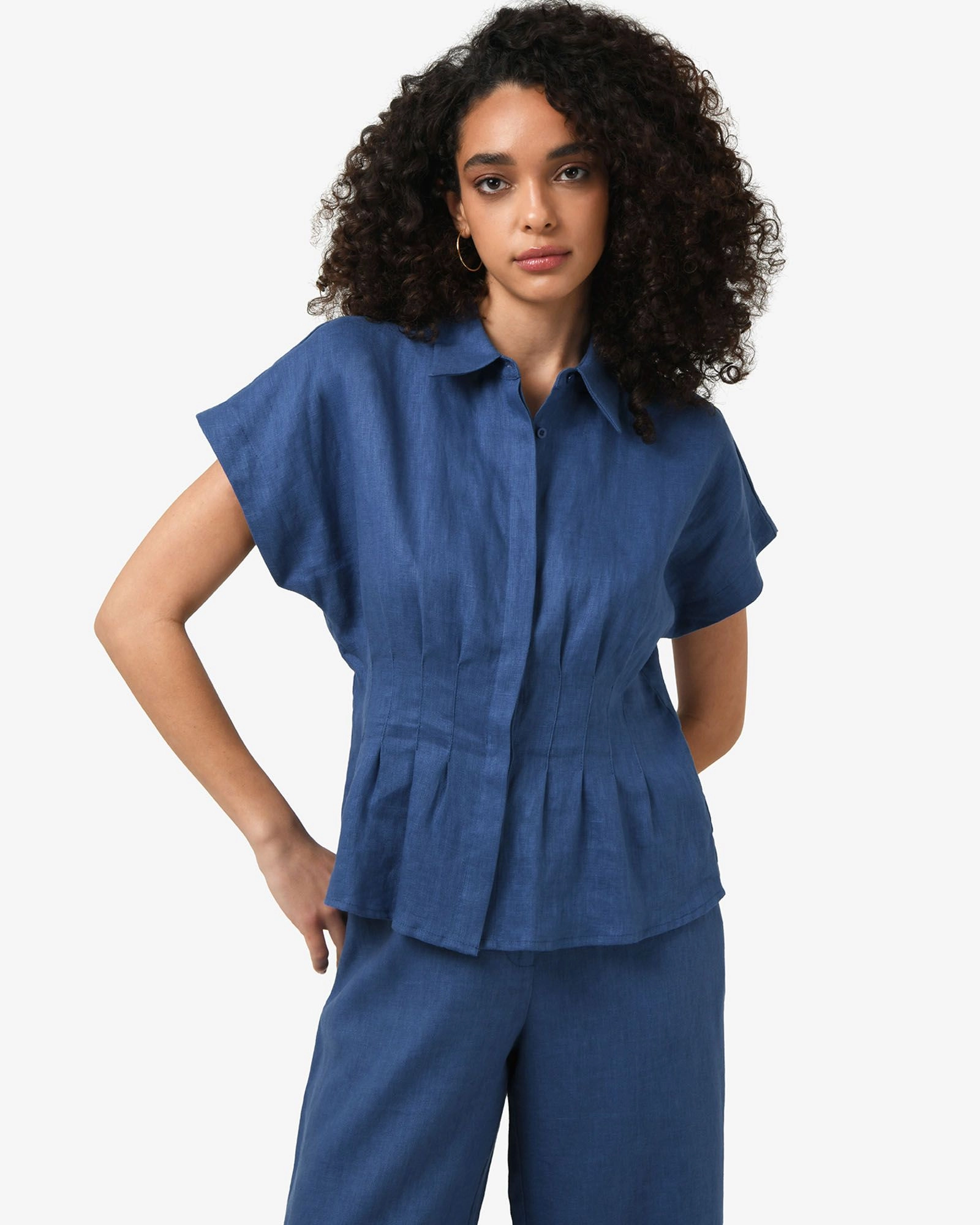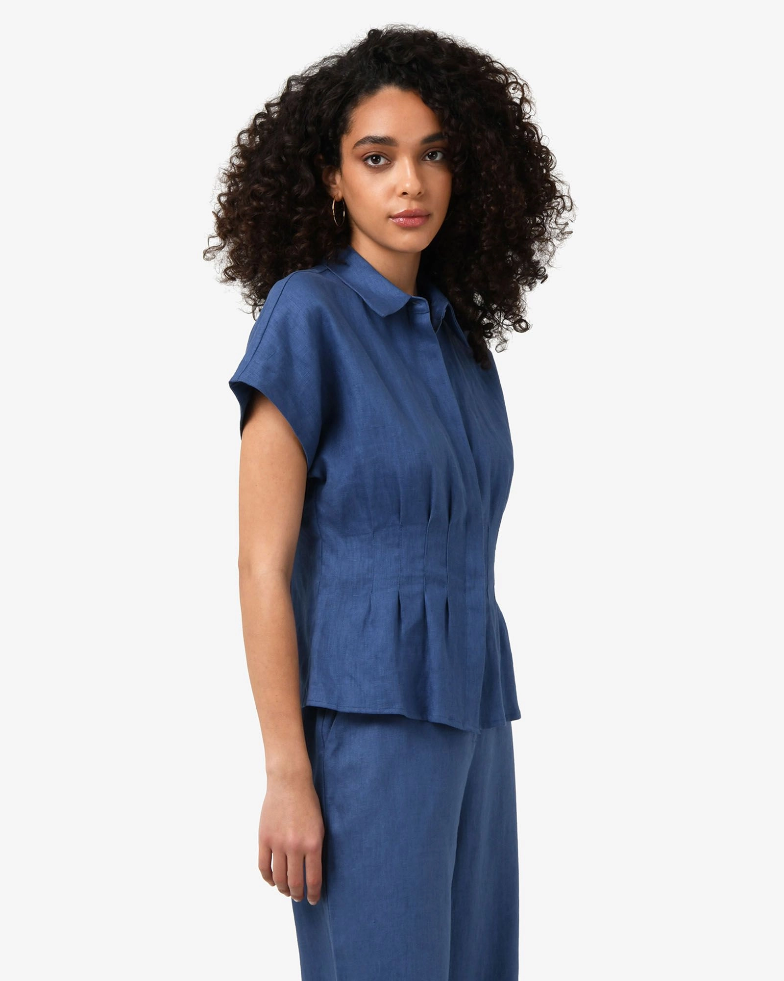 The Ami Linen Pleated Tuck Shirt features a classic collar with short cap sleeves. Made from 100% Linen, it has a covered button placket and a pleated waist. Pair it with the matching Ami Wide Leg Linen Pants or wear it with casual pants and shorts to complete your look.
