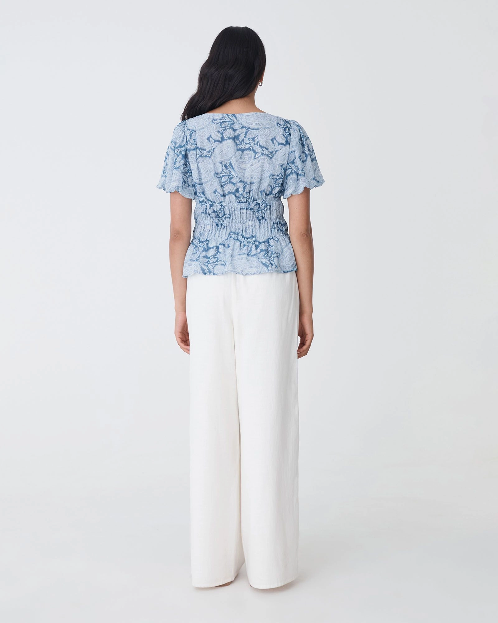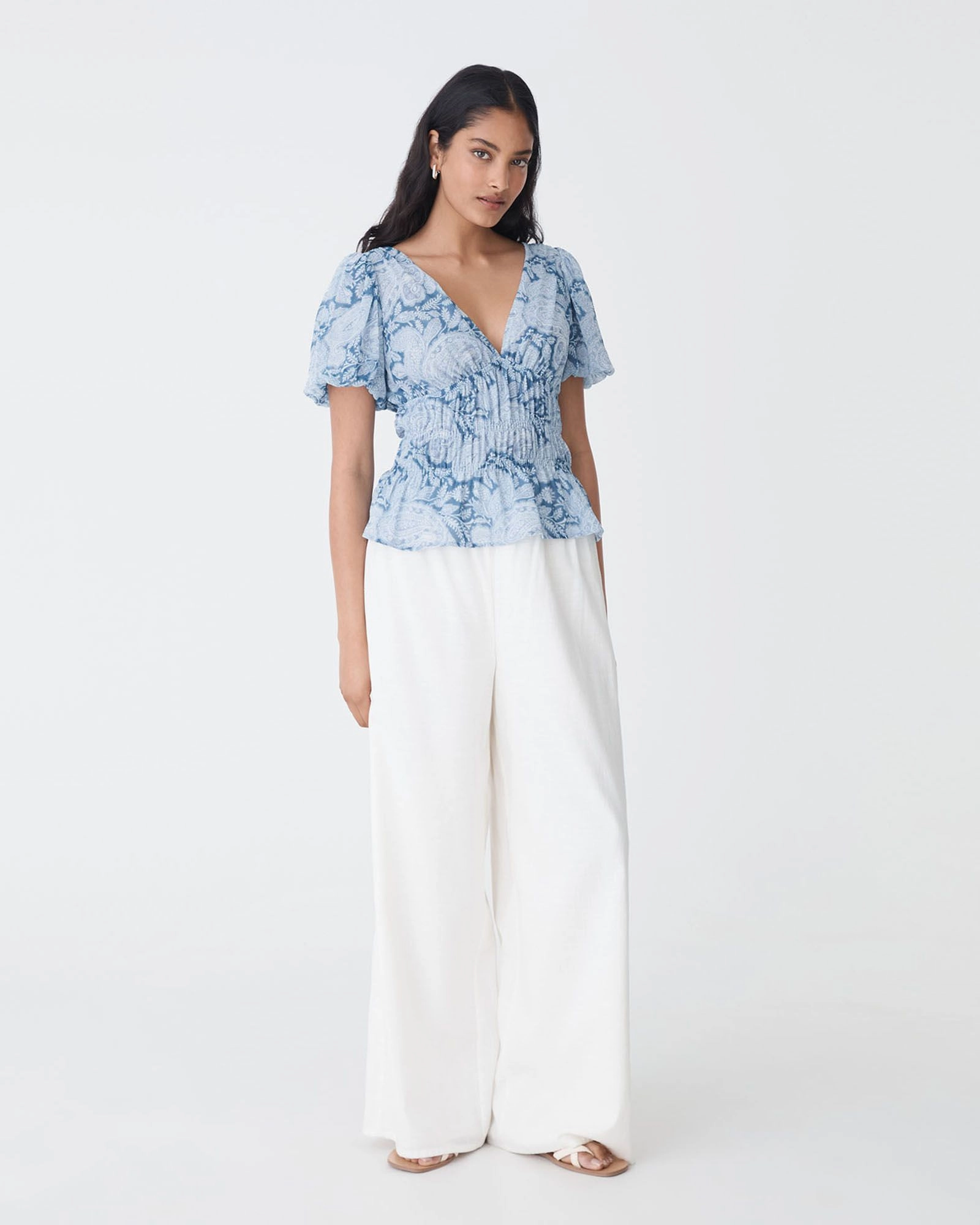 The Angie Elastic Waist Top is effortlessly flattering with a touch of bohemian charm, designed to define the waist while staying light and comfortable. Featuring a clean V-neckline, short puff sleeves, and a shirred waist. Finished with a classic blue paisley print and lightweight fabric that is perfect for your casual or relaxed gatherings.