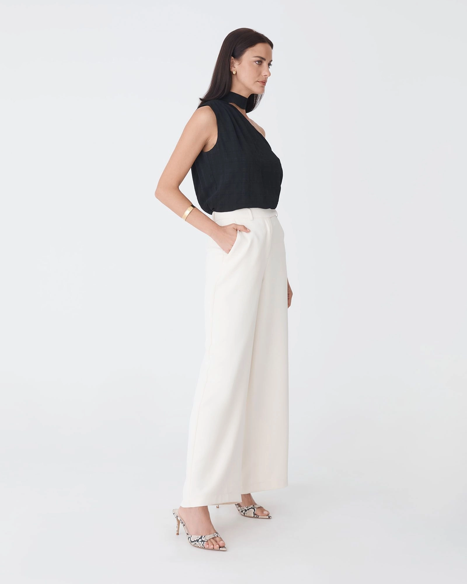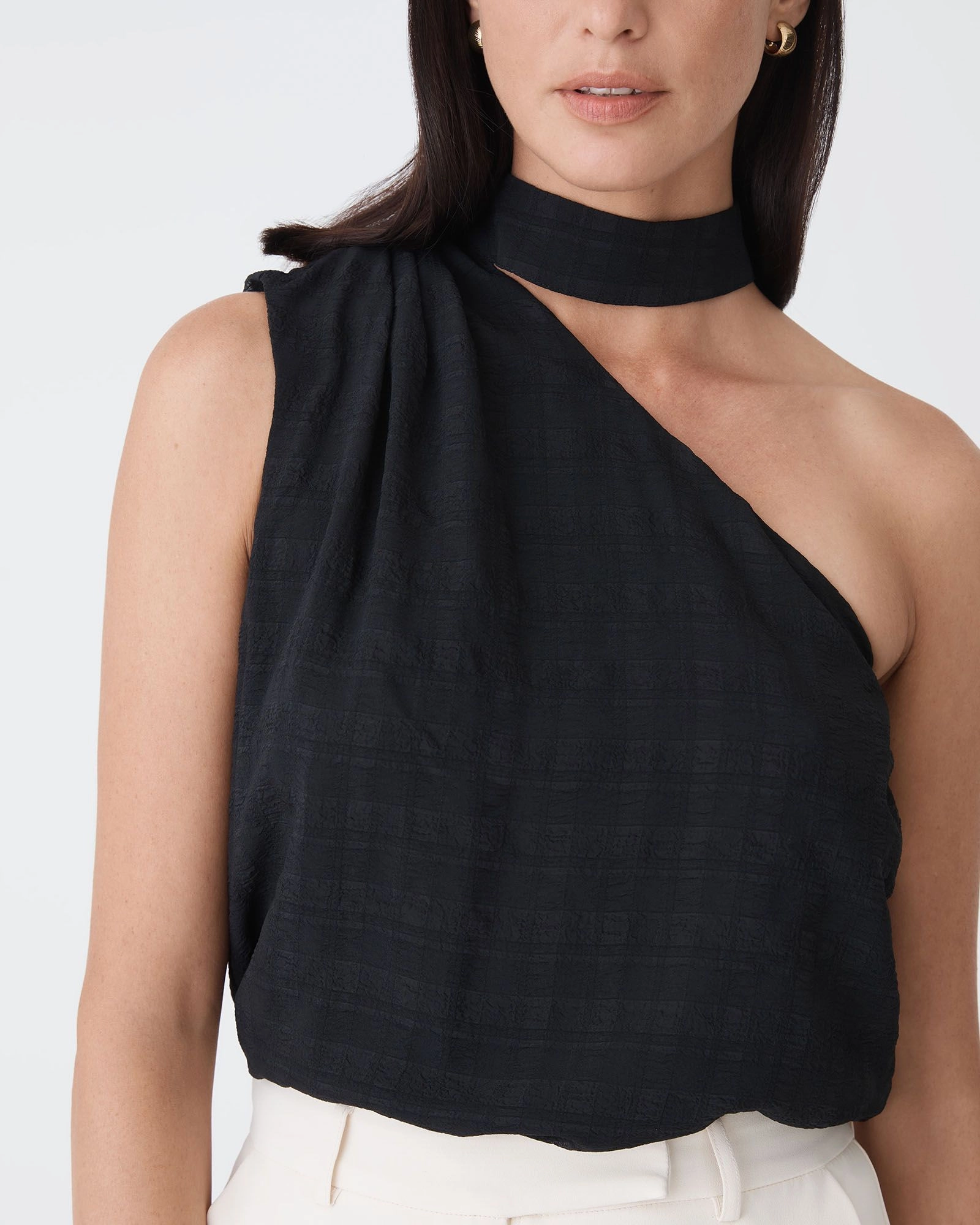 The Ashlyn One Shoulder Top creates an effortlessly, elegant silhouette with its one-shoulder design, neck collar, and soft draping along the covered shoulder. The subtle plaid pattern adds a striking touch. Dress it up with a skirt or pair it with wide leg pants for a chic, elevated everyday look.