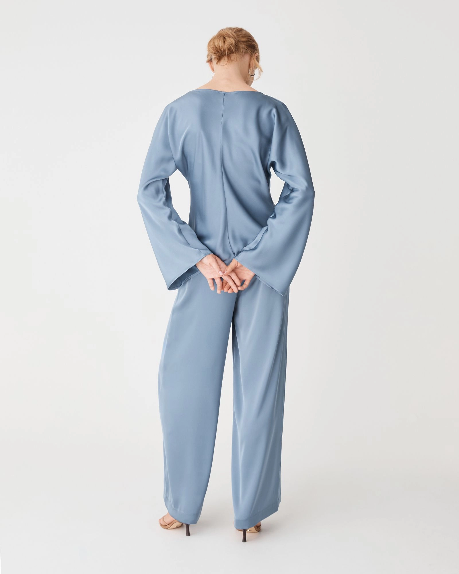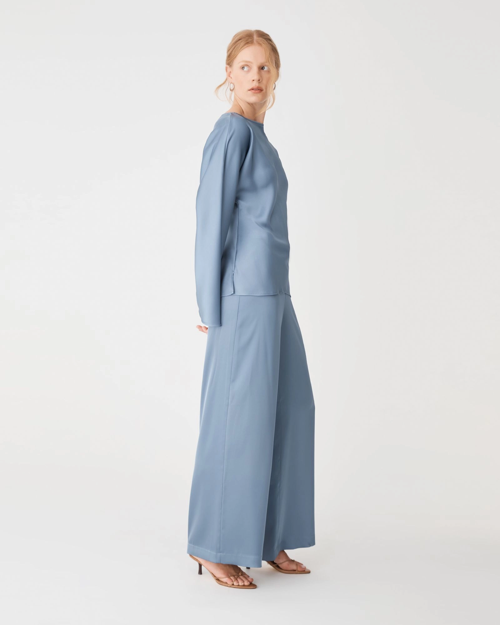 Fluid and elegant, the Asma Satin Bias Cut Top offers a chic, modest silhouette with a relaxed, hip-length fit. Featuring a boat neckline, long flared sleeves and side hem splits for subtle detail. Designed in a lustrous satin, it pairs with the Asma Satin Wide Leg Pants for a matching set.