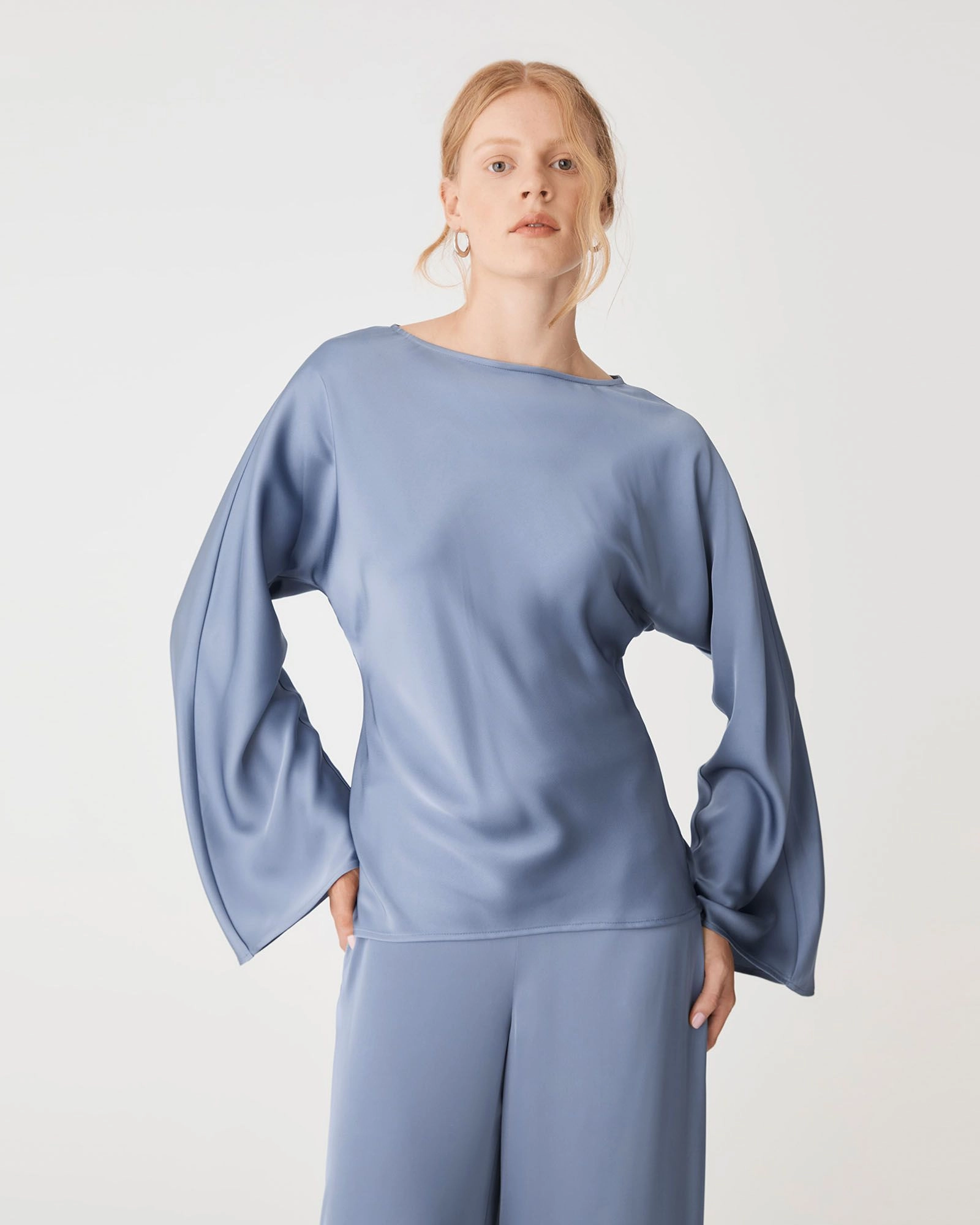 Fluid and elegant, the Asma Satin Bias Cut Top offers a chic, modest silhouette with a relaxed, hip-length fit. Featuring a boat neckline, long flared sleeves and side hem splits for subtle detail. Designed in a lustrous satin, it pairs with the Asma Satin Wide Leg Pants for a matching set.