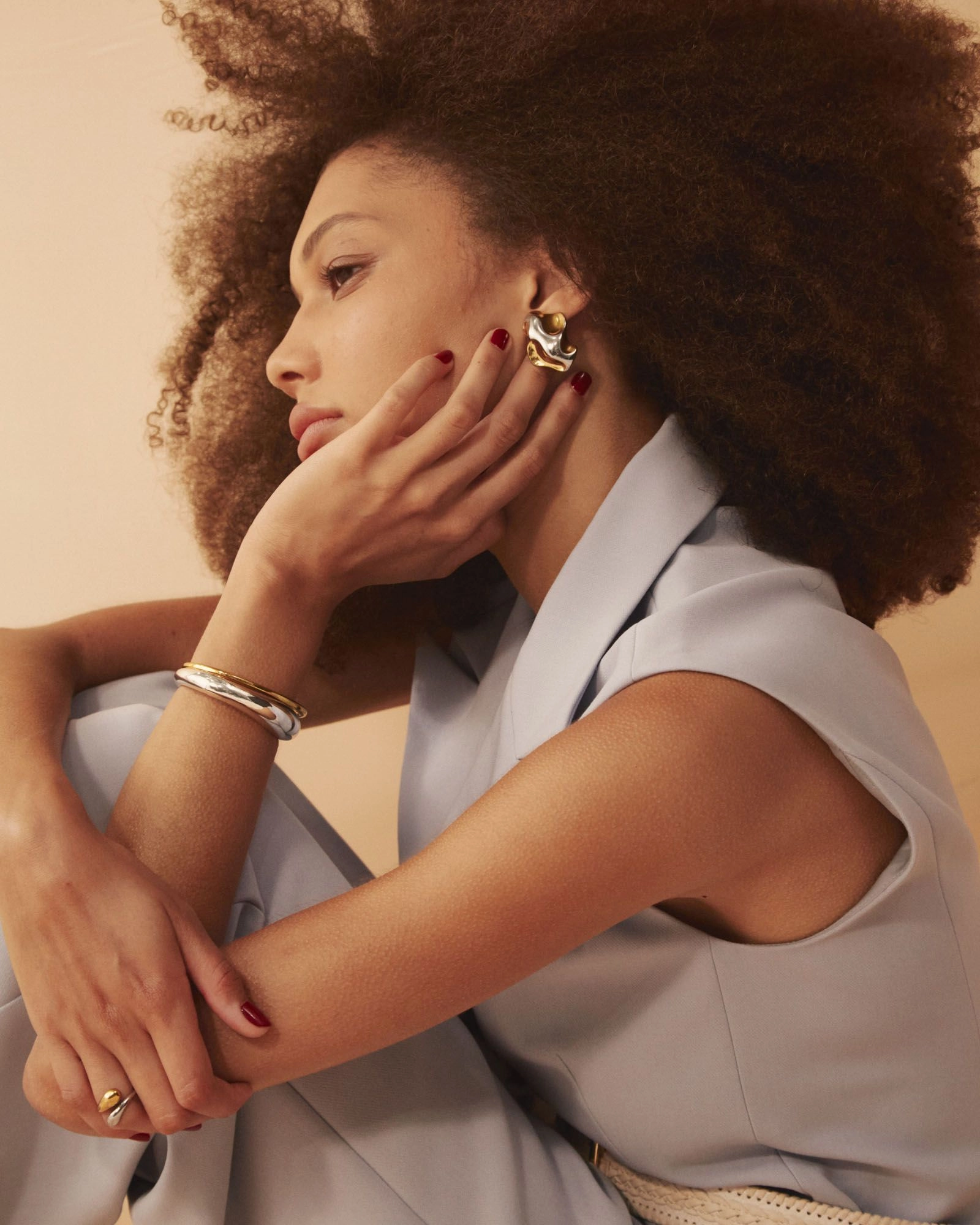 The Aurora Statement Earrings features an organic wavy silhouette in a polished two-tone silver and gold finish. Expertly buffed for a high-shine, mirror-like effect, these oversized yet lightweight earrings add fluid sculptural elegance to both casual and formal ensembles.