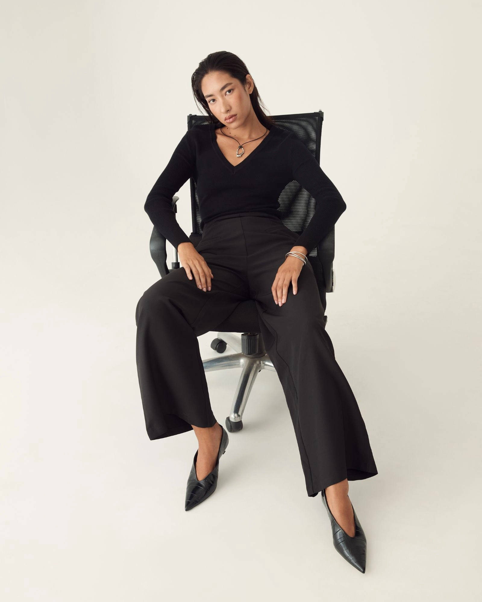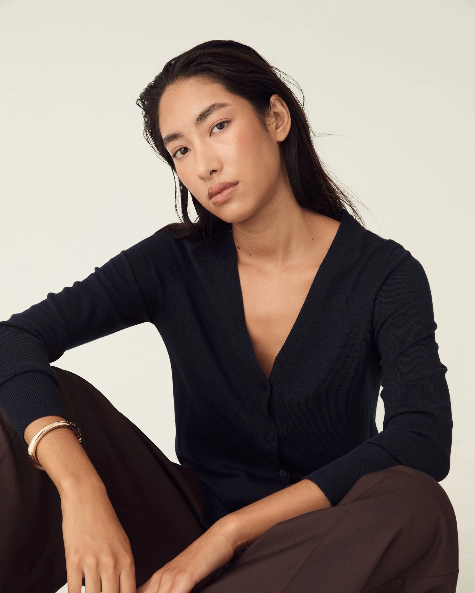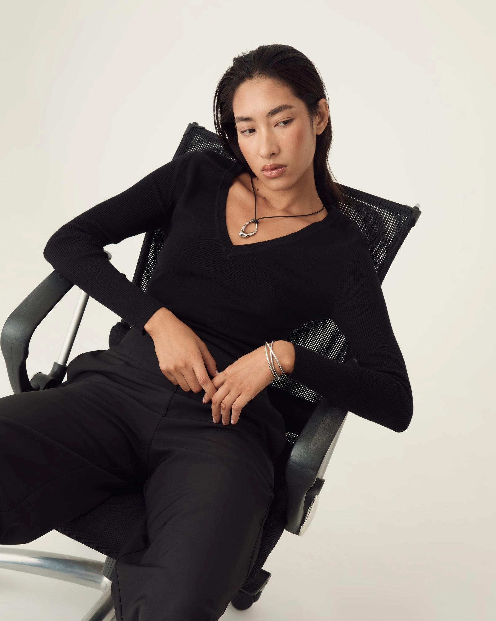 This knit is cut to contour. A sharp V-neckline, ribbed sleeve detailing, and a close fit that holds its shape without holding you back. Mid-weight with stretch, it moves with you and sits just right.