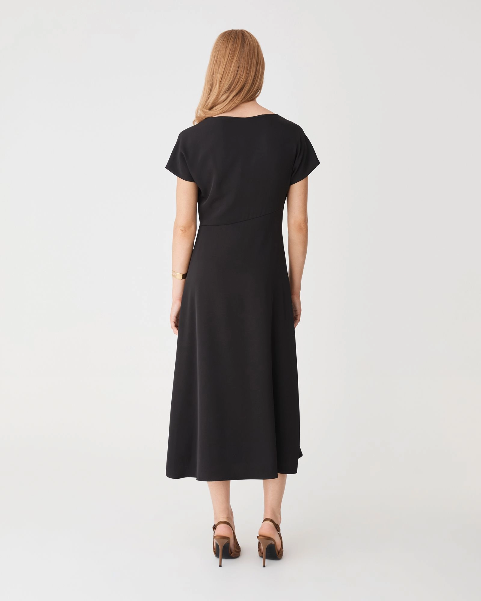 The Bianca Side Pleat Midi Dress features a sleek, contemporary silhouette with subtle detailing. Designed with a round neckline and cap sleeves, it features side pleats with an asymmetric seam. Cut to a midi length and finished with a slight stretch, it’s a polished option for both office and after hours.