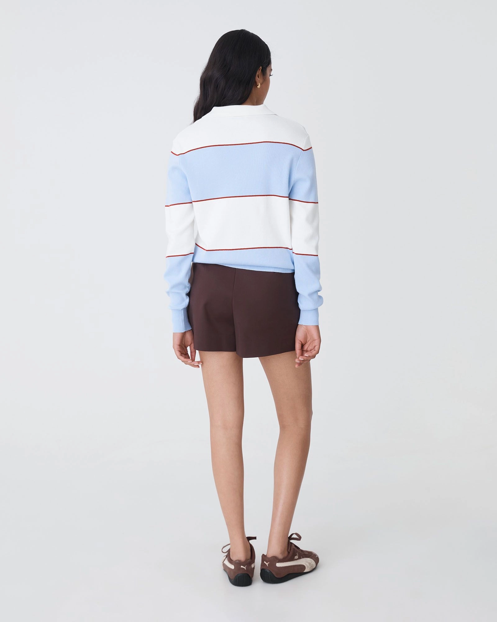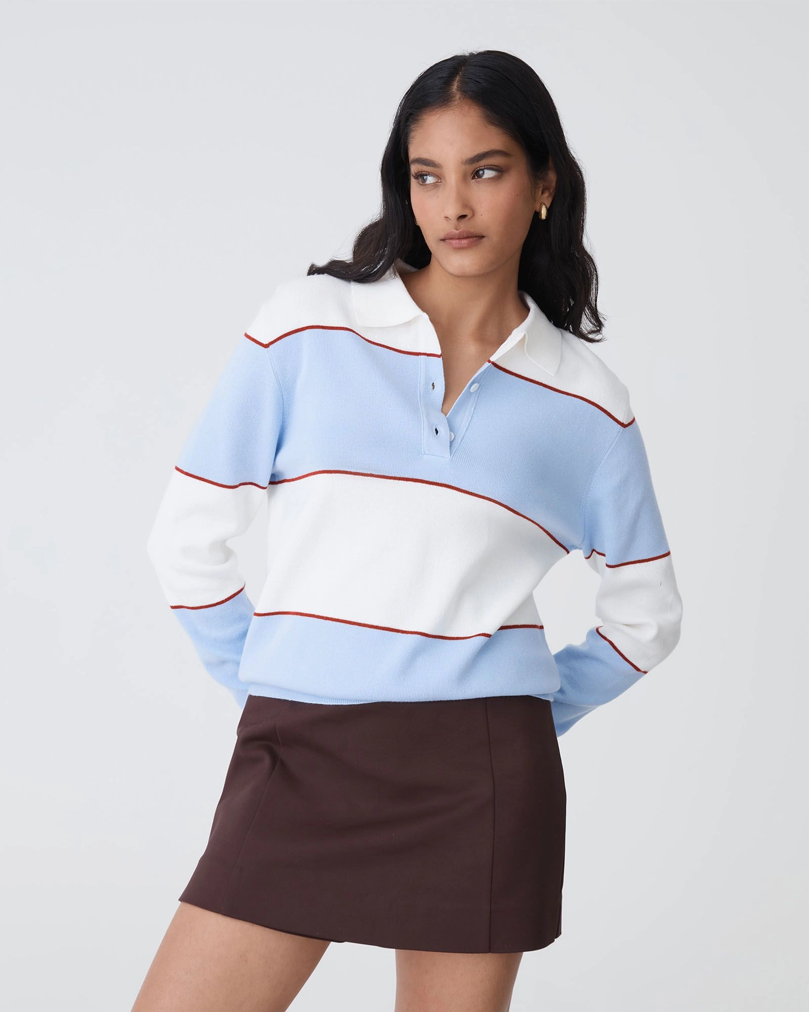 Add a timeless preppy touch to your wardrobe with the Brenda Stripe Collared Sweater. Featuring a collar, button-front neckline, and bold tri-tone striped pattern, it’s made from a soft, fine-gauge knit for all-day comfort. The relaxed fit can be worn loosely with shorts, mini skirts or denim.