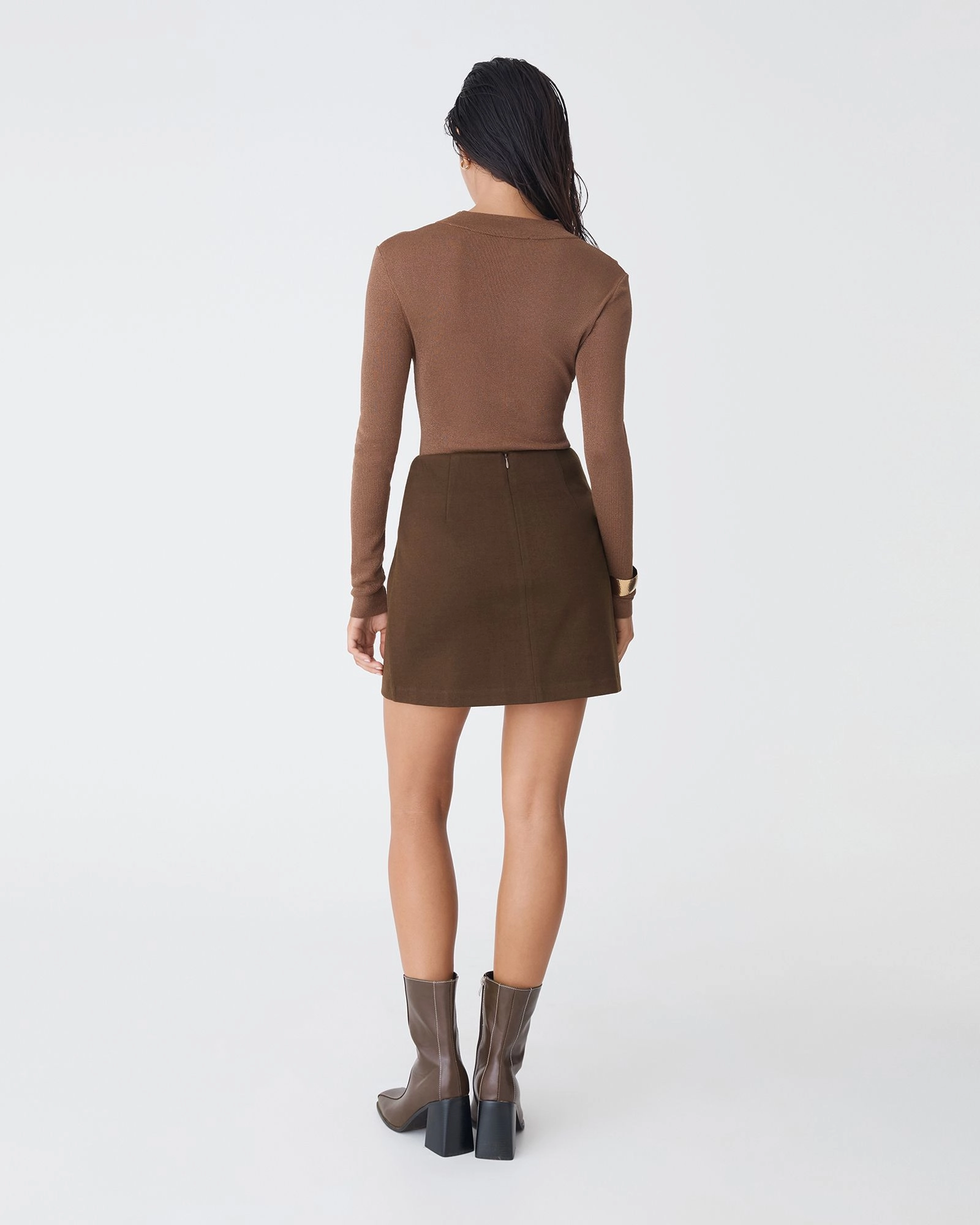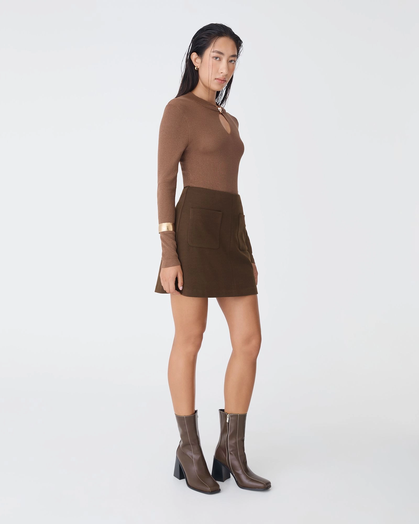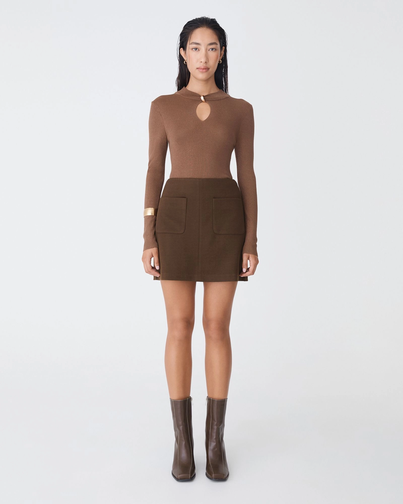 The Bridget Mini Skirt is slightly textured with a soft finish. It features front patch pockets with a centre seam for a clean silhouette. Fully lined for comfort, it’s an easy piece to style from day to night. Pair with knitwear or fitted tops for a balanced, cohesive look.