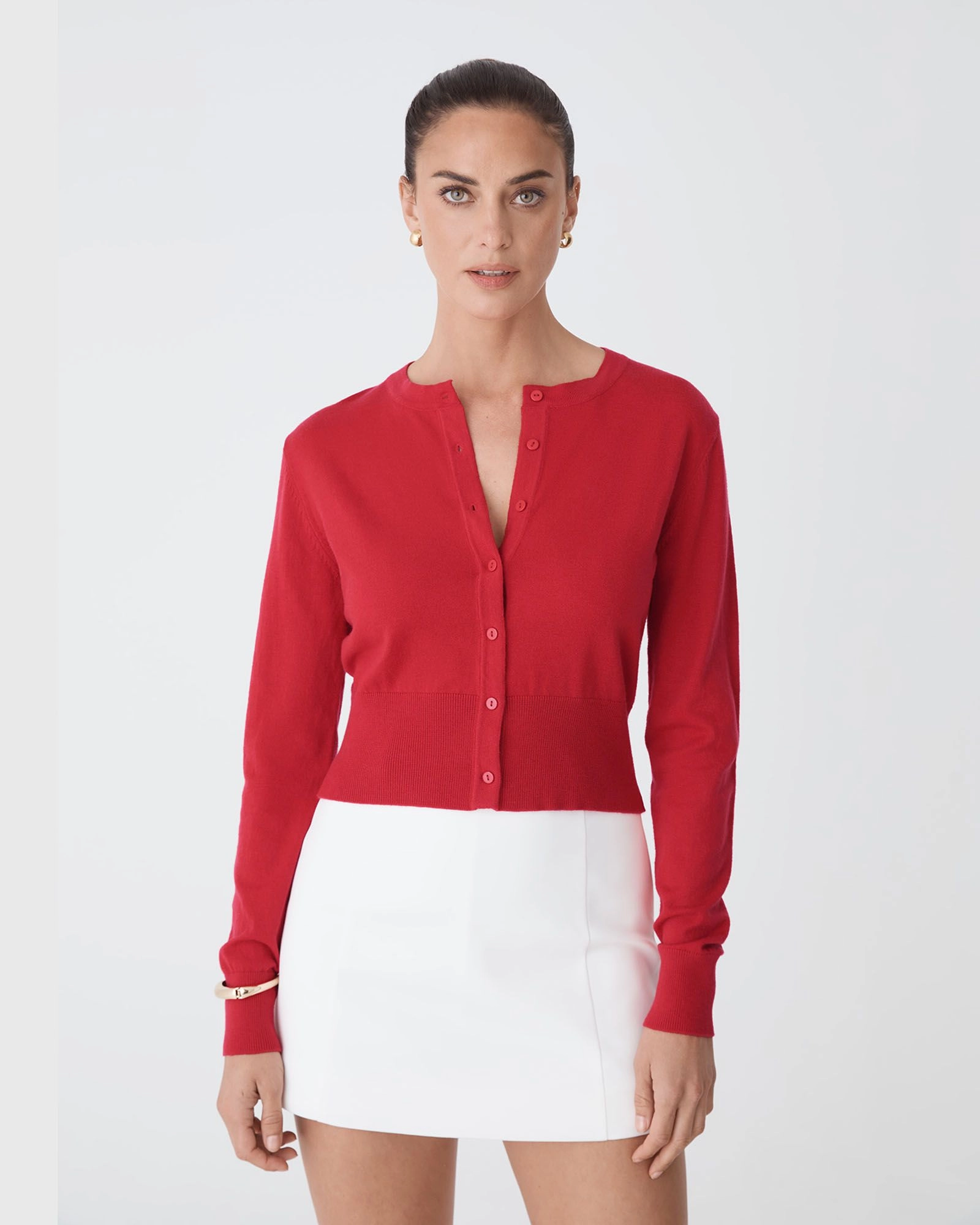 Introducing the Cassie Crew Neck Cardigan an essential knitwear piece. Its cropped, slim-fit silhouette and deep ribbed hem create a minimal piece. Made from soft, fine-gauge knit, it offers lightweight warmth and a clean finish. Pair it with a skirt or trousers for a sleek office look.
