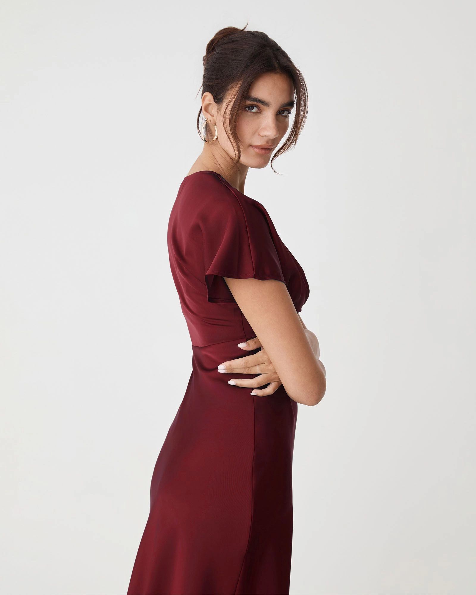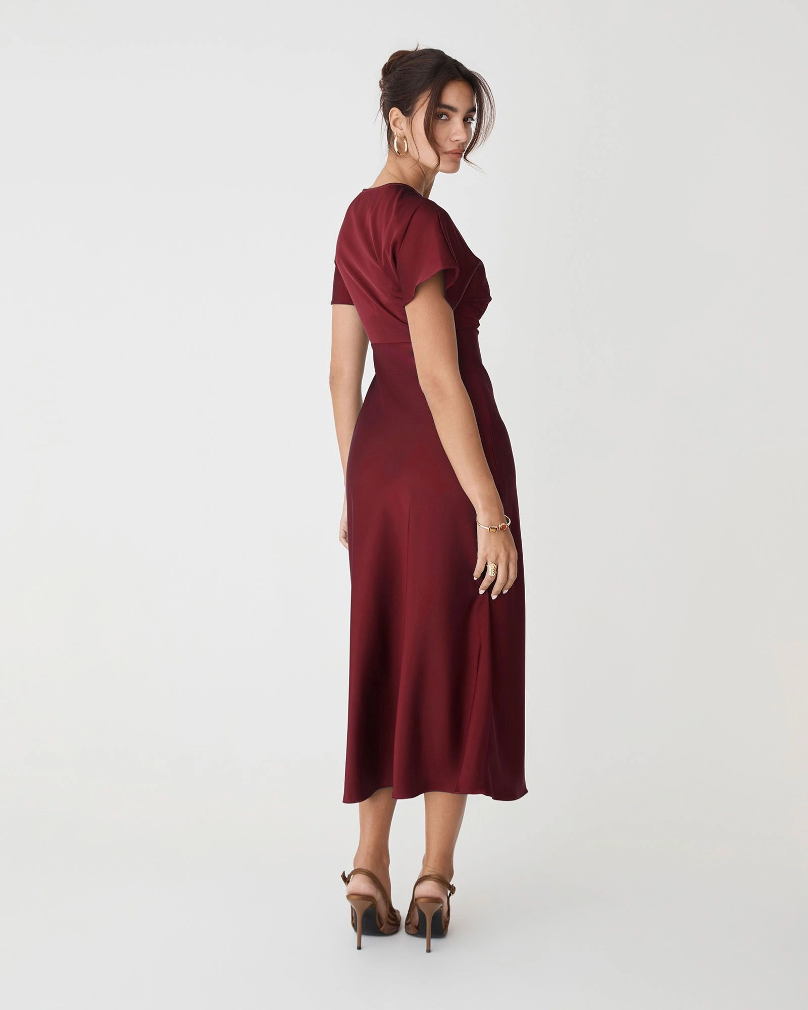 The Catalina V-Neck Satin Dress exudes elegance with its soft satin finish and flattering silhouette. Featuring a V-neckline, short batwing sleeves and a fitted waist, it falls to graceful midi length with a bias-cut skirt. Finished with an invisible side zipper closure, this dress offers a refined look for your special occasions.