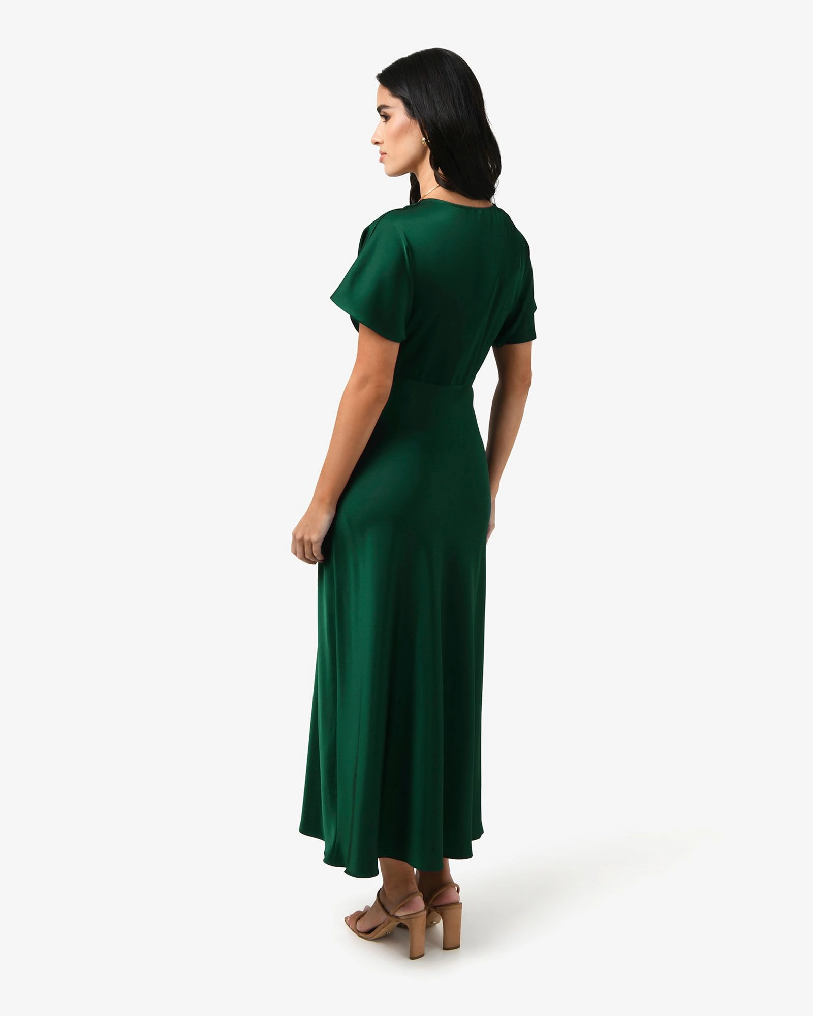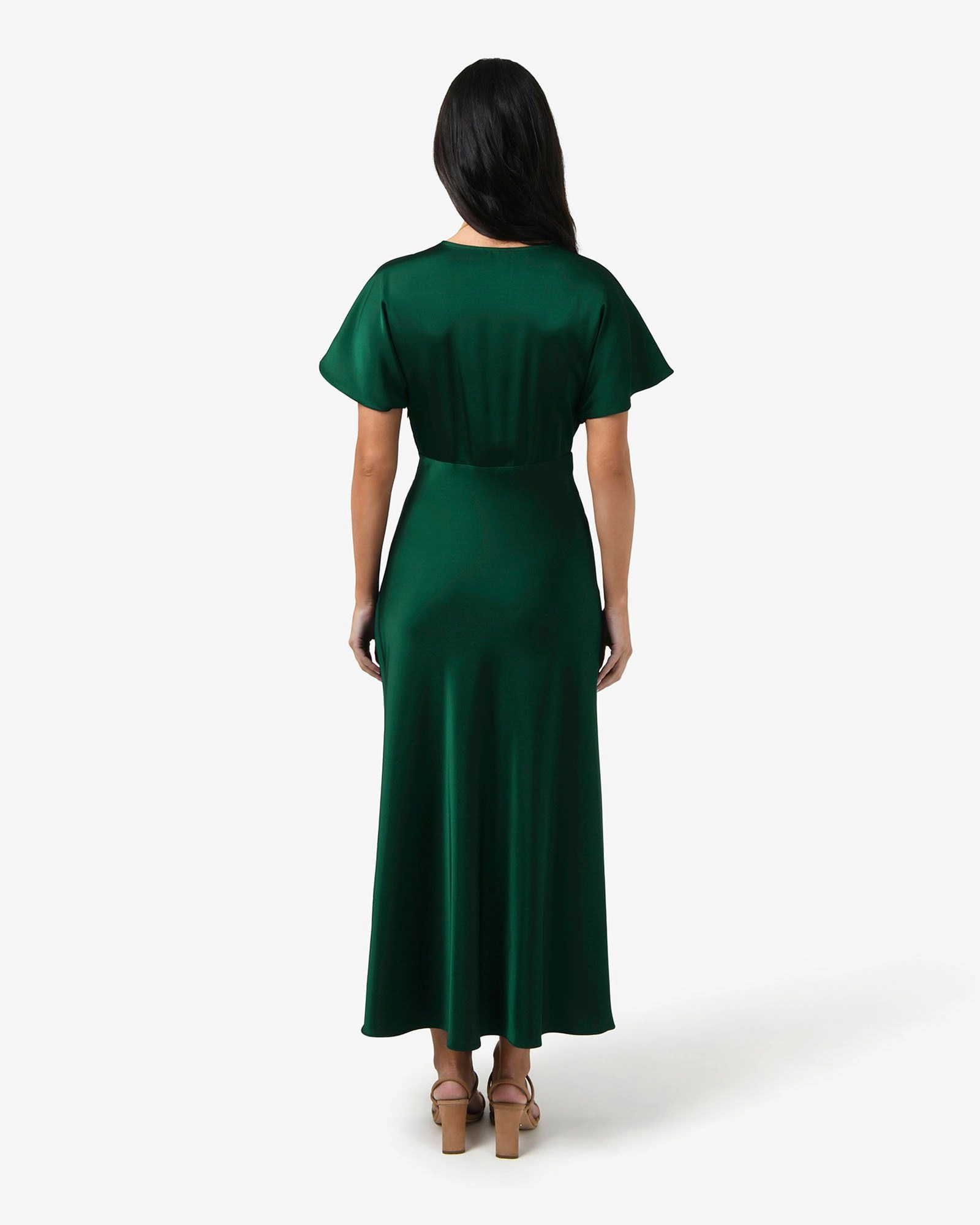 The Catalina V-Neck Satin Dress exudes elegance with its soft satin finish and flattering silhouette. Featuring a V-neckline, short batwing sleeves and a fitted waist, it falls to graceful midi length with a bias-cut skirt. Finished with an invisible side zipper closure, this dress offers a refined look for your special occasions.