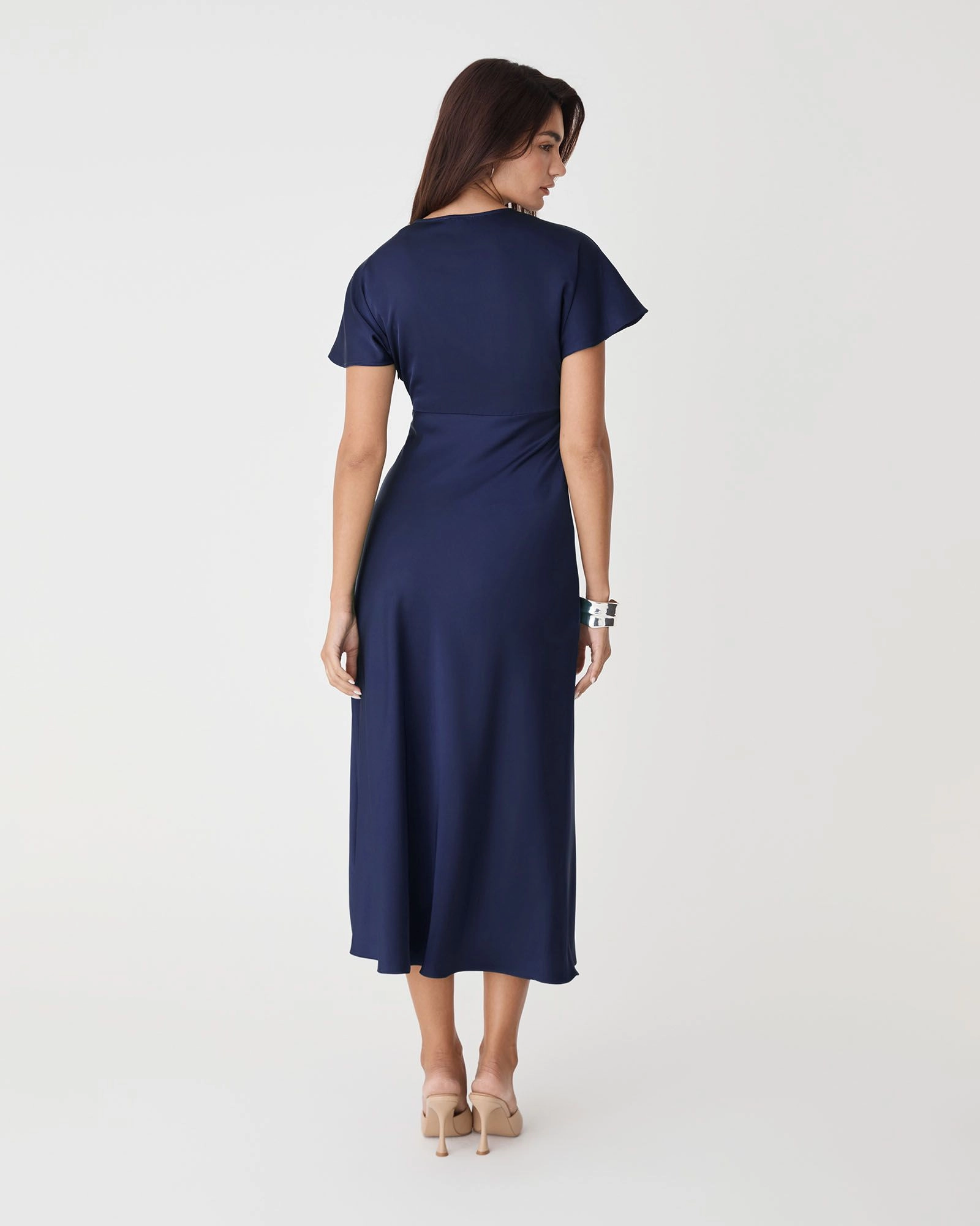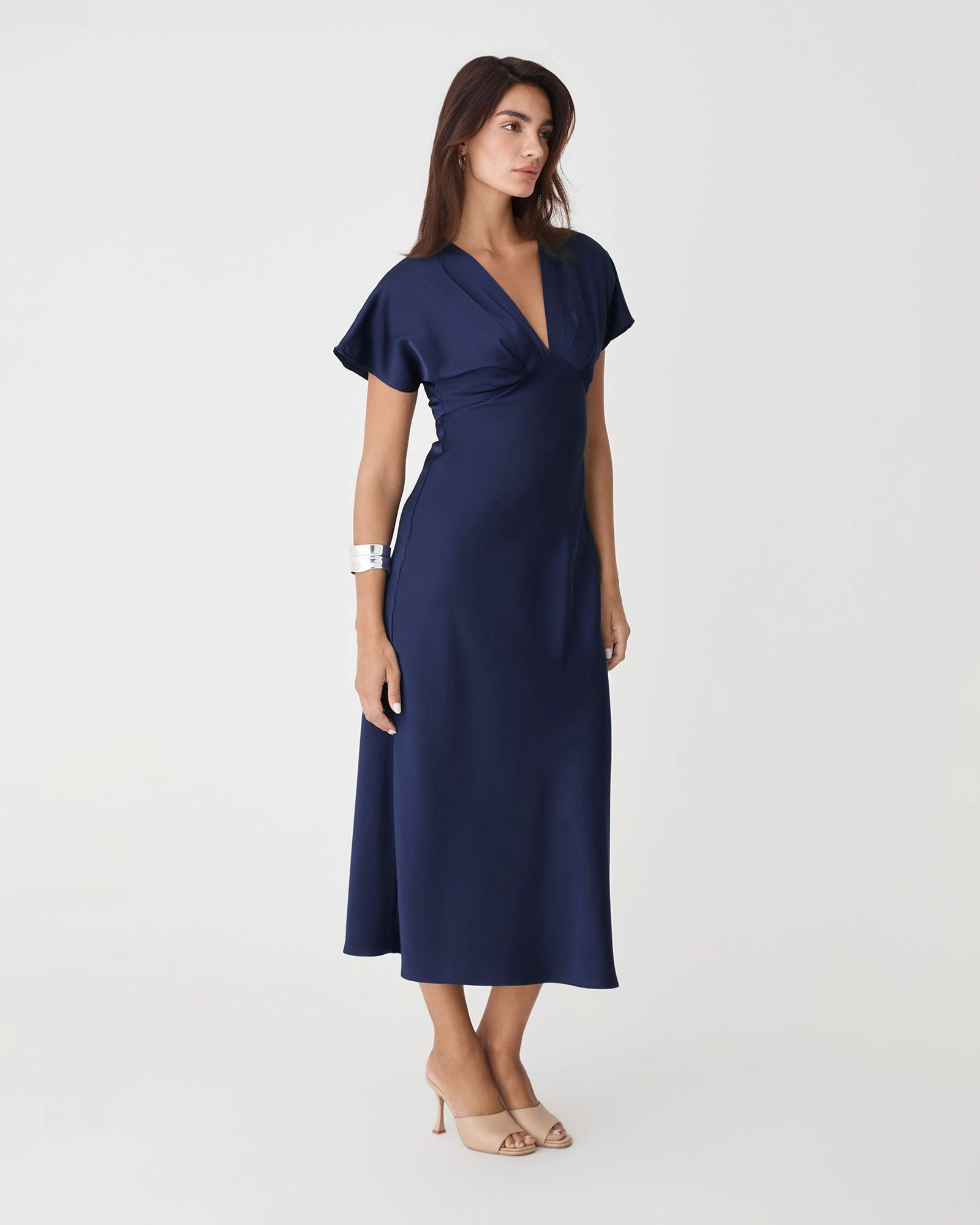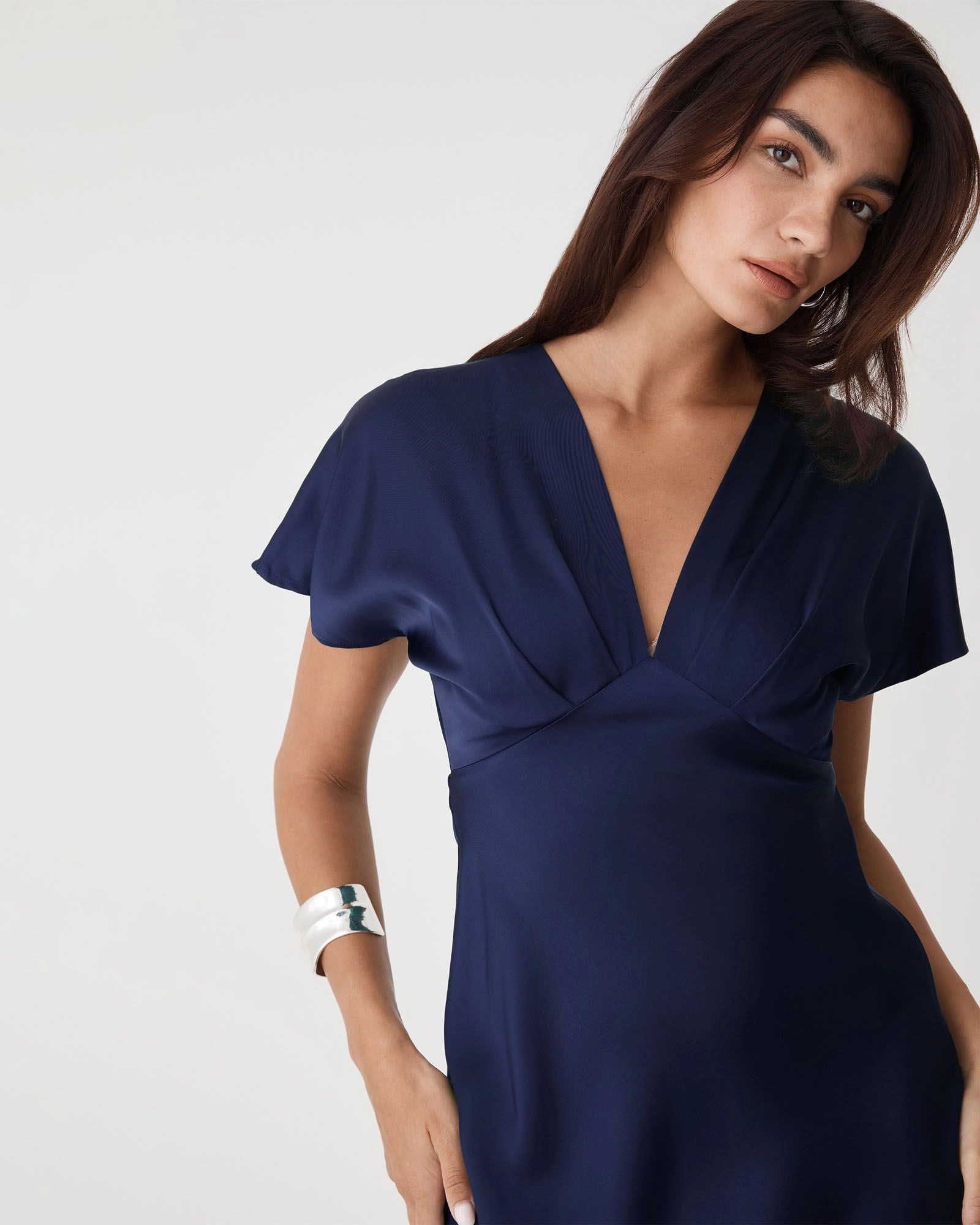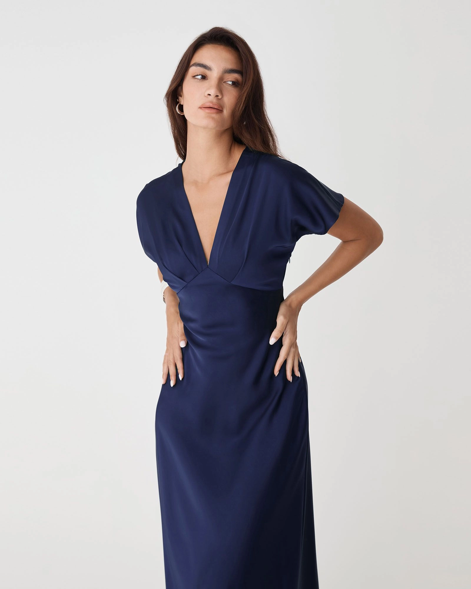 The Catalina V-Neck Satin Dress exudes elegance with its soft satin finish and flattering silhouette. Featuring a V-neckline, short batwing sleeves and a fitted waist, it falls to graceful midi length with a bias-cut skirt. Finished with an invisible side zipper closure, this dress offers a refined look for your special occasions.