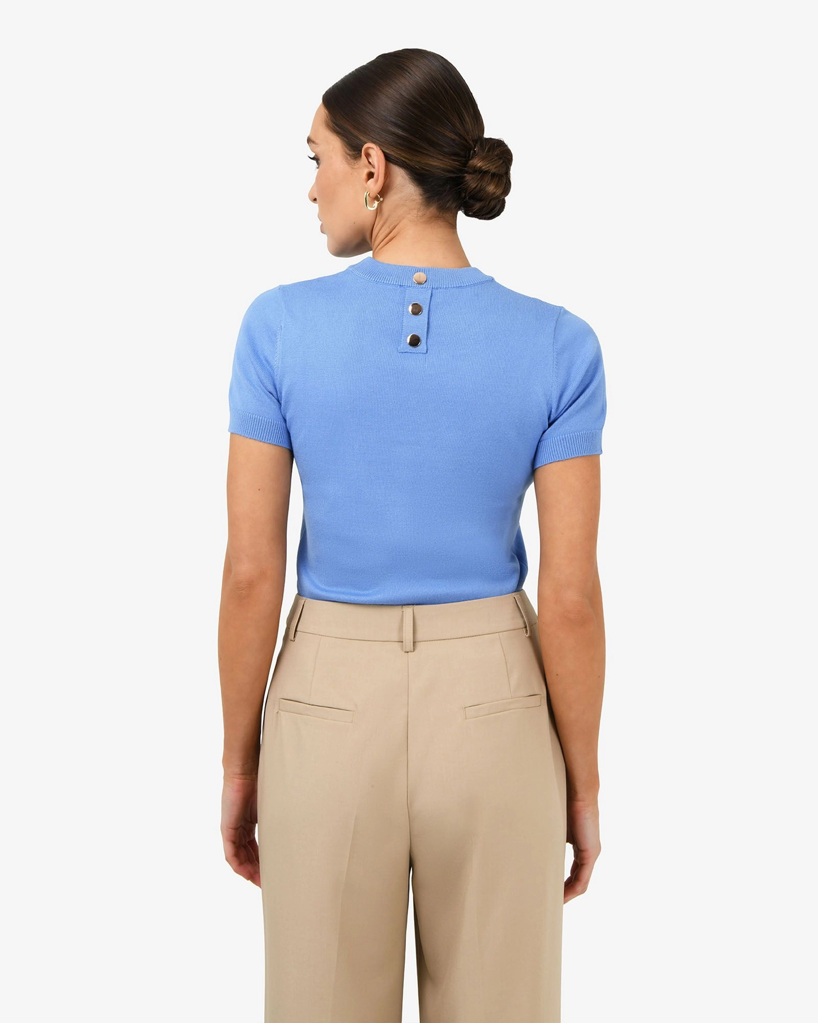 - Back neck gold-tone button detail