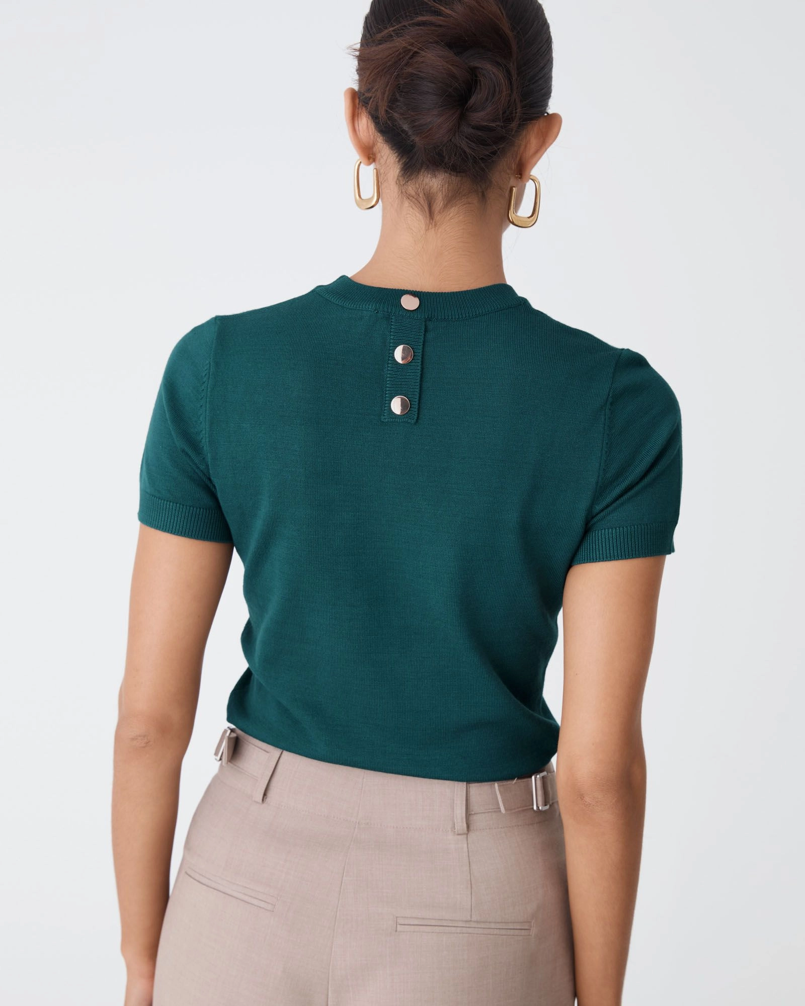- Back neck gold-tone button detail