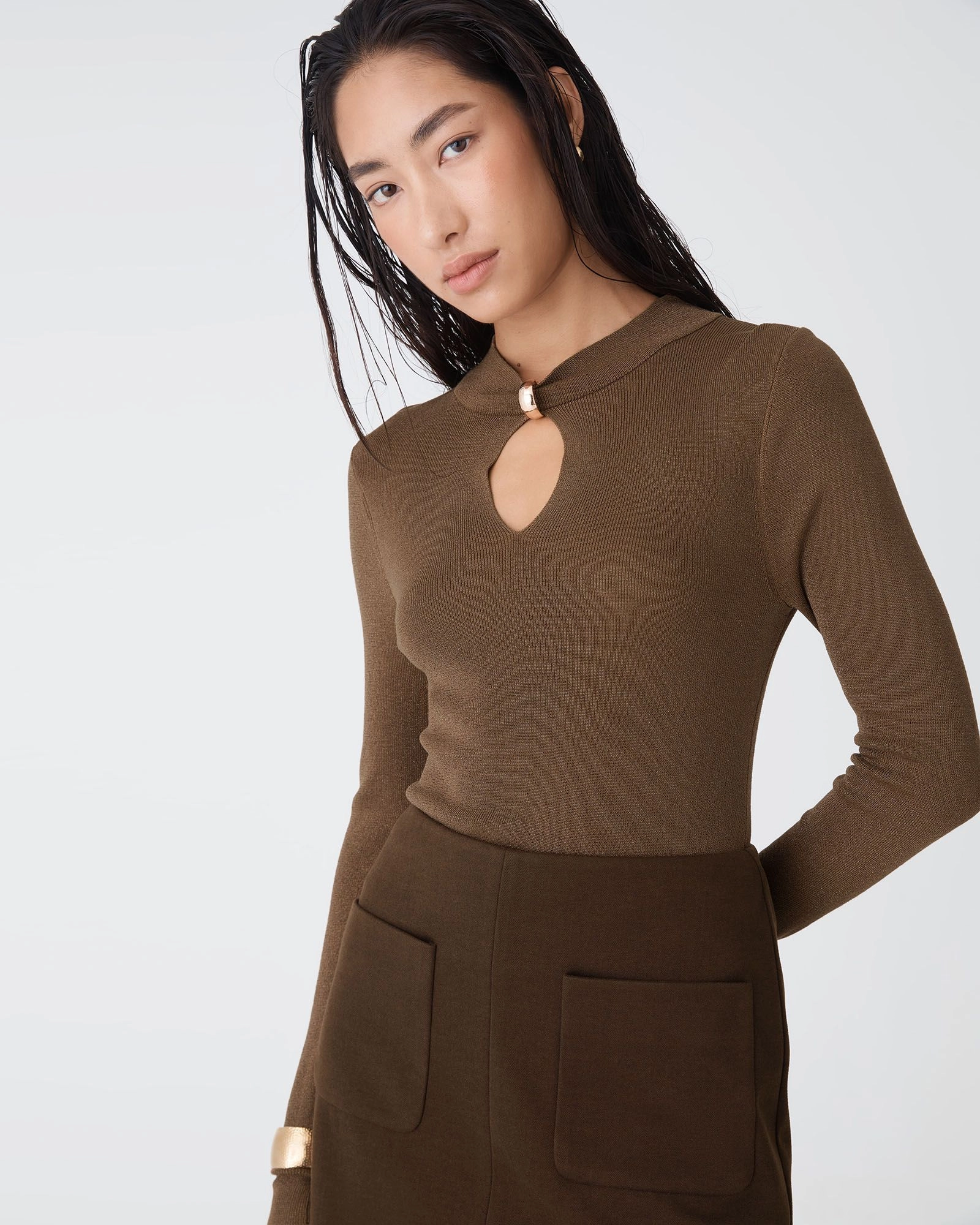 Elevate your look with the Ciara Keyhole Lurex Knit Top. Made from soft lurex knit with a subtle metallic finish, this long-sleeve style features a front keyhole with a gold ring detail to create a refined focal point. Finished in a fitted silhouette, it is a flattering piece to easily style with skirts and pants.
