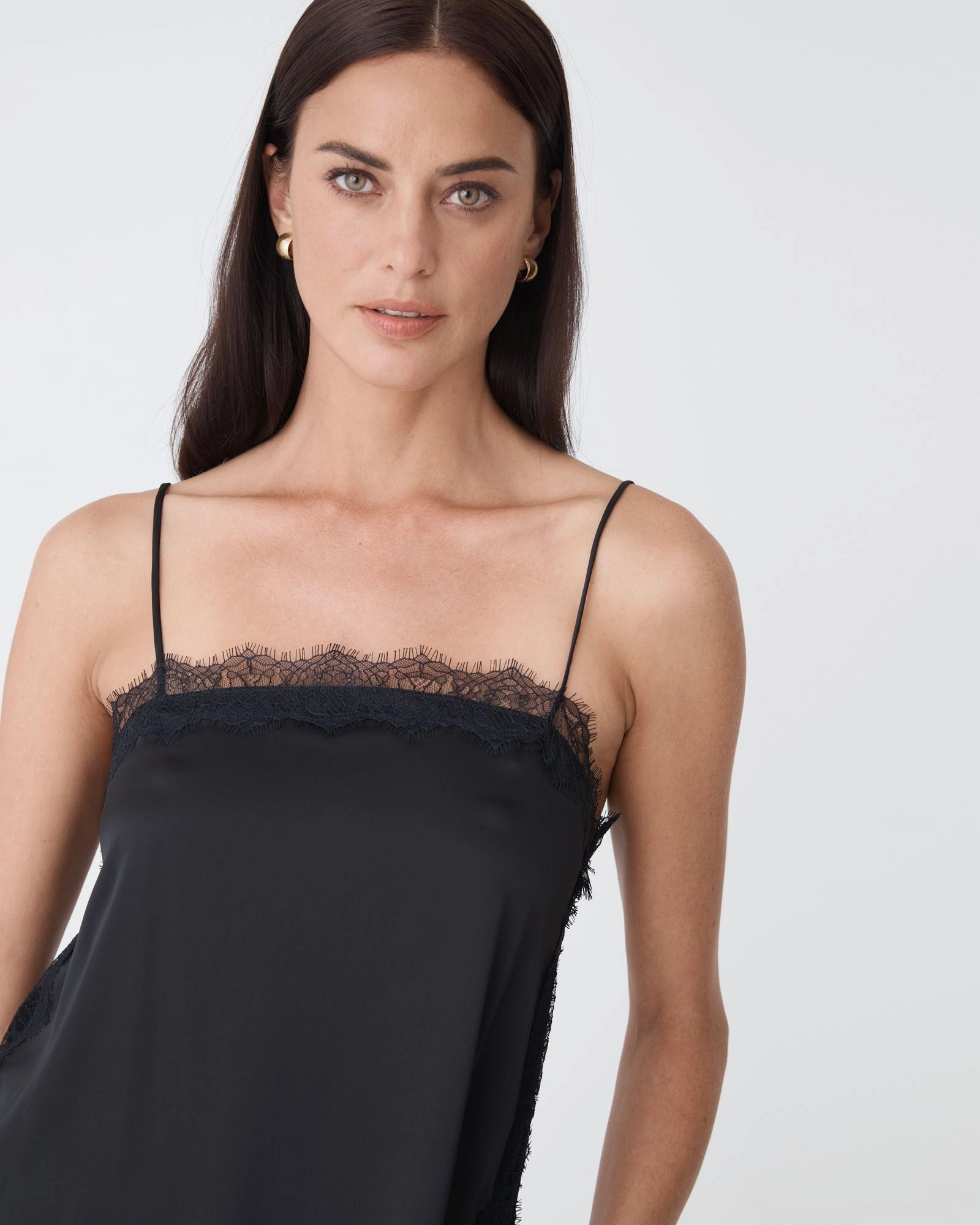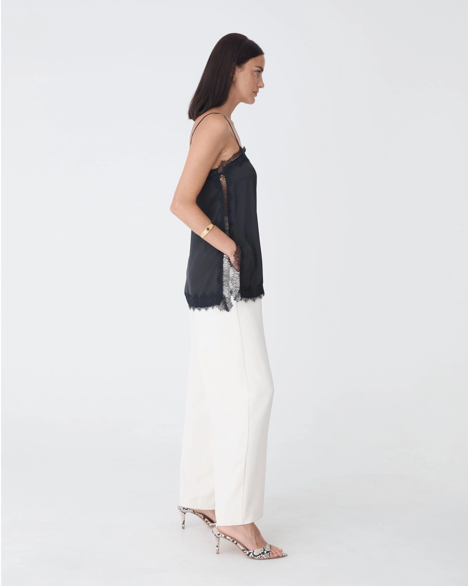 The Cleo Lace Trim Satin Camisole is a refined essential with a soft, fluid drape. Made from lightweight satin, it features a square neckline, fine spaghetti straps, and delicate lace trimming along the neckline, hem, and side. The relaxed fit and subtle side vents make it comfortable and easy to style, whether worn with shorts, pants or skirts.