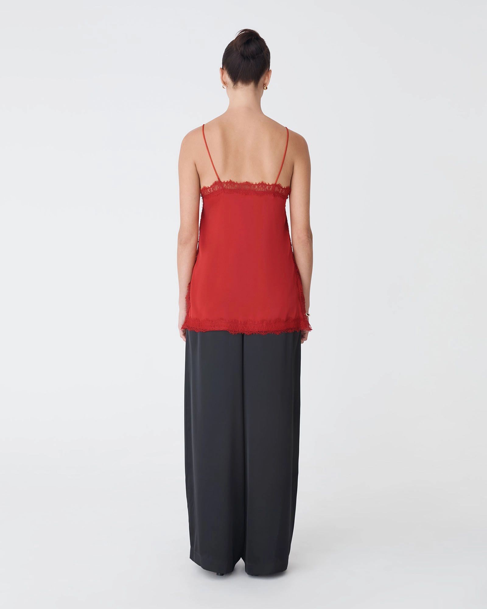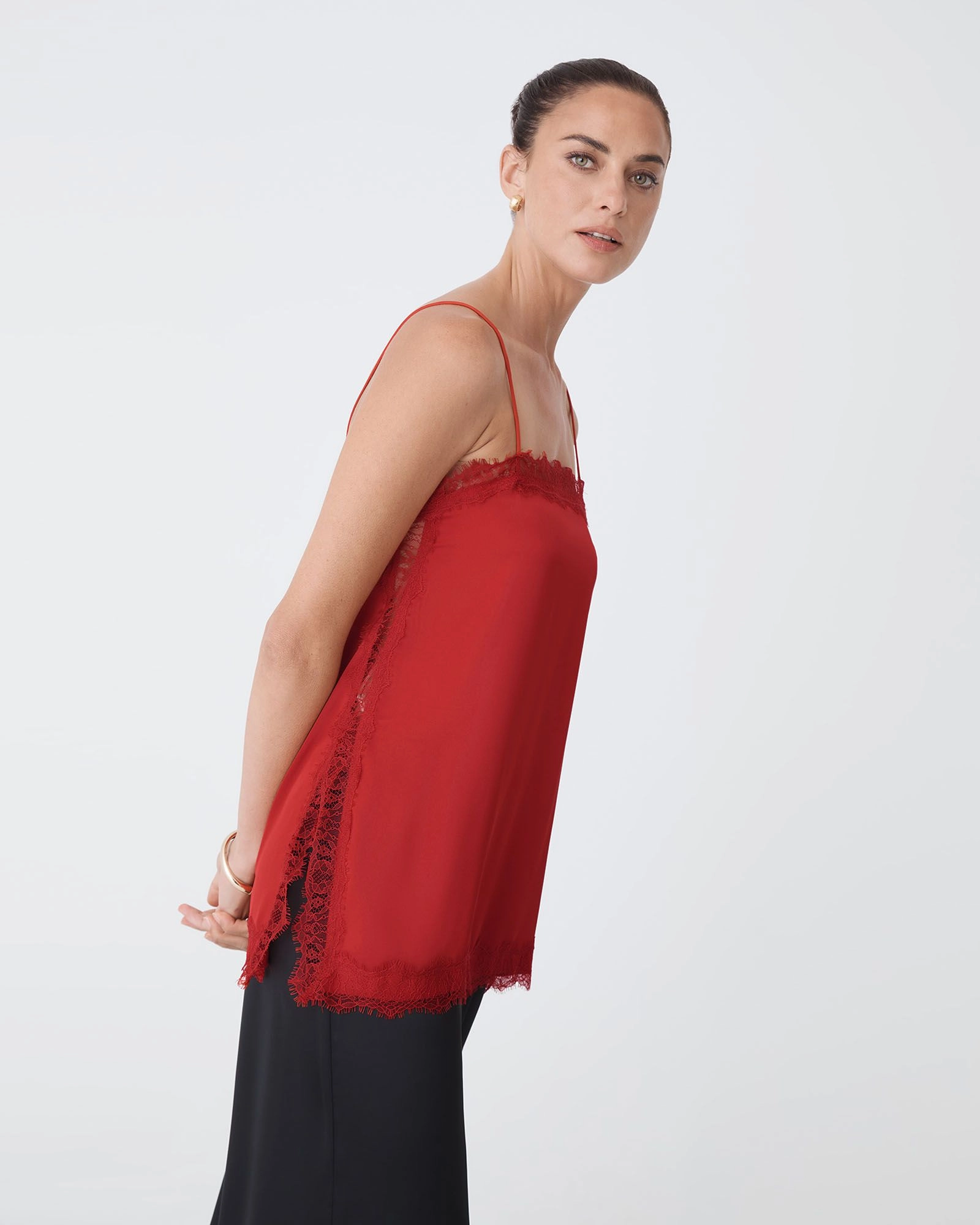 The Cleo Lace Trim Satin Camisole is a refined essential with a soft, fluid drape. Made from lightweight satin, it features a square neckline, fine spaghetti straps, and delicate lace trimming along the neckline, hem, and side. The relaxed fit and subtle side vents make it comfortable and easy to style, whether worn with shorts, pants or skirts.