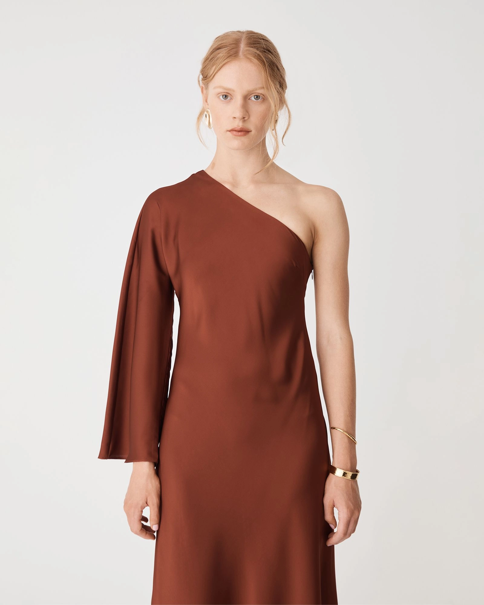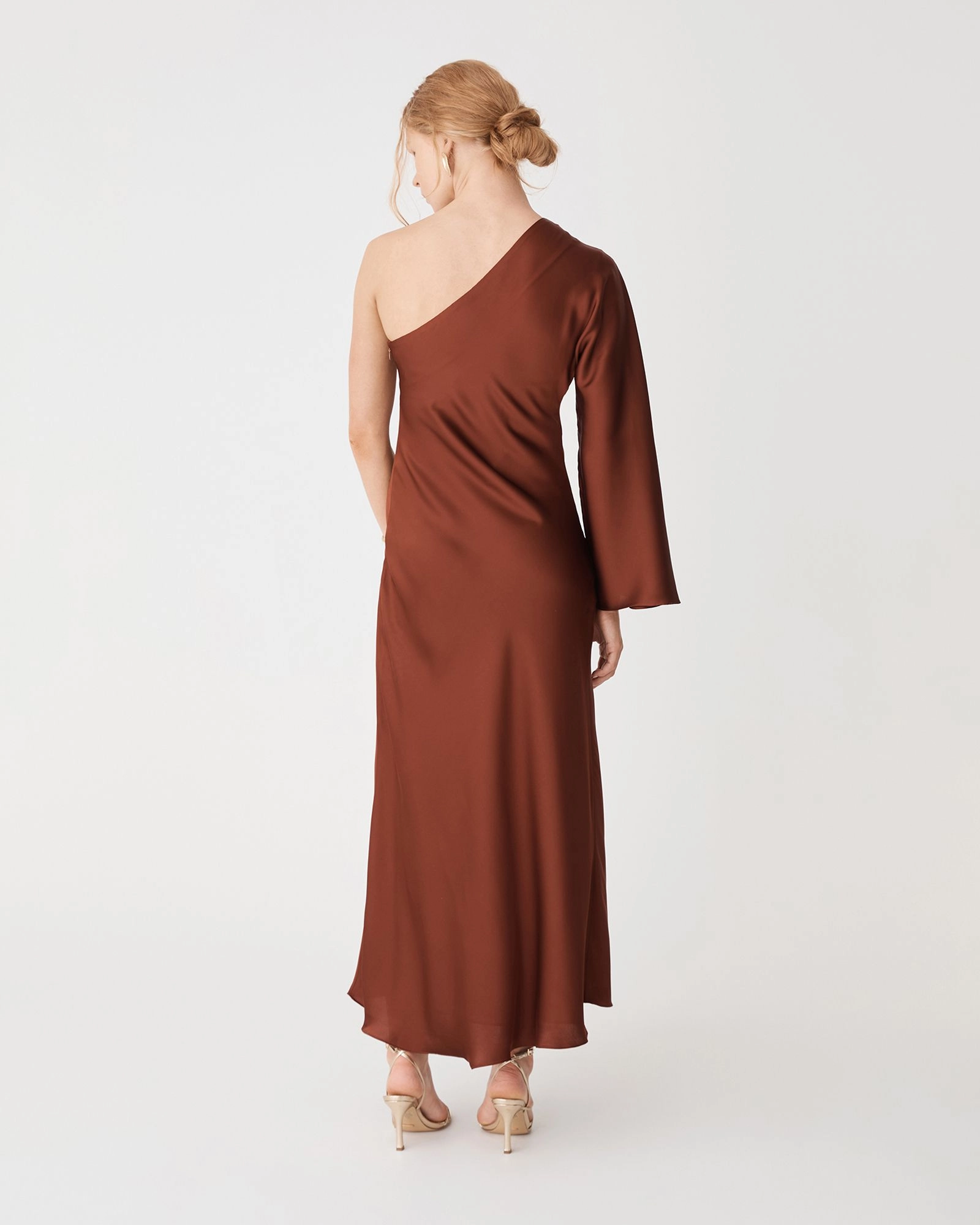 Elegant and striking, the Cleo One Shoulder Satin Dress features a bold asymmetrical neckline in a fluid satin finish. Designed with a single flared sleeve and a flattering midi length, it creates a modern silhouette perfect for special occasions. Style with heels and statement accessories for your special occasions.