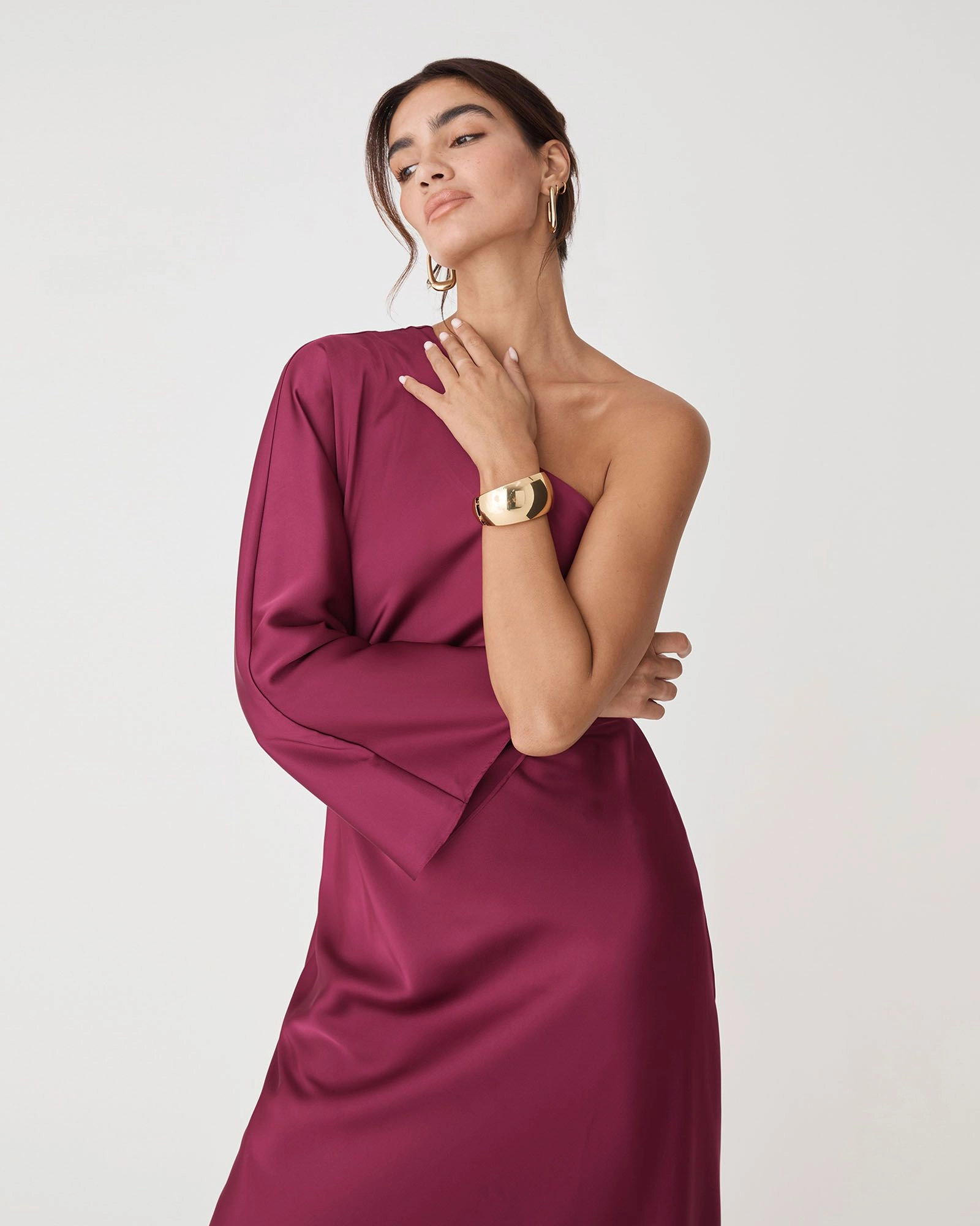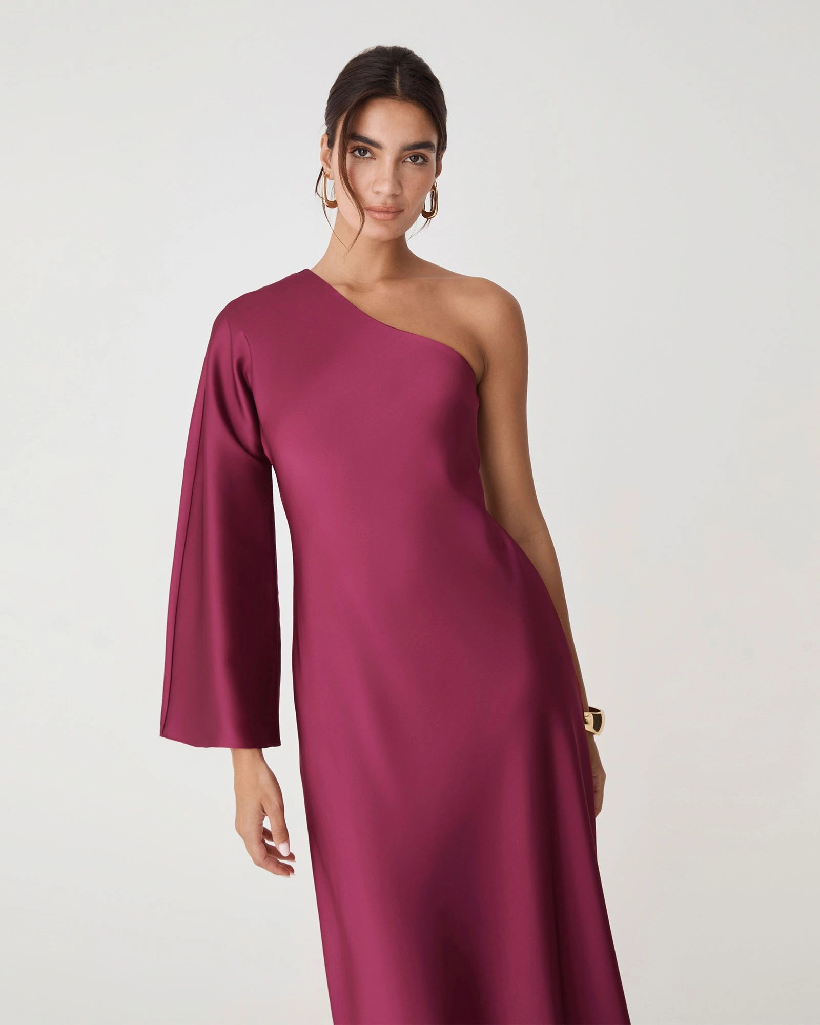 Elegant and striking, the Cleo One Shoulder Satin Dress features a bold asymmetrical neckline in a fluid satin finish. Designed with a single flared sleeve and a flattering midi length, it creates a modern silhouette perfect for special occasions. Style with heels and statement accessories for your special occasions.