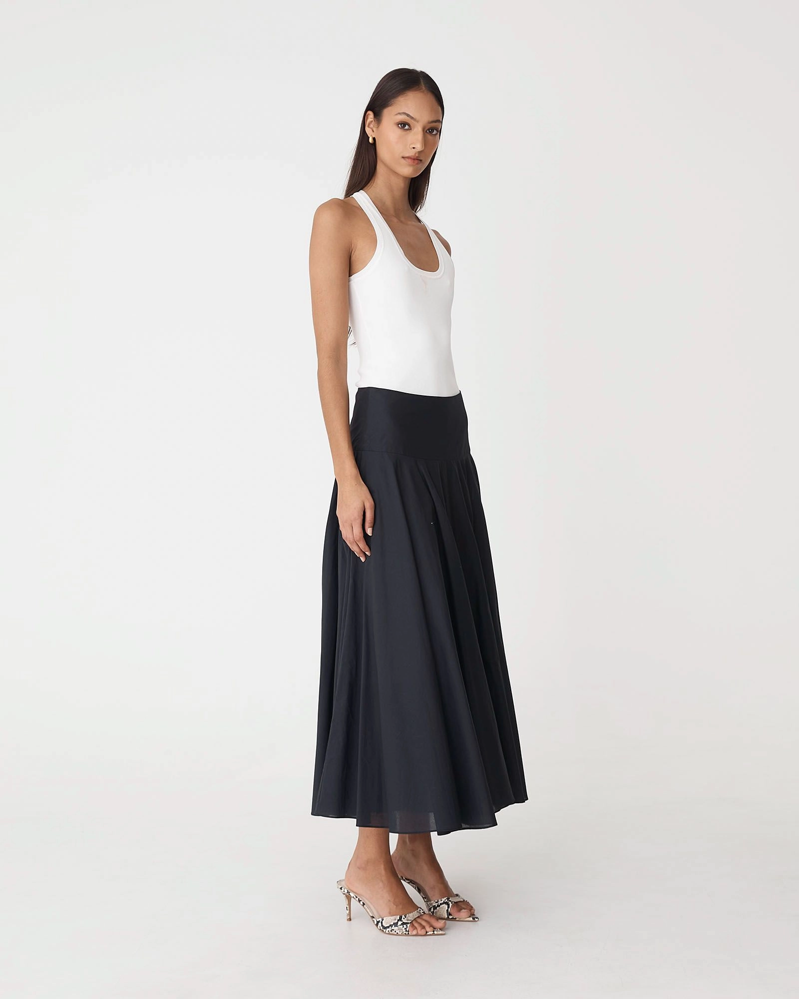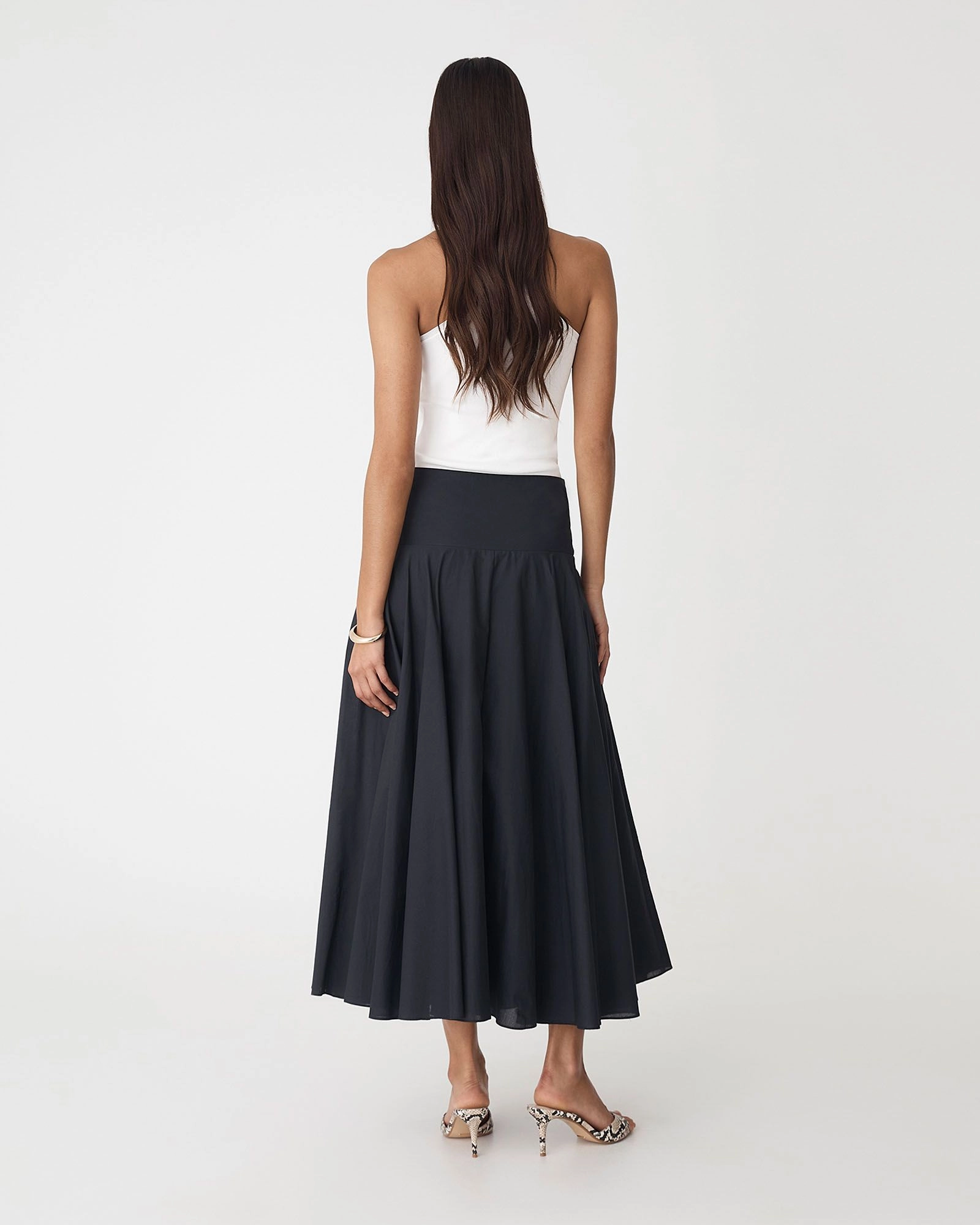 The Deb Cotton Midi Full Skirt, is made from 100% Cotton and features a low to mid drop waist design. Designed with a midi length, invisible side zipper, and full lining, it offers a classic, versatile silhouette perfect for office to after hours styling.
