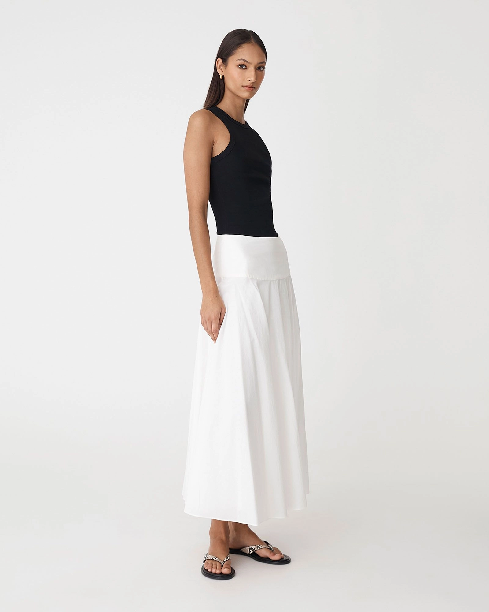 The Deb Cotton Midi Full Skirt, is made from 100% Cotton and features a low to mid drop waist design. Designed with a midi length, invisible side zipper, and full lining, it offers a classic, versatile silhouette perfect for office to after hours styling.