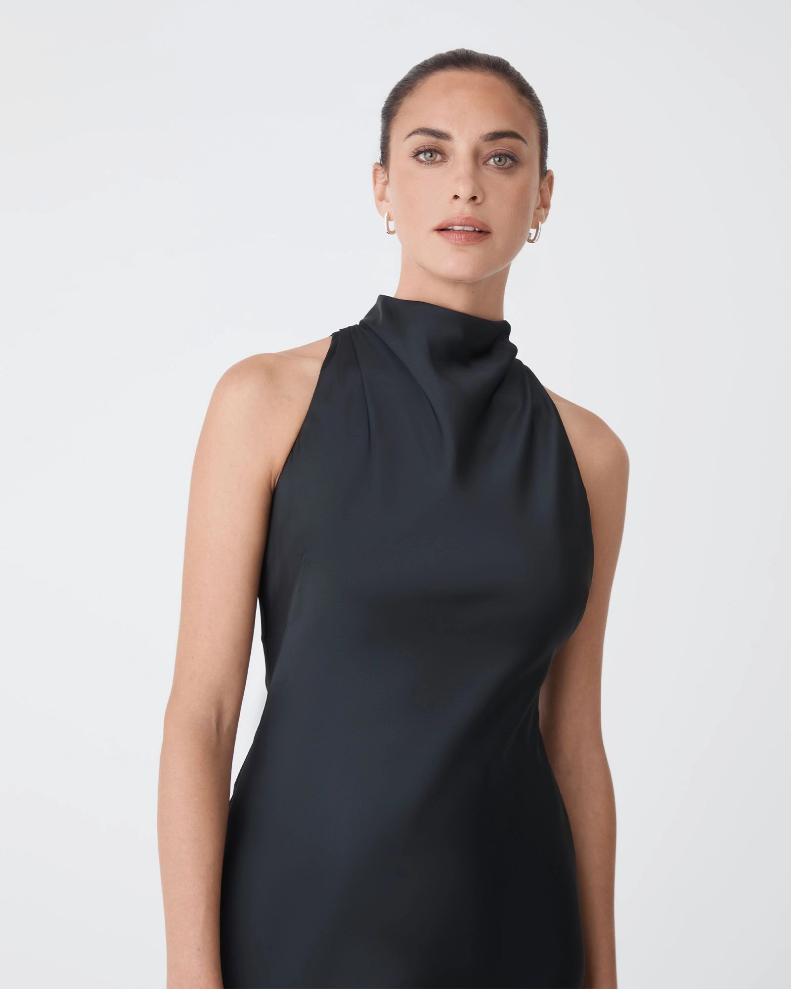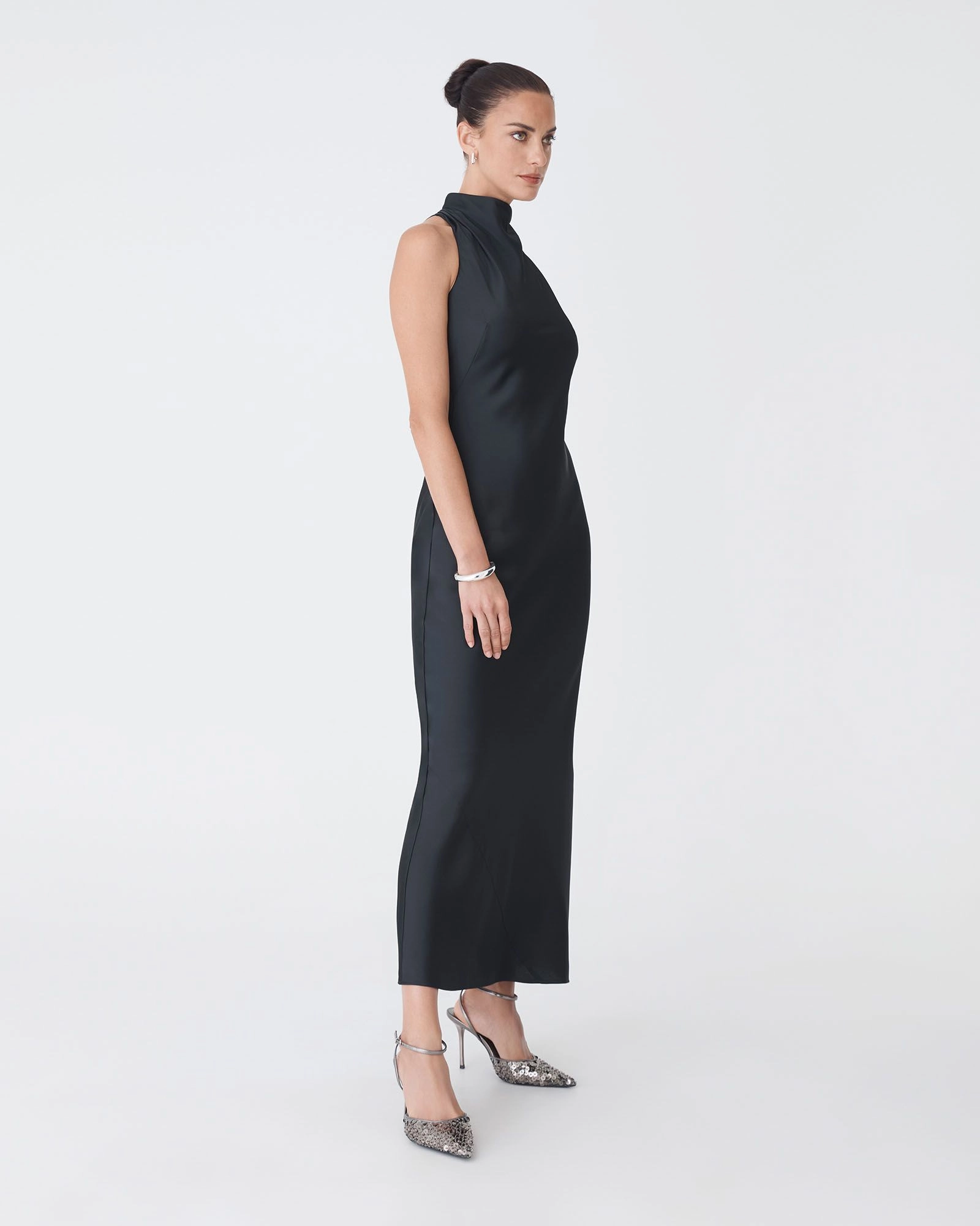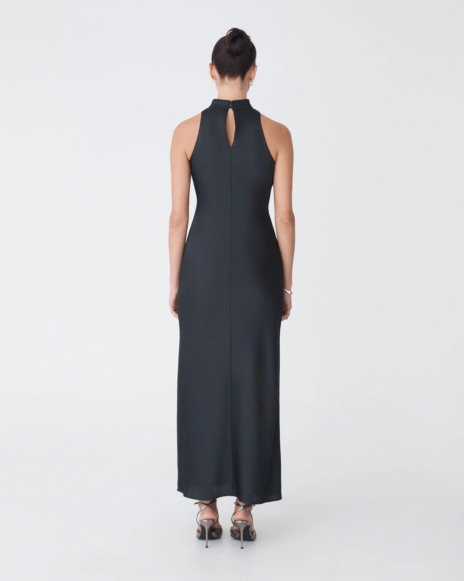 Your new go-to piece for evening elegance, the Delilah Bias Satin Dress. Featuring a high cowl neckline, bias-cut construction for a flattering, body-skimming fit and an invisible side zipper and loop buttons for a secure closure. The maxi length adds a refined finish, making it ideal for special occasions and formal events.