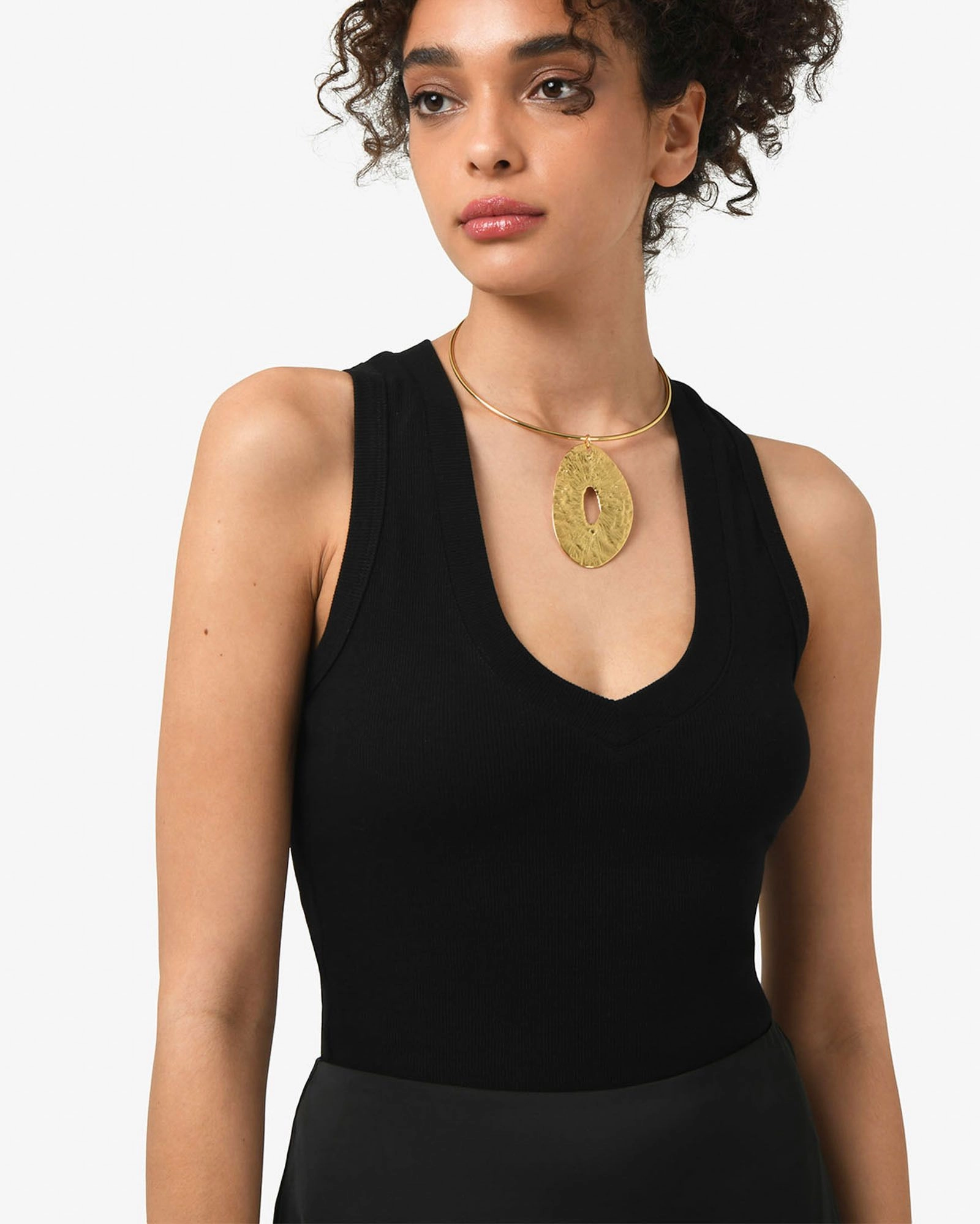 The Devon V-Neck Singlet is a soft ribbed knit piece with a flattering V-neckline, racer cut, and a body-skimming fit. Designed to gently hug your figure, it creates a smooth, flattering silhouette - perfect for tucking into high-waisted or relaxed-fit bottoms.