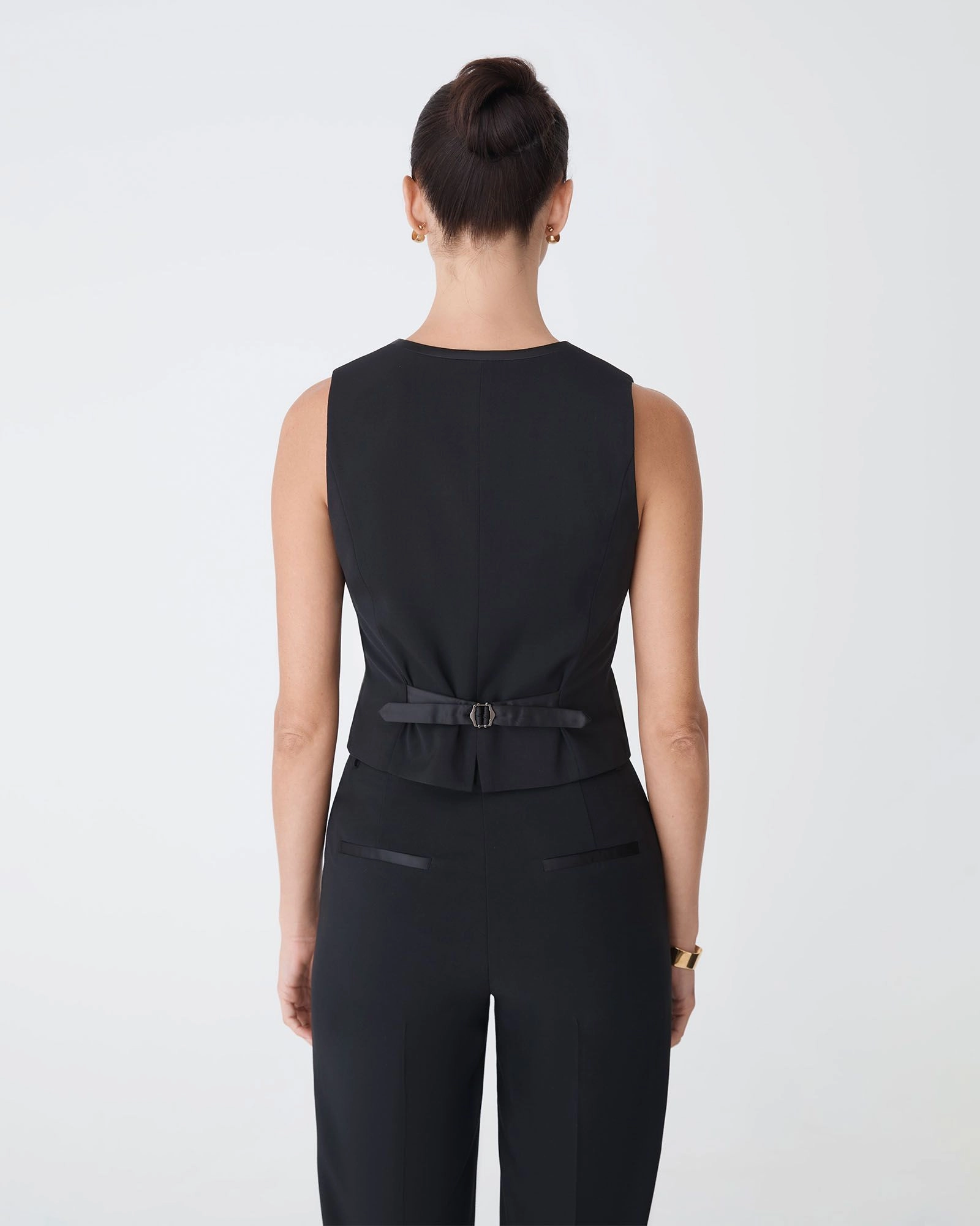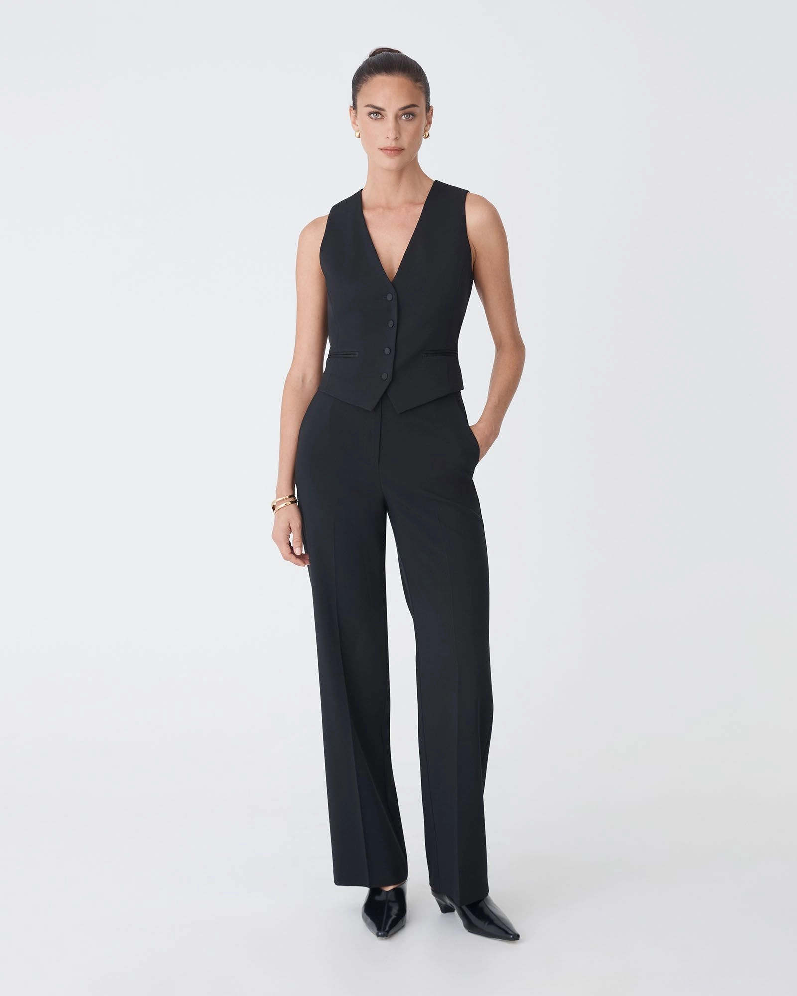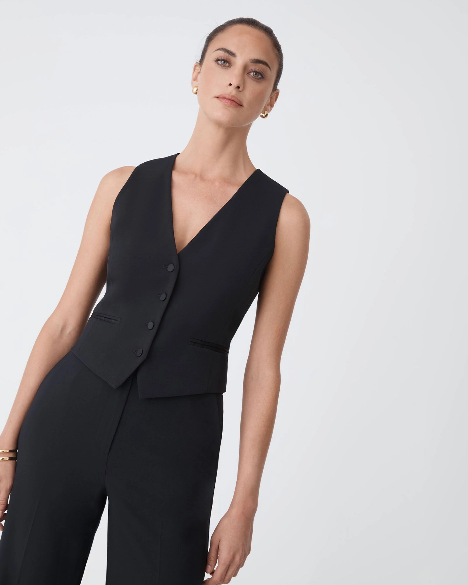 The Eve Classic Two Tone Vest is a sleek, tailored piece designed for a clean, structured fit. It features a deep V-neckline and satin covered buttons for closure, with shaping darts that create a smooth, streamlined silhouette. The two-tone satin construction adds subtle contrast, while functional welt pockets and a pointed front hem provide a sharp finish.