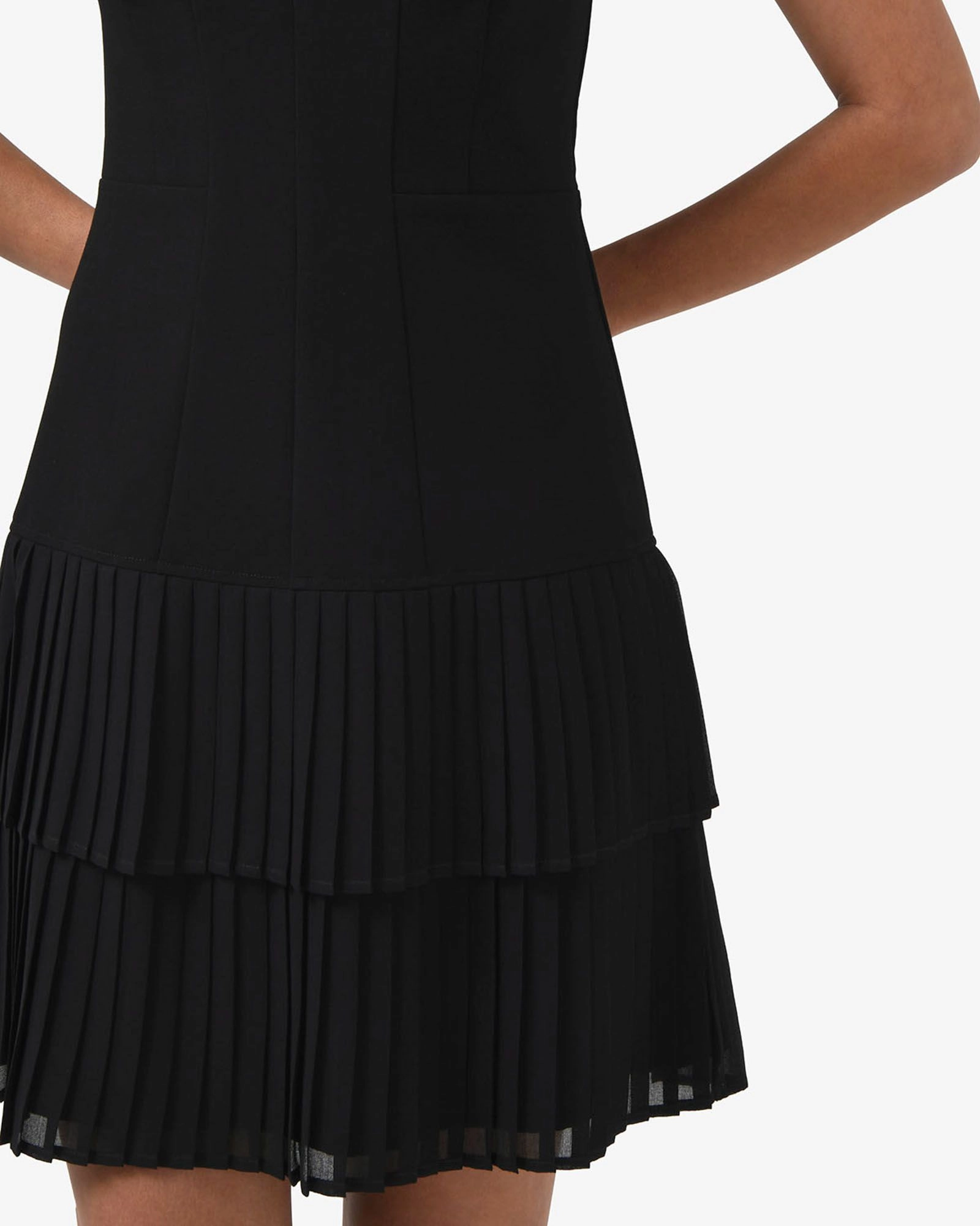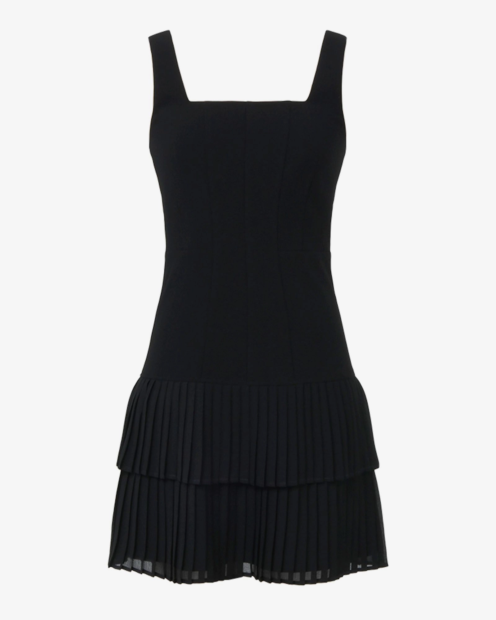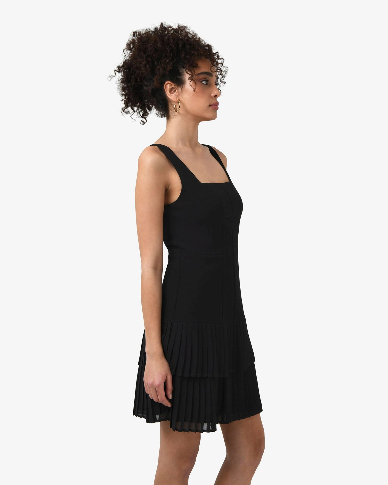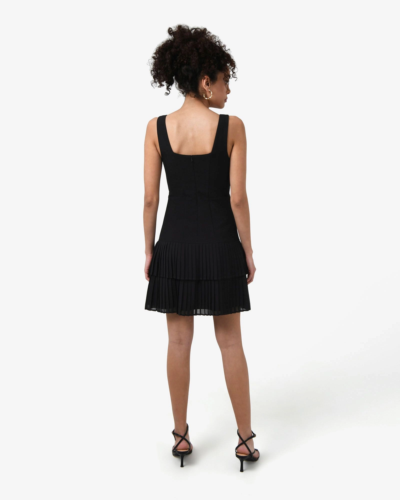 The Francis Drop Waist Mini Dress features a smooth, fitted bodice that transitions effortlessly into a tiered, pleated skirt. Designed with a square neckline and wide tank straps for a clean, structured look, this mini silhouette flatters through the bust and waist while offering graceful movement.