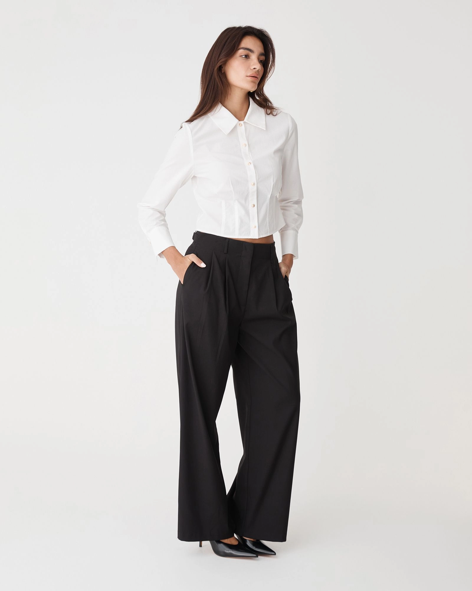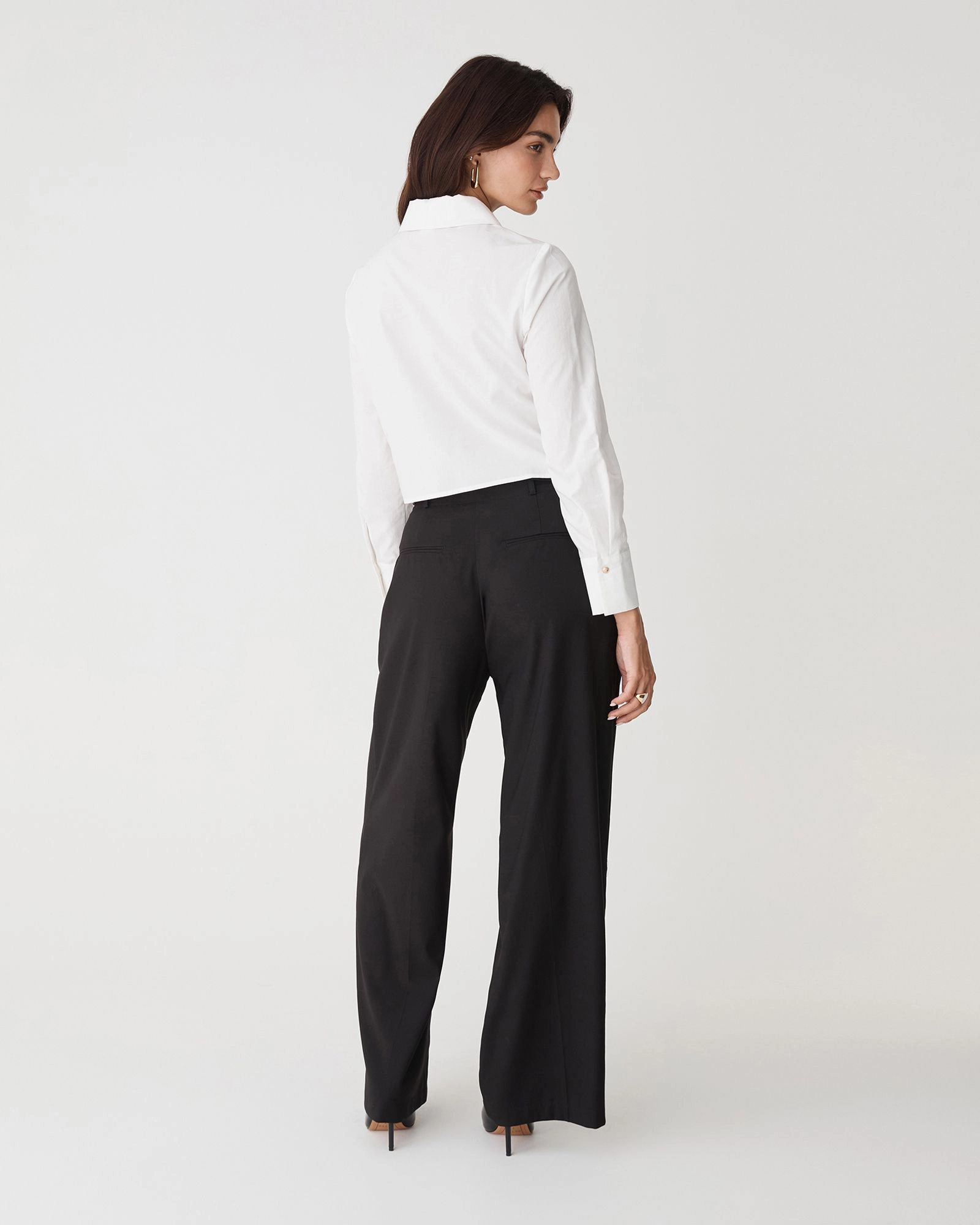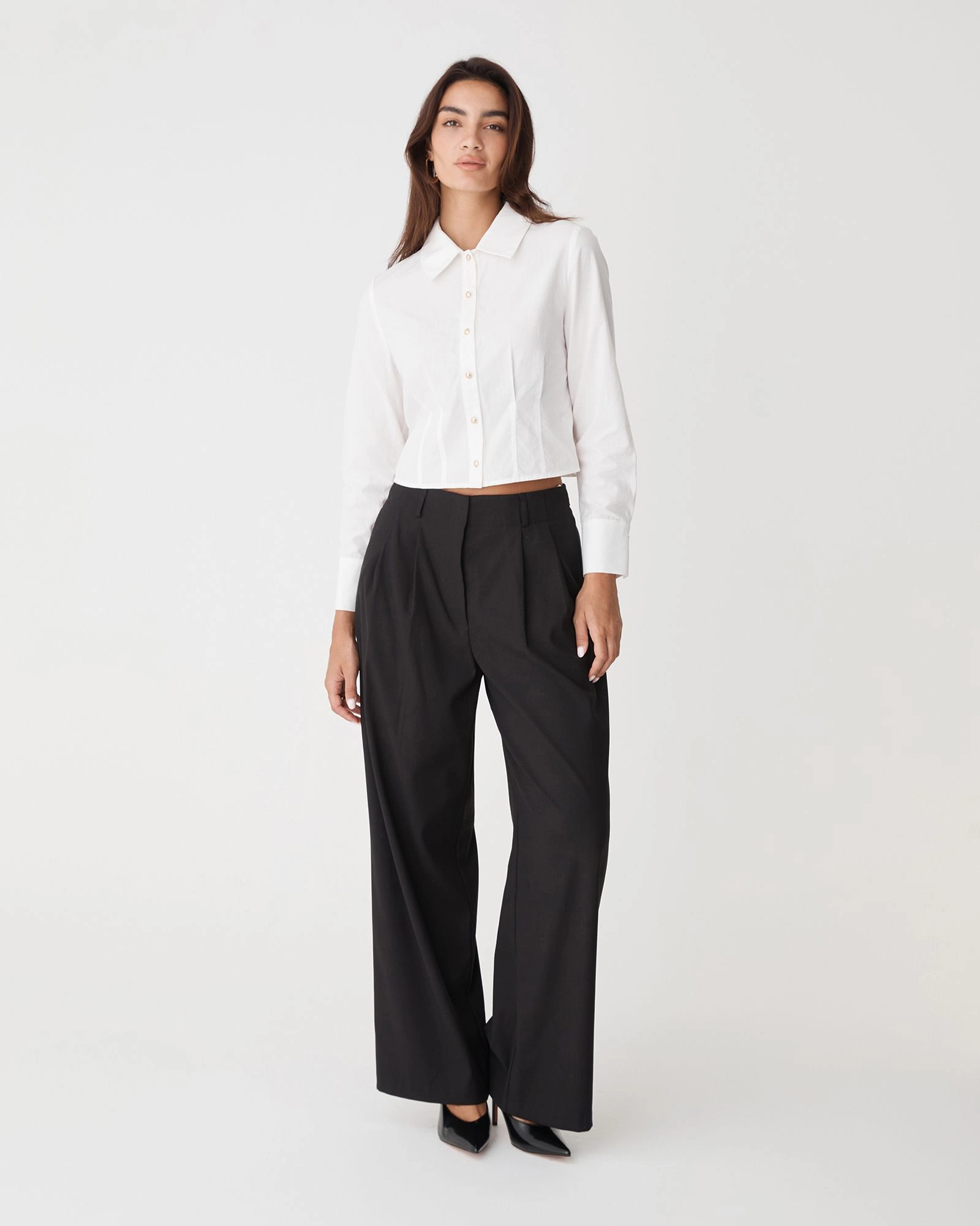 A modern update to the classic button-up, the Gabby Pleated Hem Shirt features a cropped silhouette with structured pleat detailing for a flattering, sculpted fit. Designed to balance sharp tailoring with effortless style, it offers a clean, minimalist finish and pairs perfectly with high-waisted pieces for a versatile look.