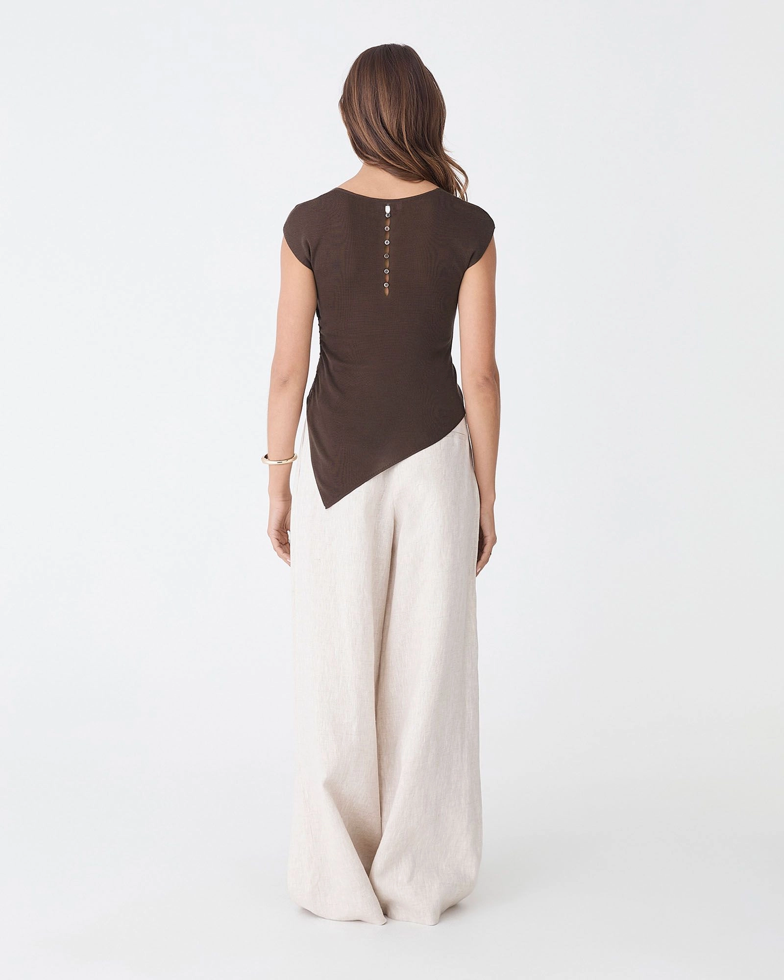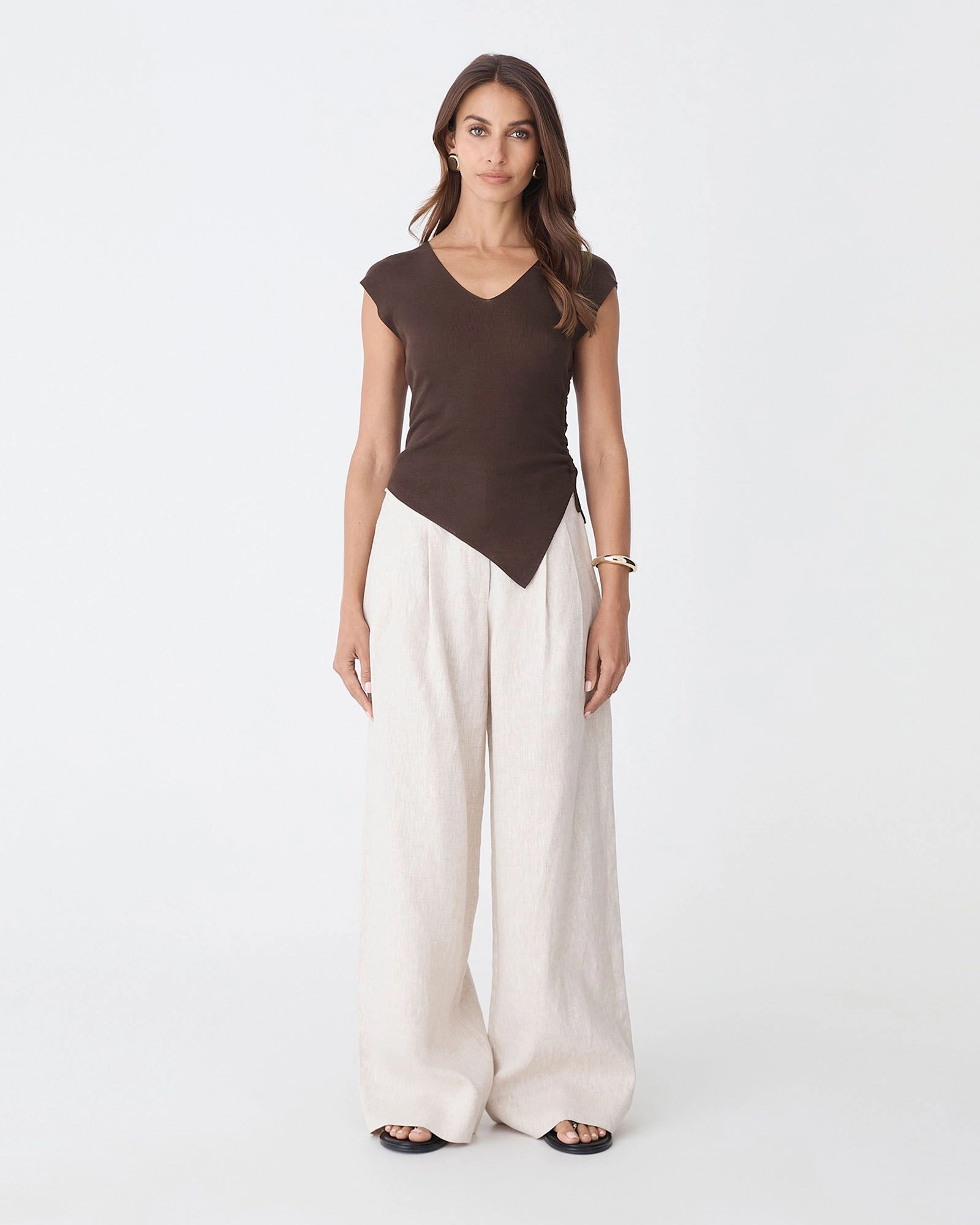 The Galina Ruched Lyocell Knit Top is made from a soft, breathable lyocell fabric, featuring a flattering V-neck, cap sleeves, and a unique asymmetric hem that enhances the silhouette. Perfect for off-duty days, it can be easily styled with linen pants, shorts and denim for a polished yet relaxed look.