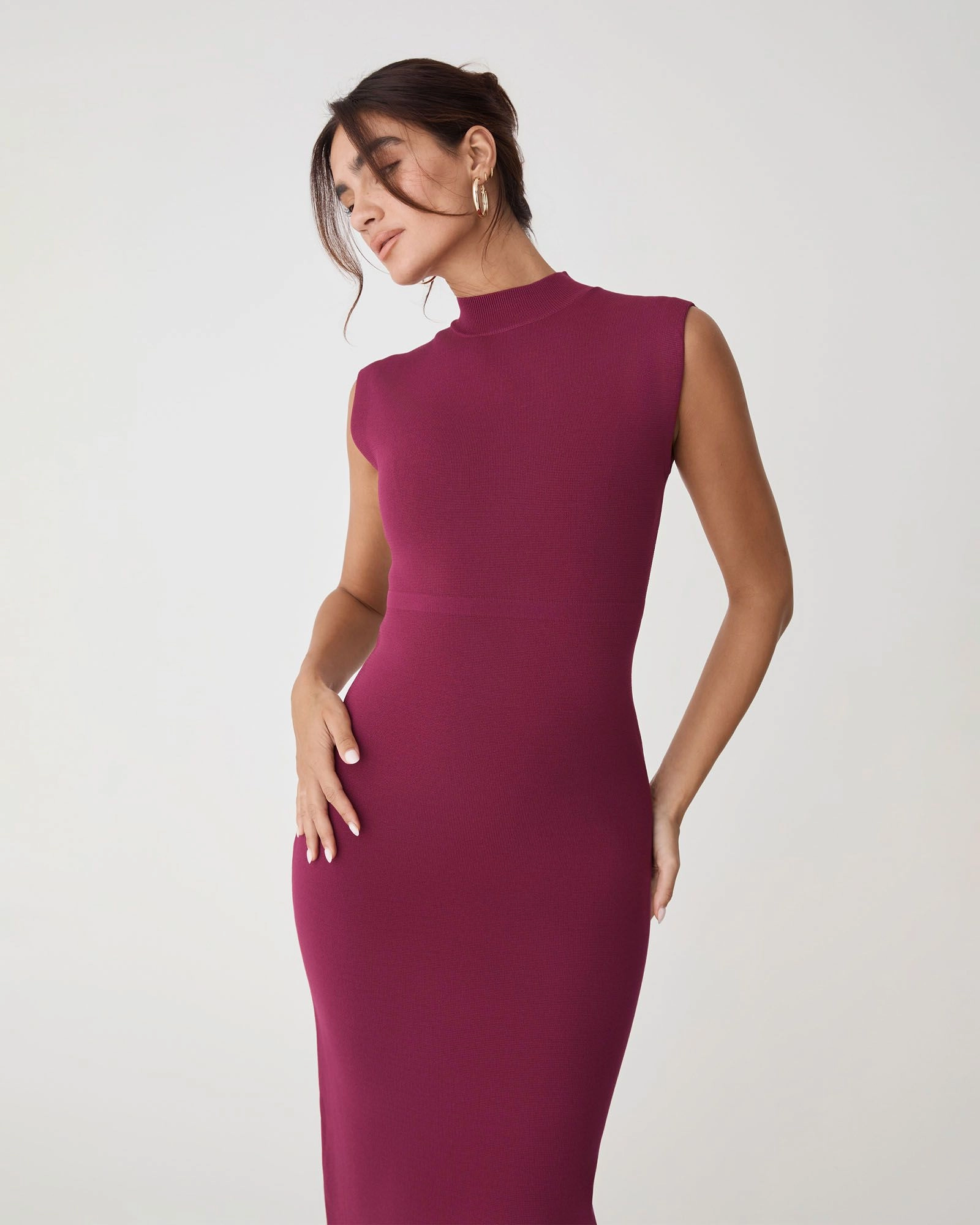 Comfortable and effortless, the Heloise Milano Knit Dress features a structured, body-sculpting silhouette with a sleek mock neckline in a midi length. It combines polished sophistication with everyday ease. Wear with pointed-toe pumps for a professional setting, or pair with heeled boots and statement accessories for a refined evening look.