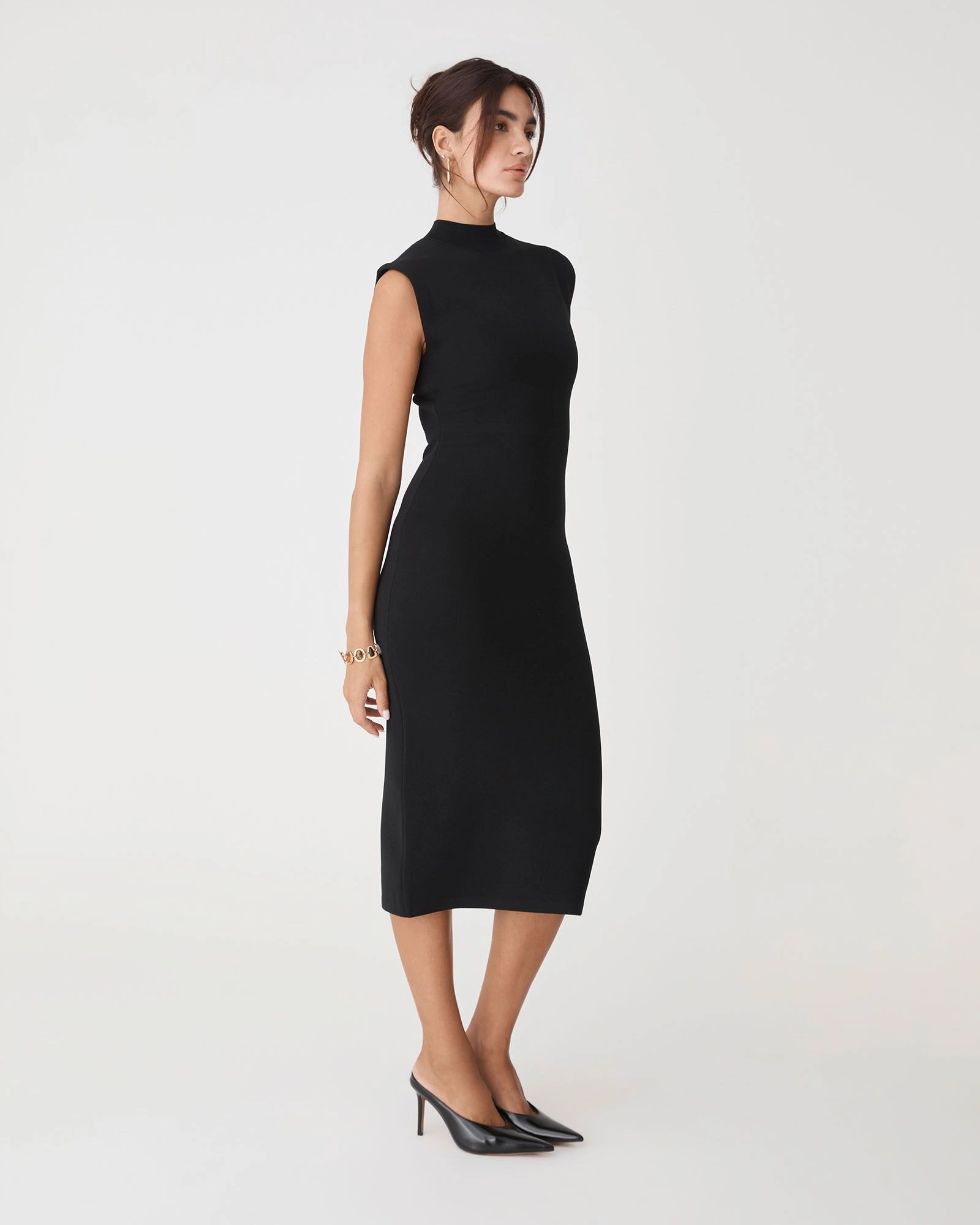Comfortable and effortless, the Heloise Milano Knit Dress features a structured, body-sculpting silhouette with a sleek mock neckline in a midi length. It combines polished sophistication with everyday ease. Wear with pointed-toe pumps for a professional setting, or pair with heeled boots and statement accessories for a refined evening look.