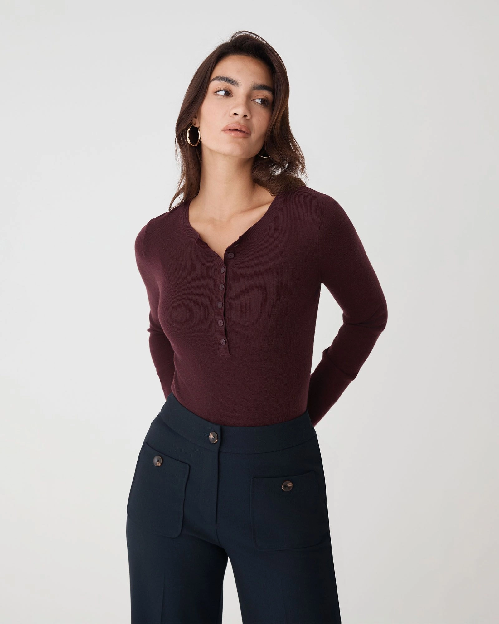 The Henley Button Up Knit offers natural warmth with a breathable, lightweight feel. The deep crew neckline and front placket with shell buttons add subtle detail, while the fitted silhouette provides a clean, polished look. This long sleeve knit is the ideal base layering piece for the winter season.