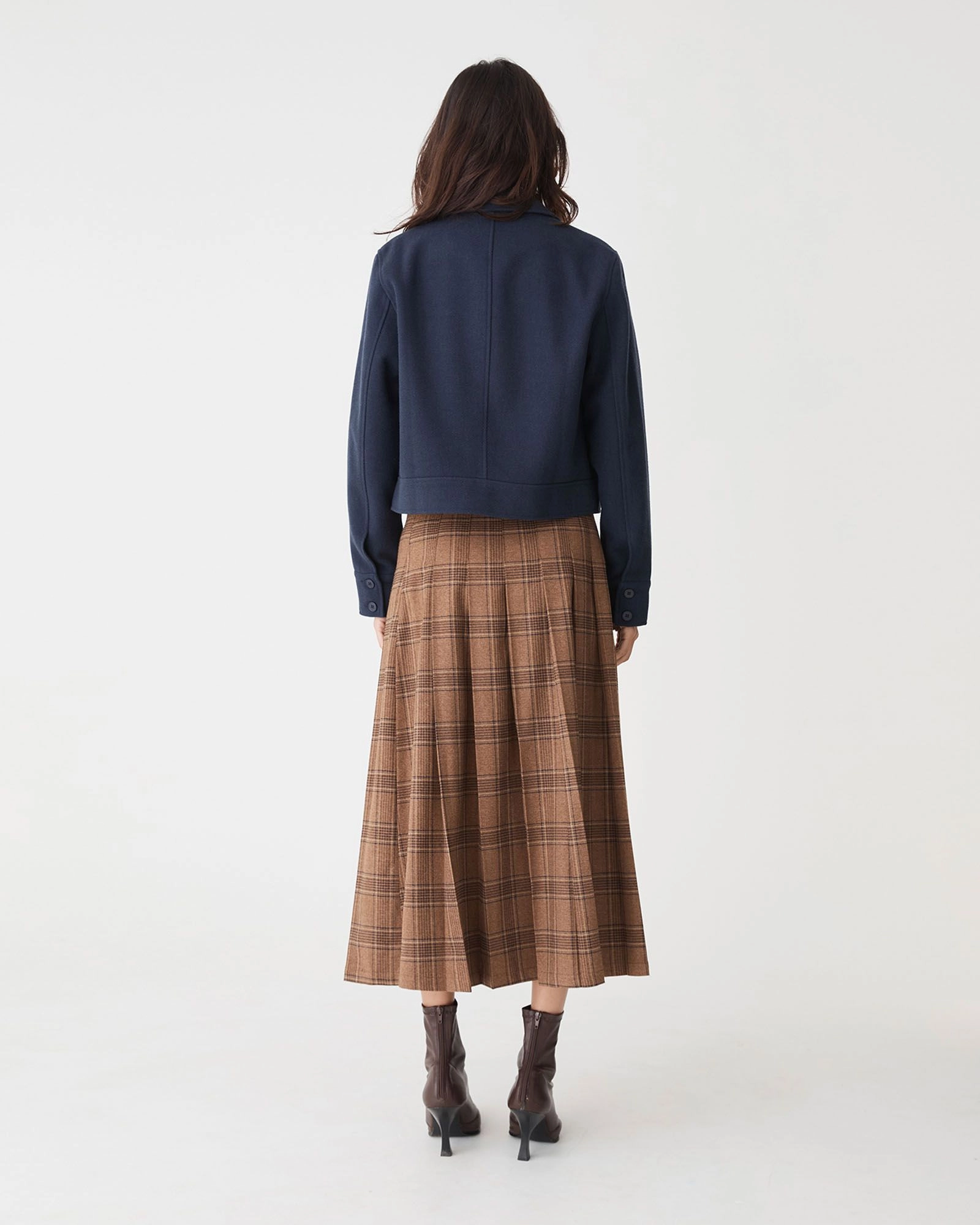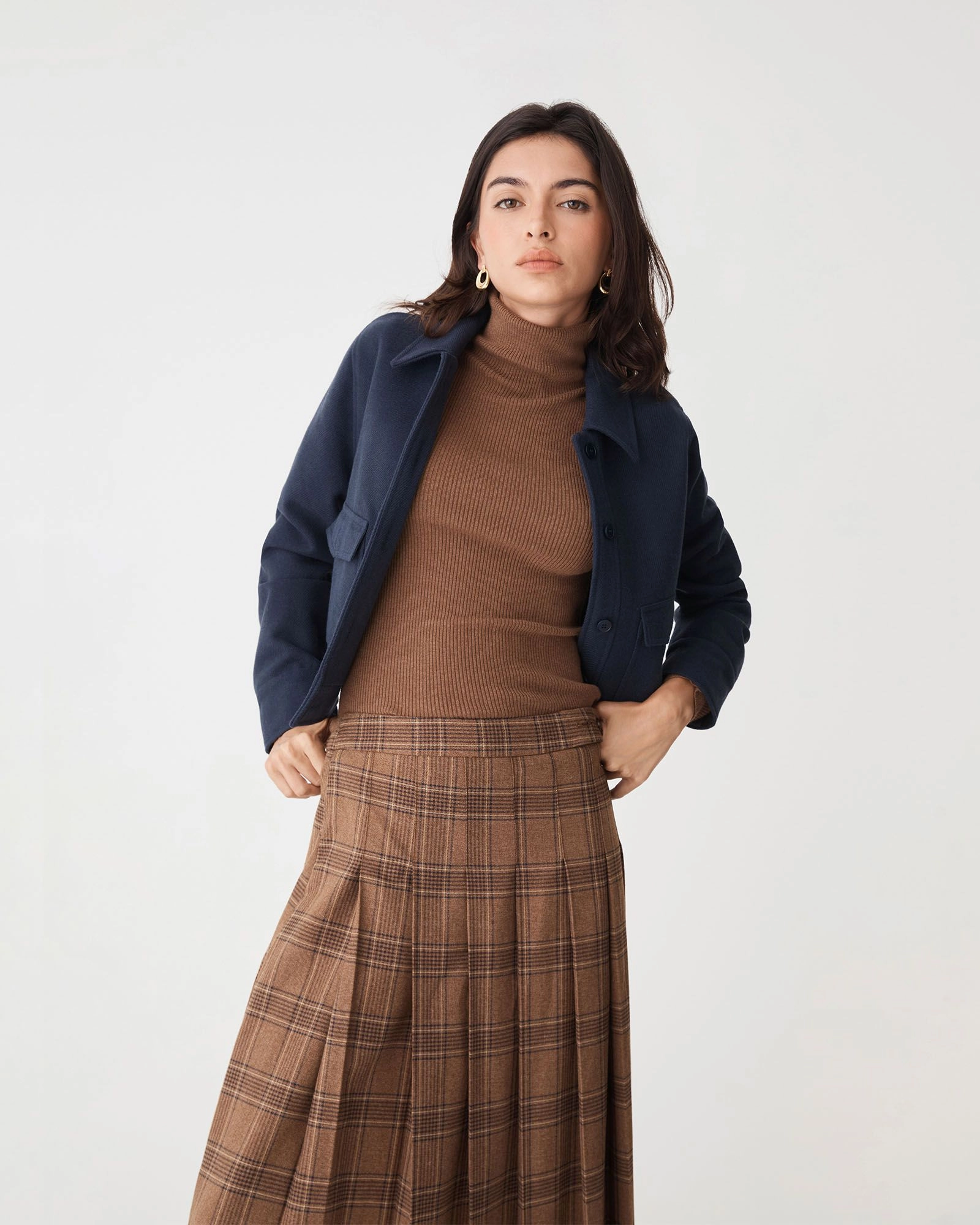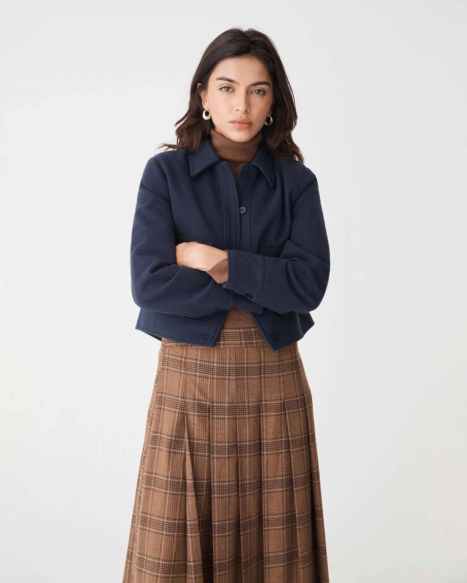The Holland Cropped Jacket is designed with a cropped silhouette and clean tailoring. It offers warmth and structure and features a pointed collar and button-up front with tonal buttons. Wear open for a relaxed look or buttoned for a structured finish . Pair with high-waisted trousers or skirts, layered over a fitted knit for a chic ensemble.