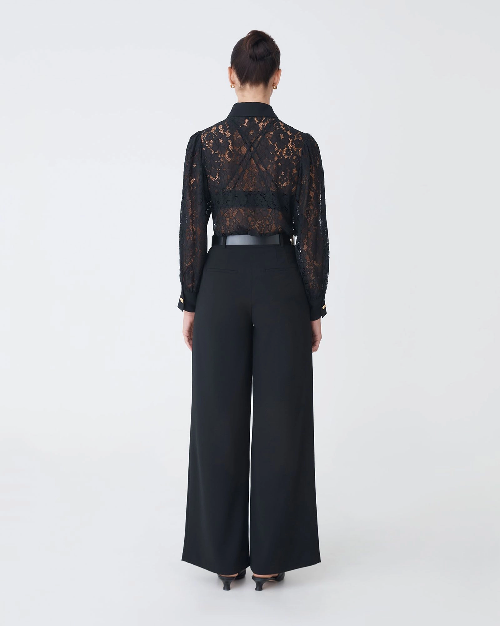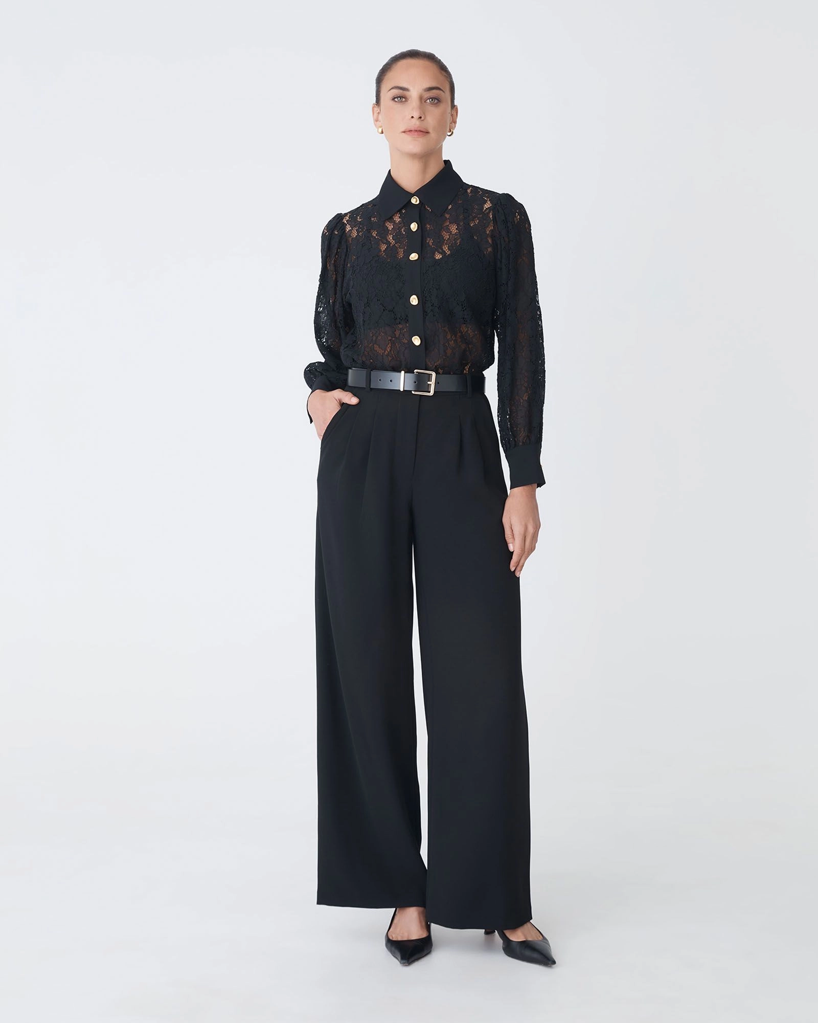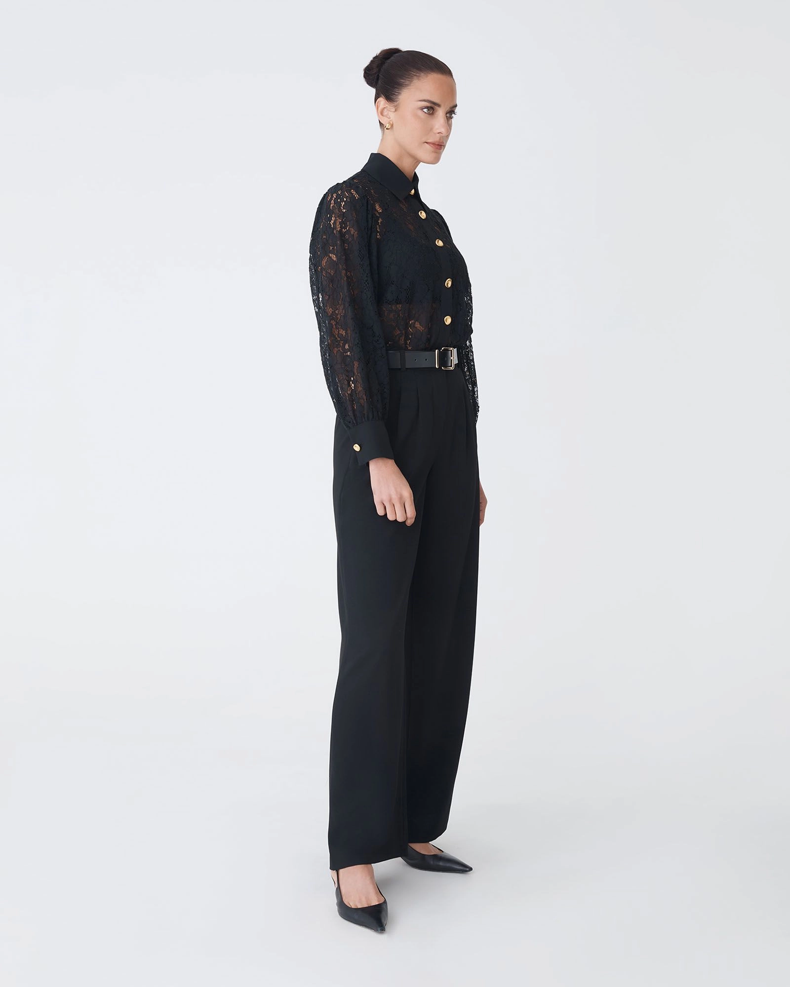 The Kennedy Lace Shirt combines delicate floral lace with a feminine edge. Designed with a pointed collar, statement gold-tone buttons, and long balloon sleeves with wide cuffs, it features loose fit and straight hem for effortless styling. The lace finish makes it ideal for layering over a camisole or styling with pants or skirts.