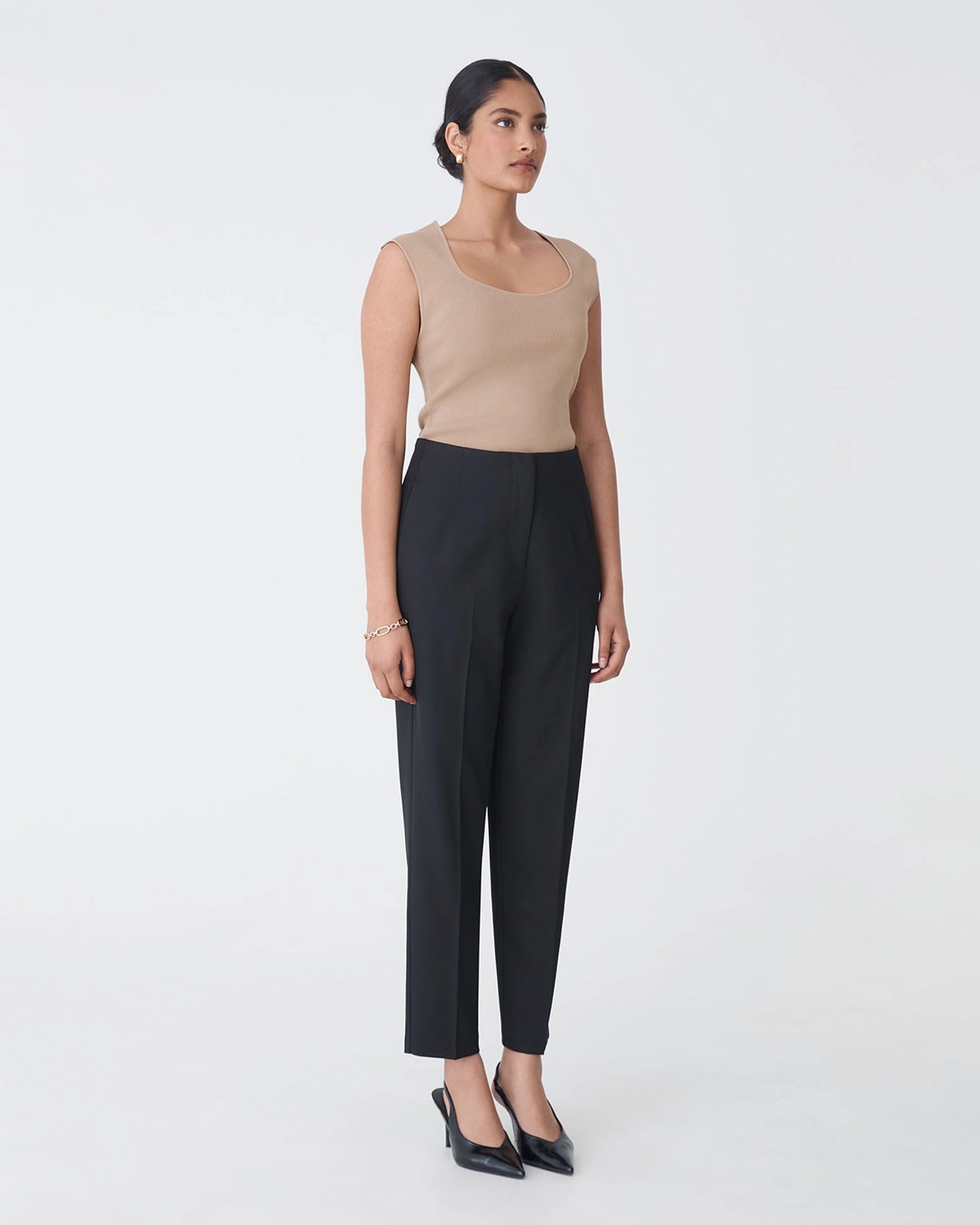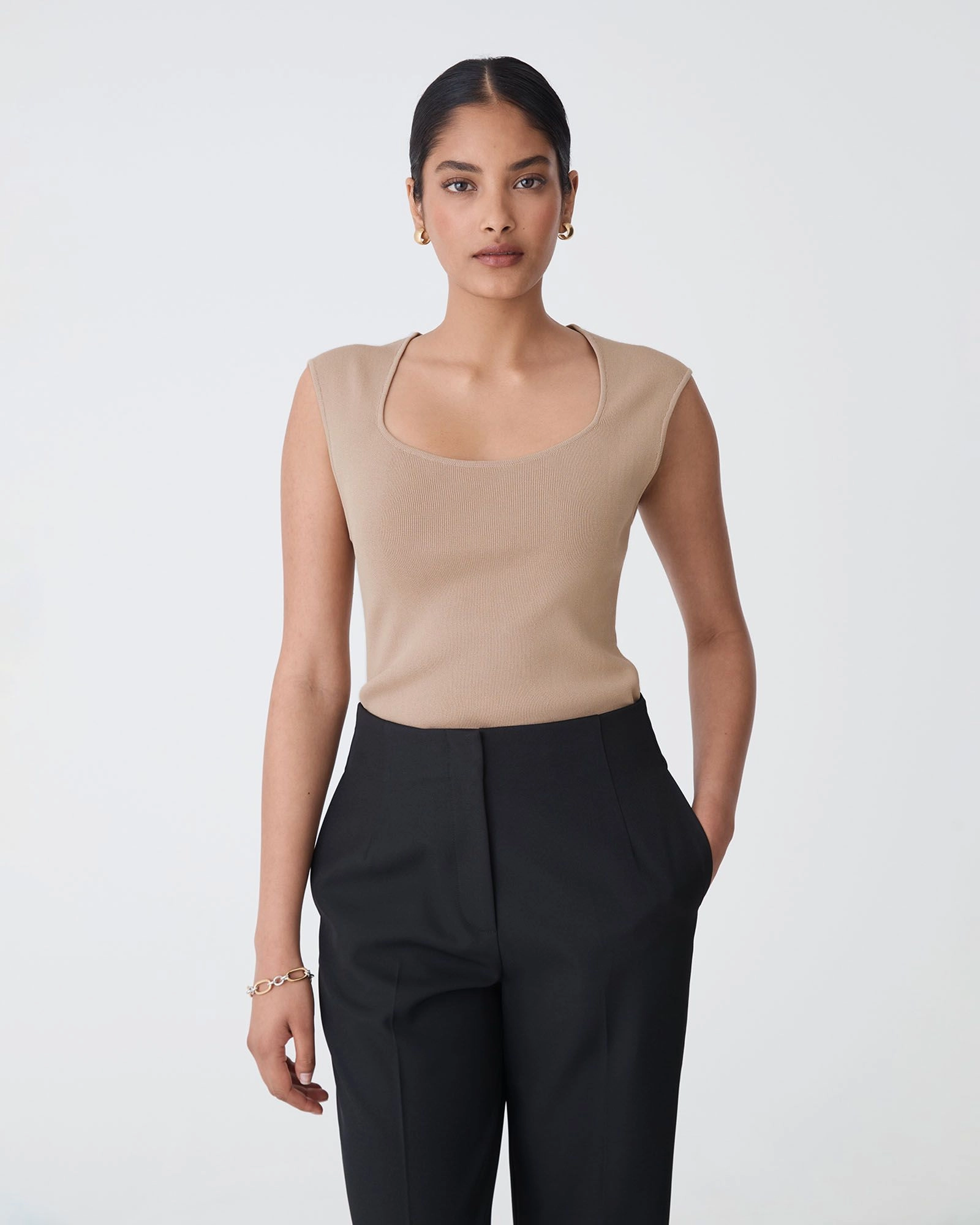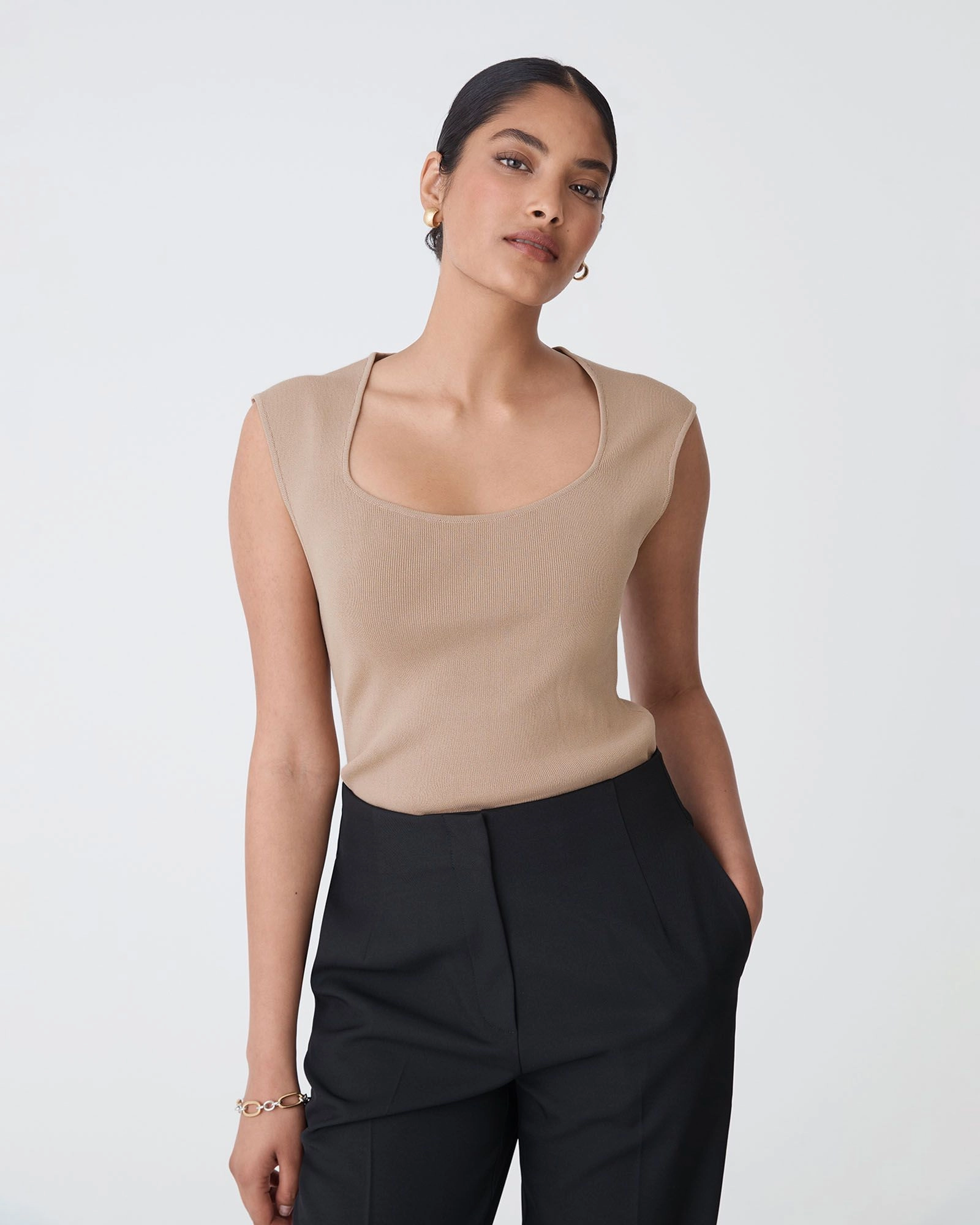 A sleek, minimalist staple for your capsule wardrobe, the Kingsley Knit Top features a square-scoop neckline and extended cap shoulders for a polished take on the classic tank. Designed in a fine-gauge knit, it offers a smooth, body-hugging fit that tucks neatly into high-waisted bottoms and works beautifully under blazers or as a standalone statement.