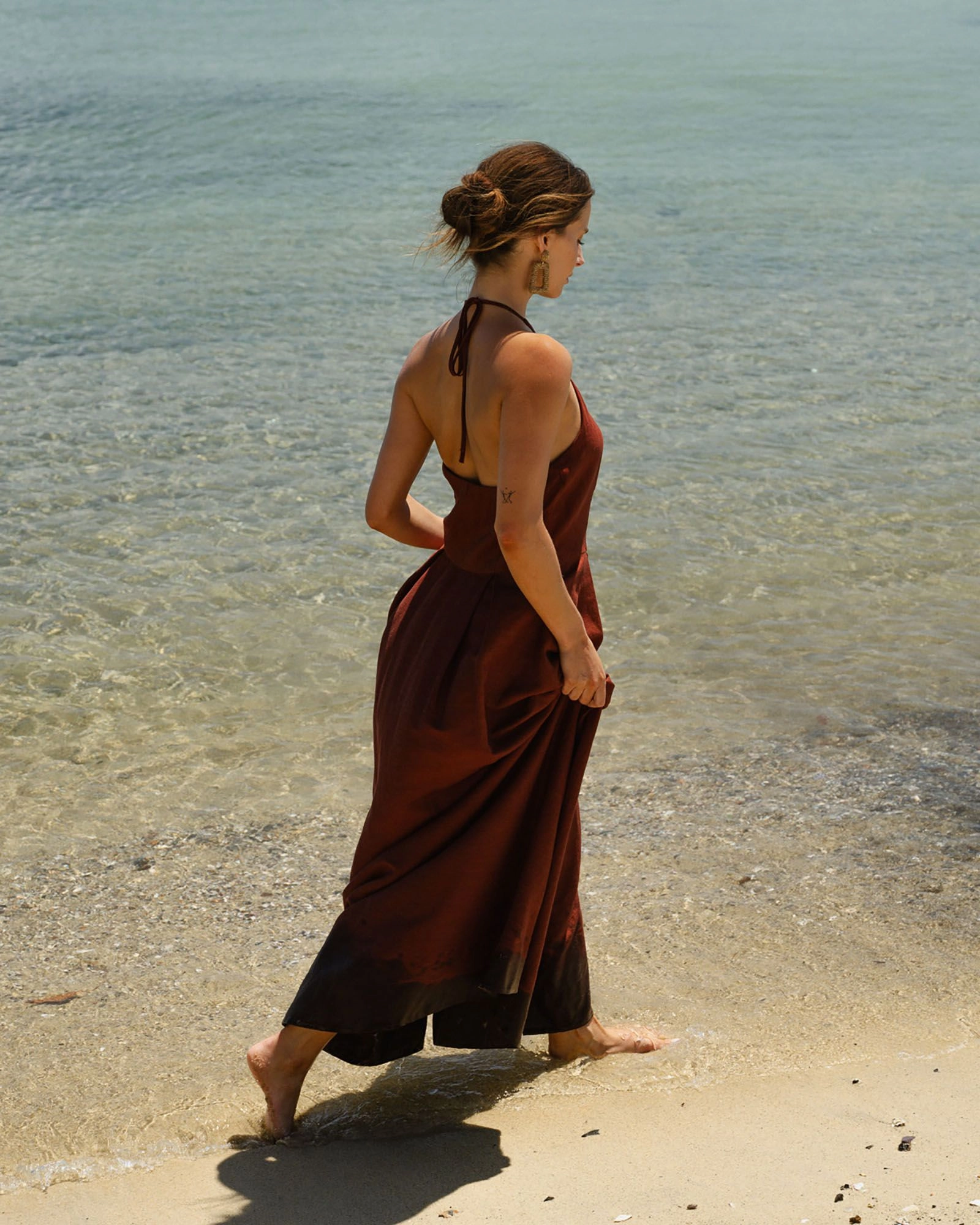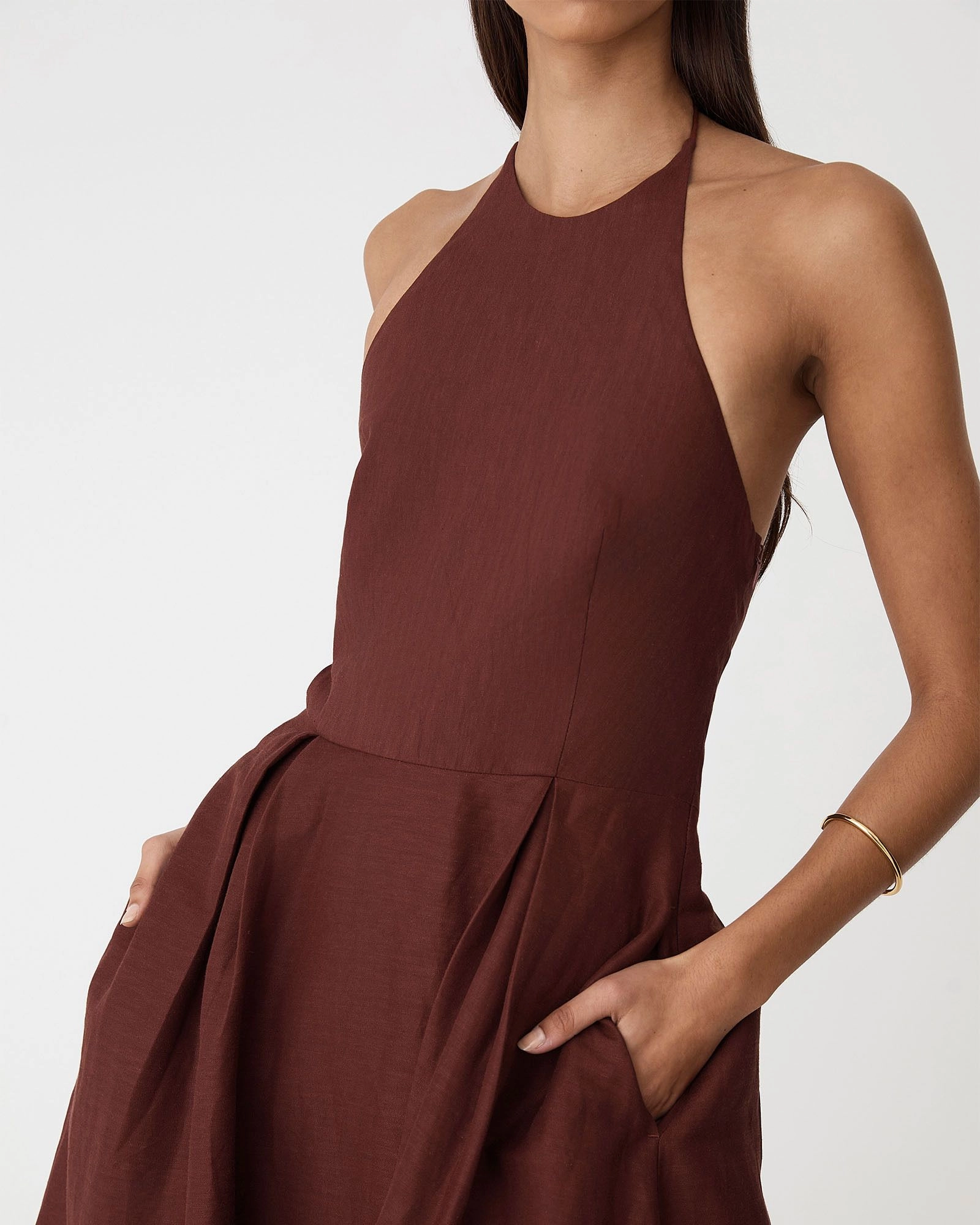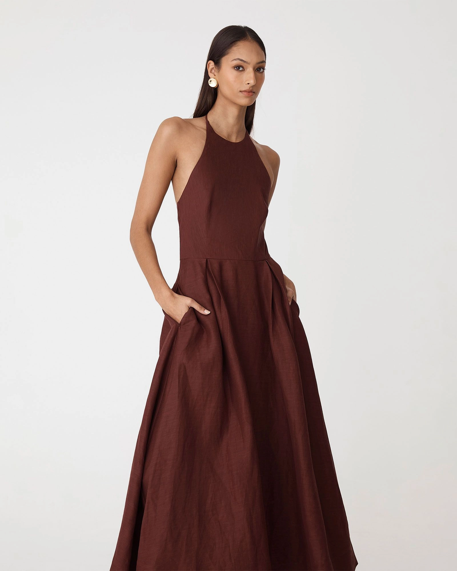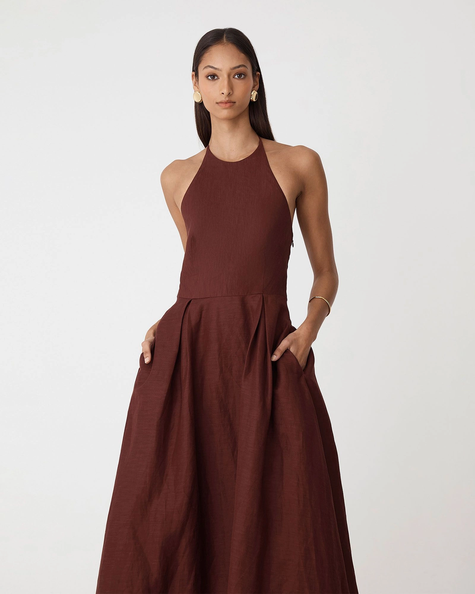 The Lennie Halter Maxi Dress is defined by a chic halter neckline framing shoulders and collarbone, flattering fitted bodice, and flowing A-line maxi skirt. Crafted from premium textured fabric with gentle pleating at the waist, it features discreet side seam pockets and a back zipper for a seamless, elegant finish.
