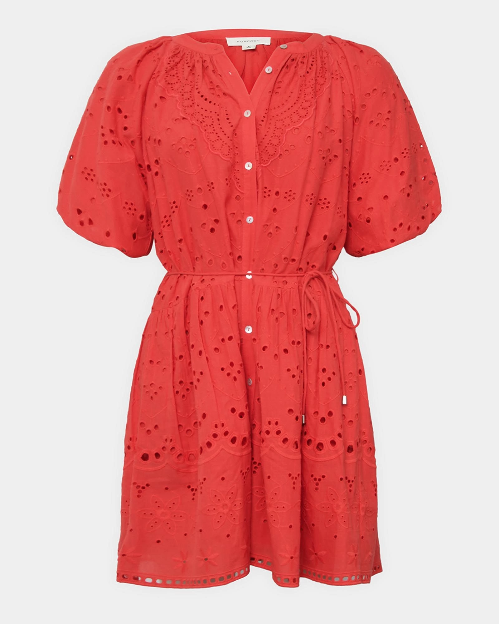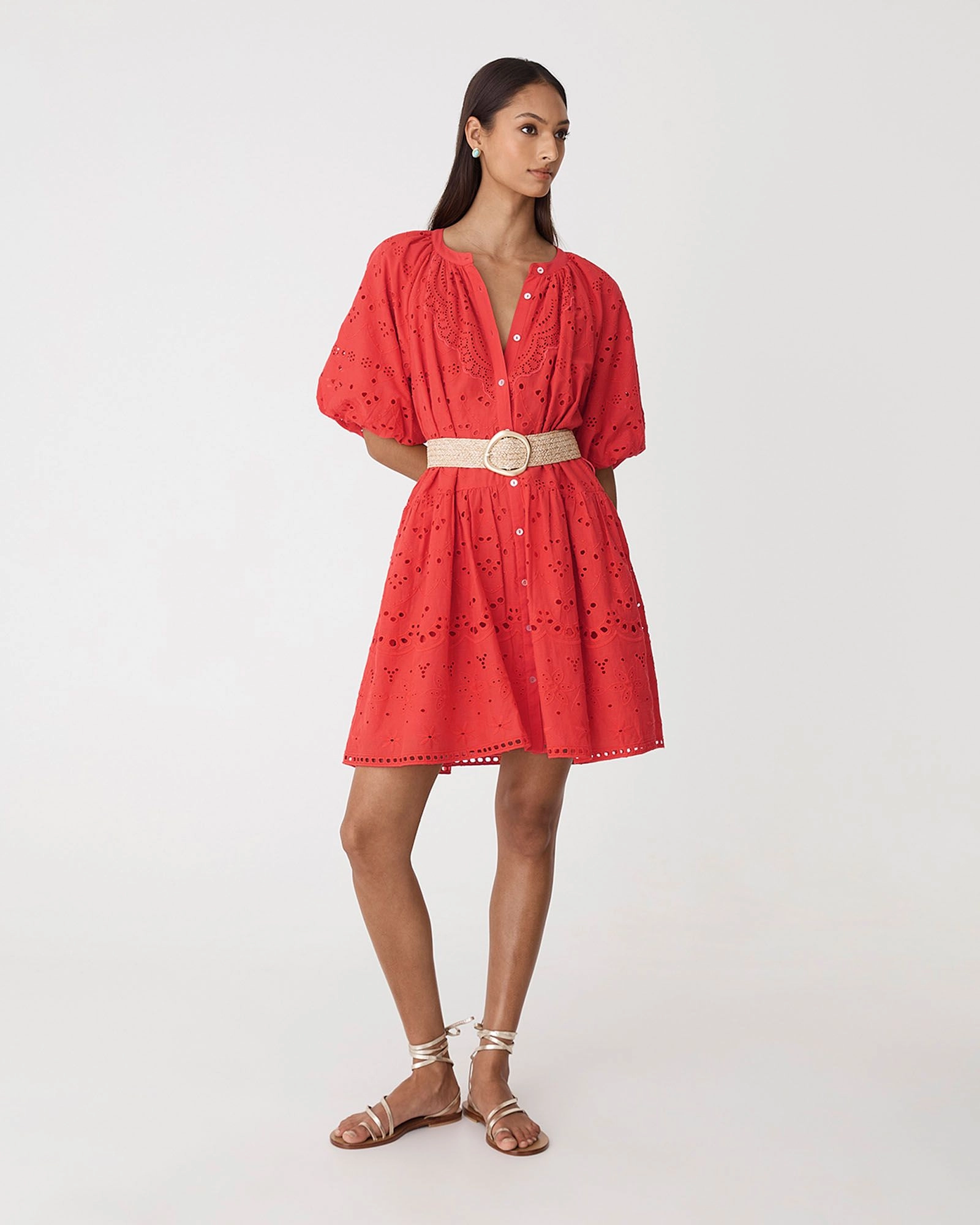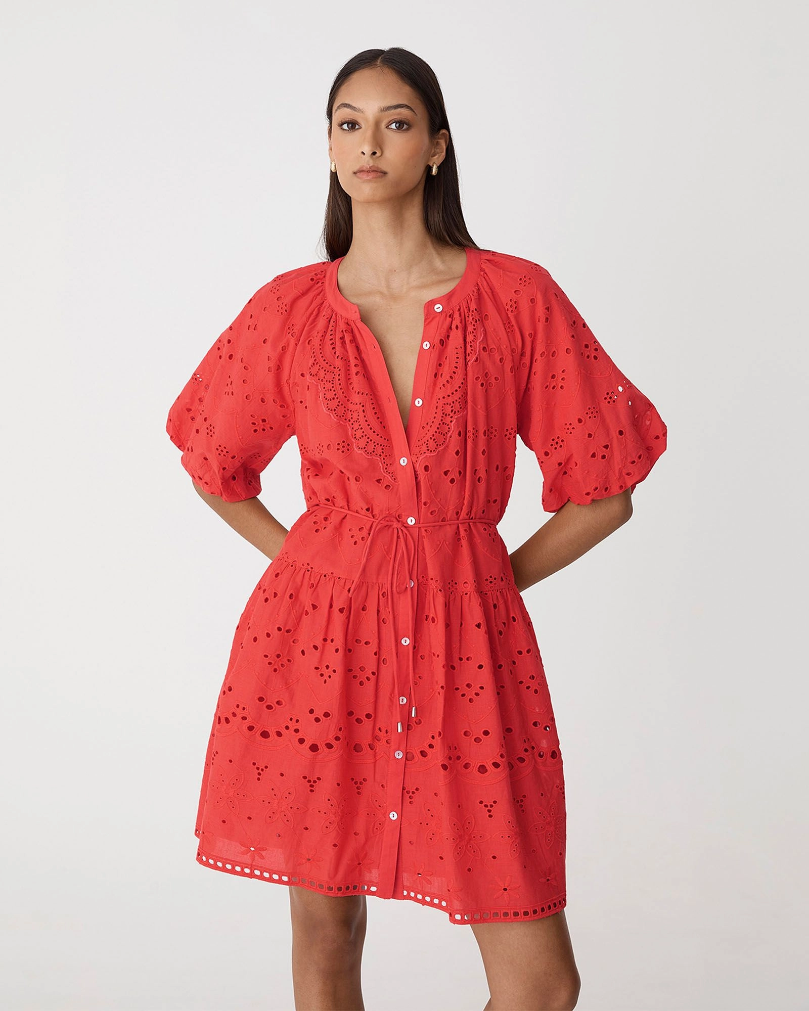 A bold and timeless piece. Lola Broderie Tiered Dress is crafted from soft, breathable cotton, featuring intricate eyelet embroidery that adds a touch of bohemian charm. The relaxed fit and short sleeves offer effortless comfort, while the string belt allows you to customize your look.