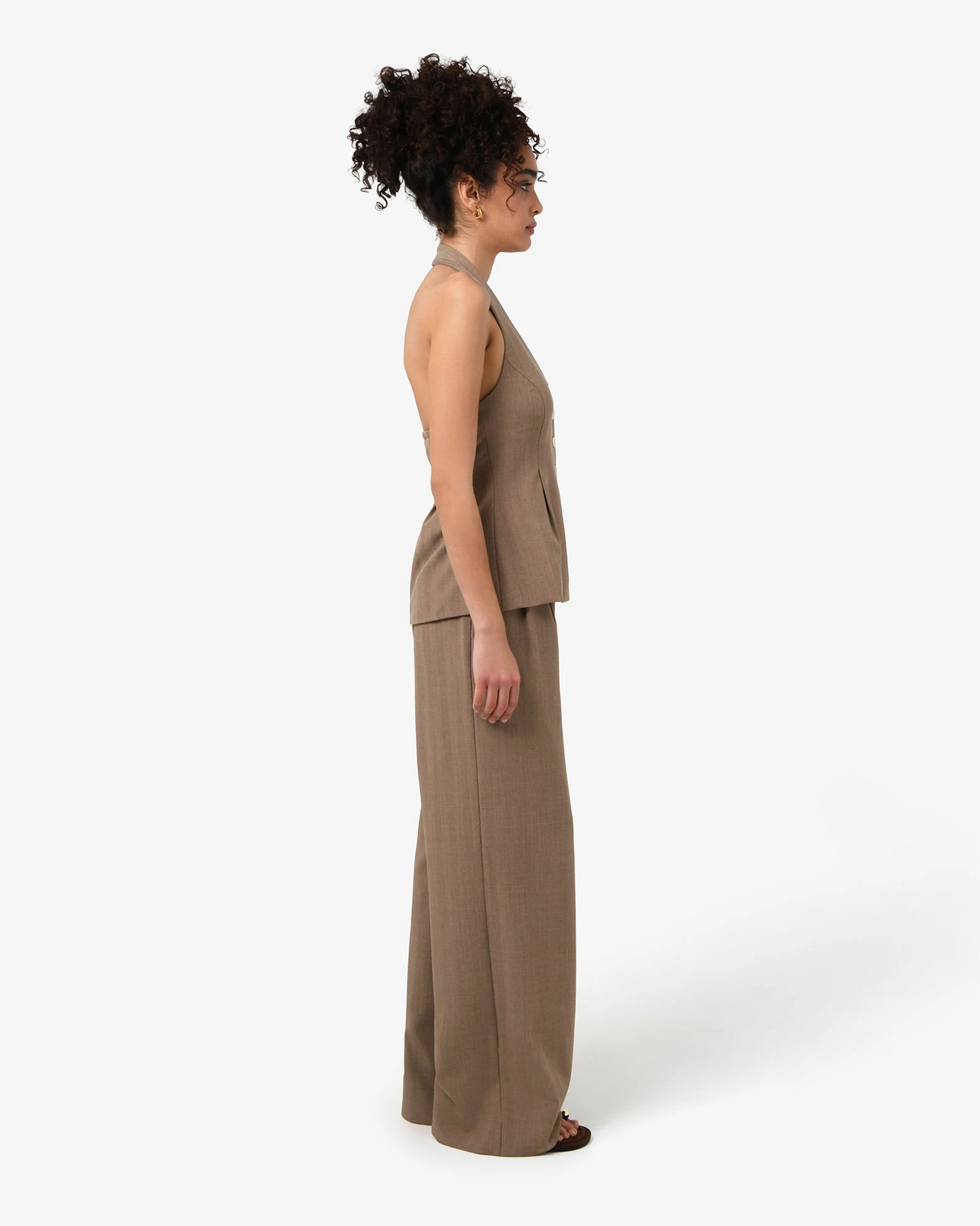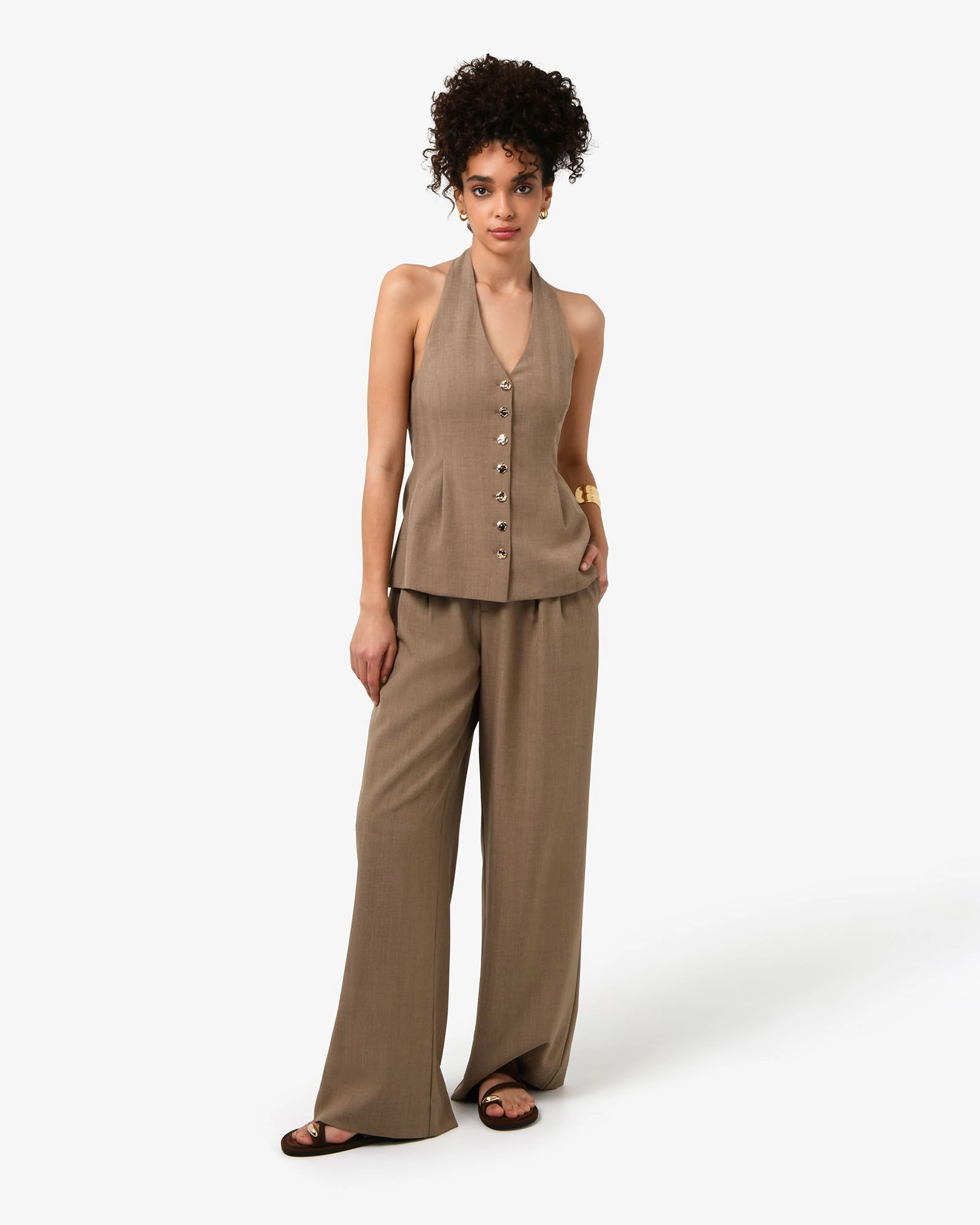 The Lola Lurex Blend Wide Leg Pant features classic tailoring with a high-rise waist, double front pleats, and a wide-leg silhouette. Finished with a tailored waistband, side pockets, and back darts, Pair it with the matching Lola Halter Neck Peplum Vest for a coordinated set, or style it with fitted tops, blouses, or blazers for versatile dressing.