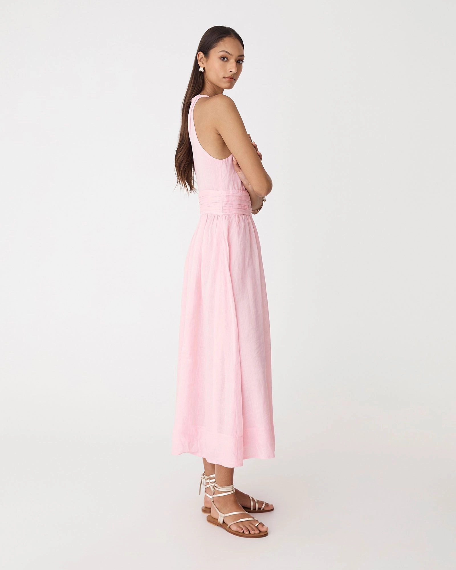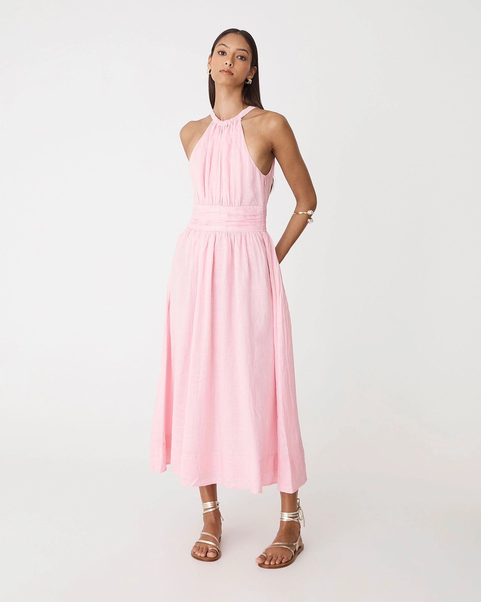 The Miami Gathered Neck Dress features a high, gathered, halter neckline, centre-back keyhole with a loop button closure, wide pleated waistband, and a full flowing maxi skirt in ramie fabrication. It offers a flattering, comfortable silhouette - suitable for all warm-weather events. Pair with heels and statement jewellery to complete your look.