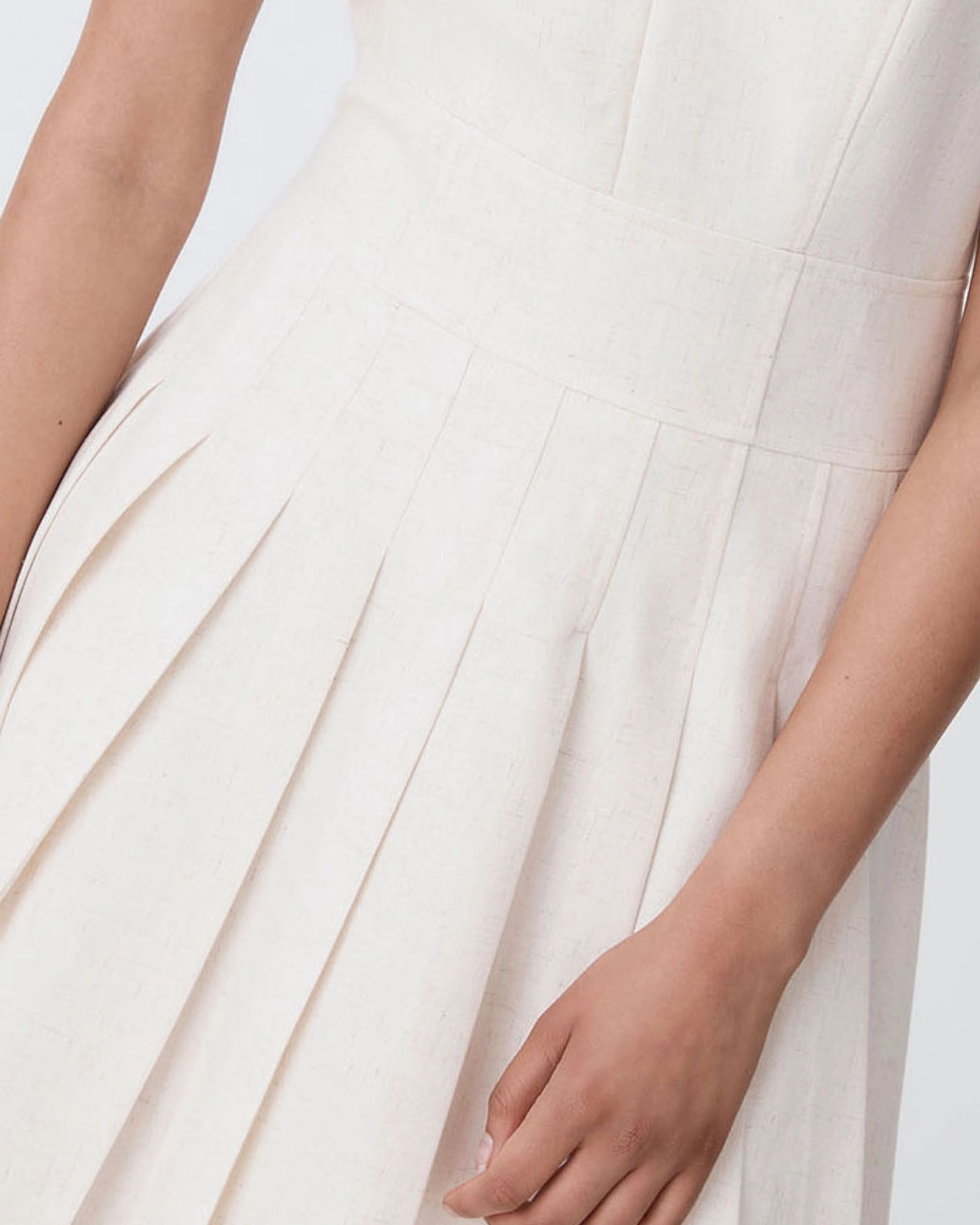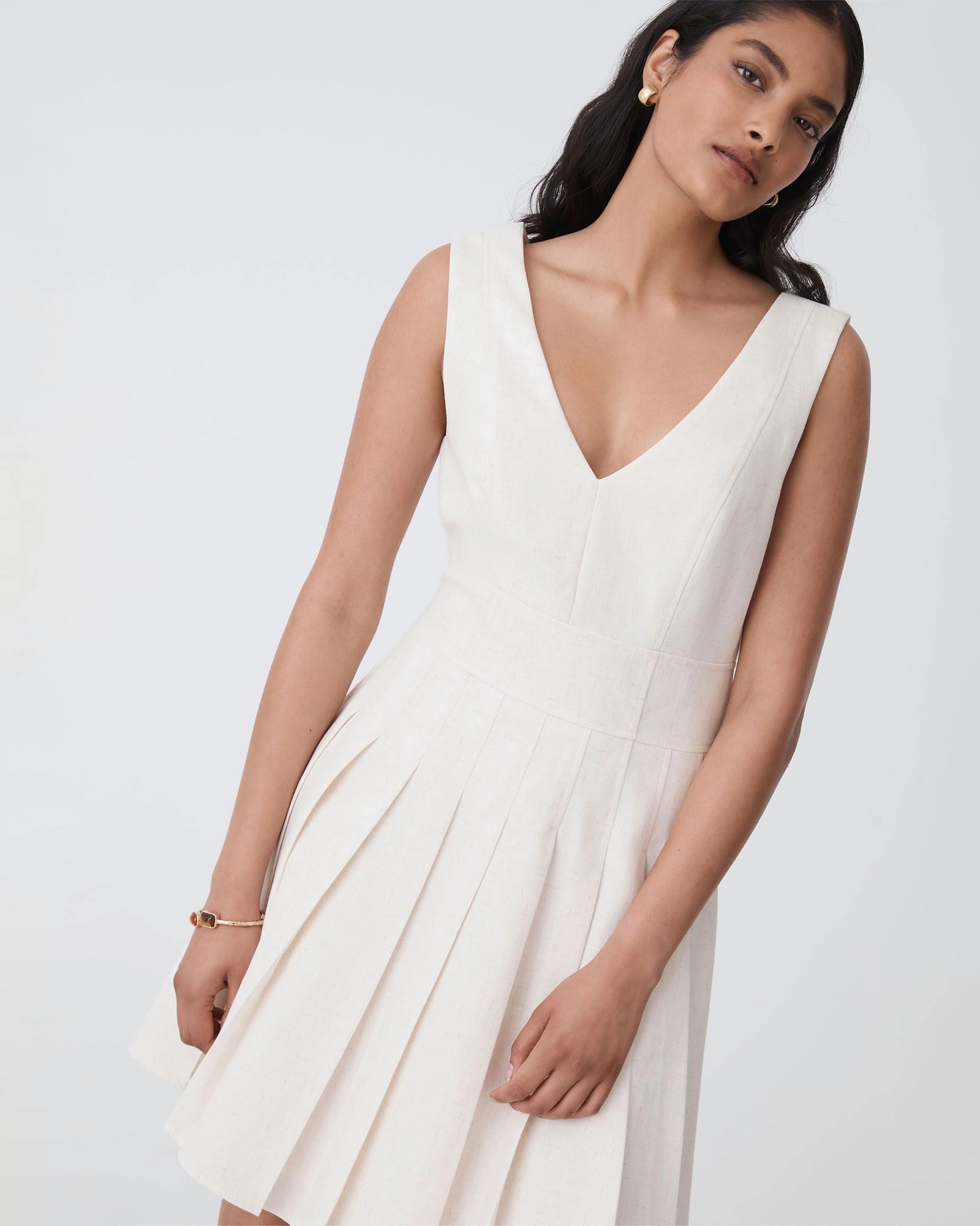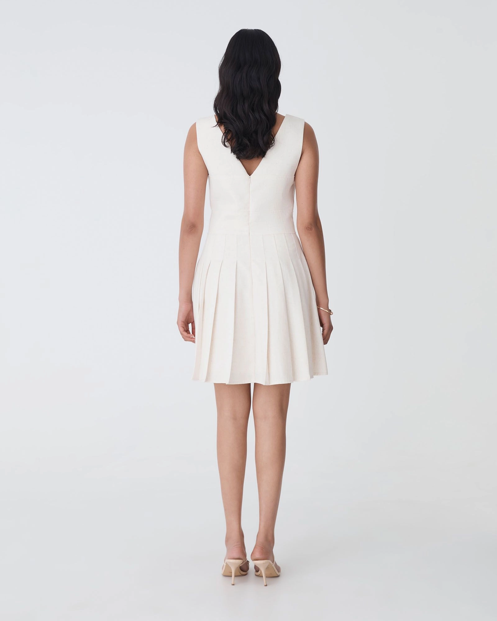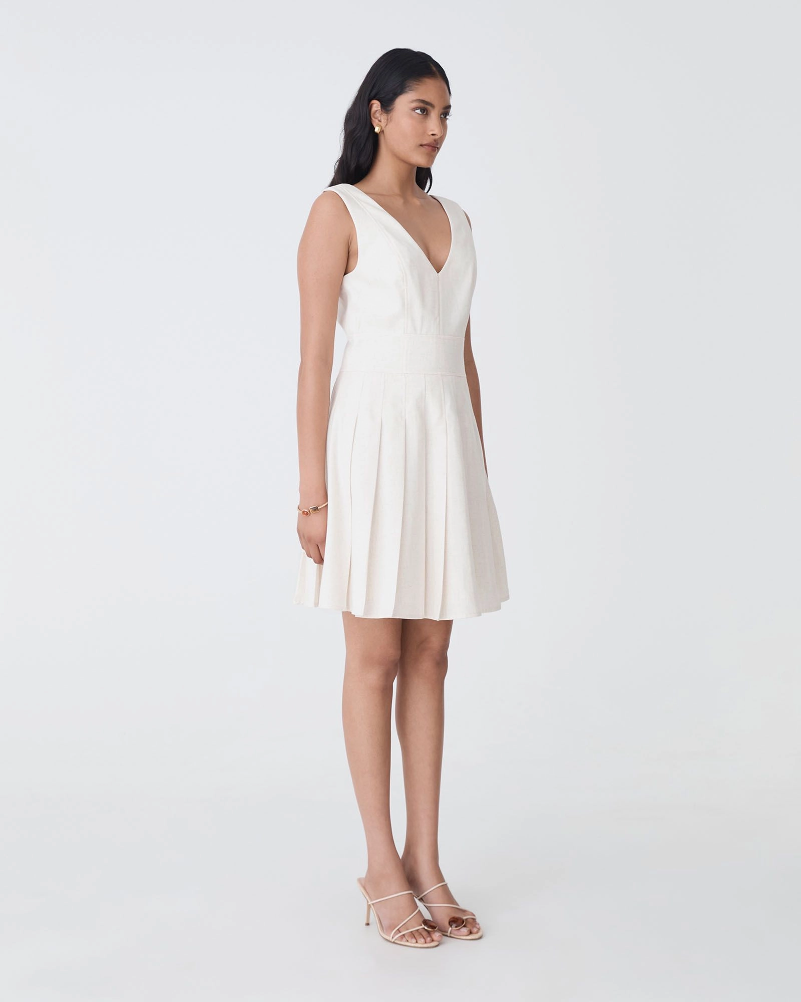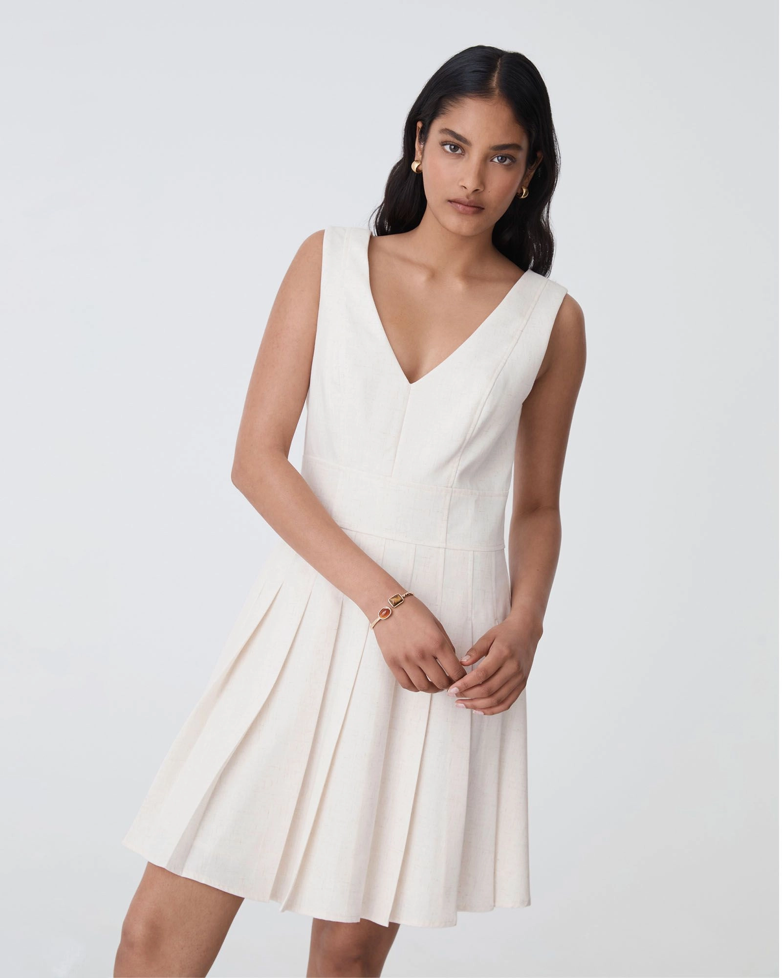The Mikala Pleated Mini Dress is a modern piece made from a linen blend fabrication with a subtle cross-hatch pattern. It features a deep V-neckline, a pleated skirt, and a structured bodice with a wide inset waistband to cinch the silhouette. Fully lined with an invisible back zipper, it’s the perfect choice for day to night occasions.