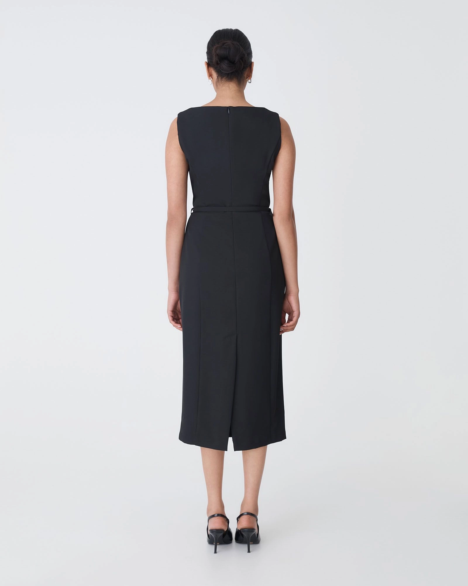 Sleek and timeless, the Mila Pencil Midi Dress features a tailored fit with a classic boat neckline, sleeveless cut, and structured princess seams. A slim matching belt defines the waist, while the midi length and back vent allow easy movement. Perfect for transitioning from workdays to evening plans.