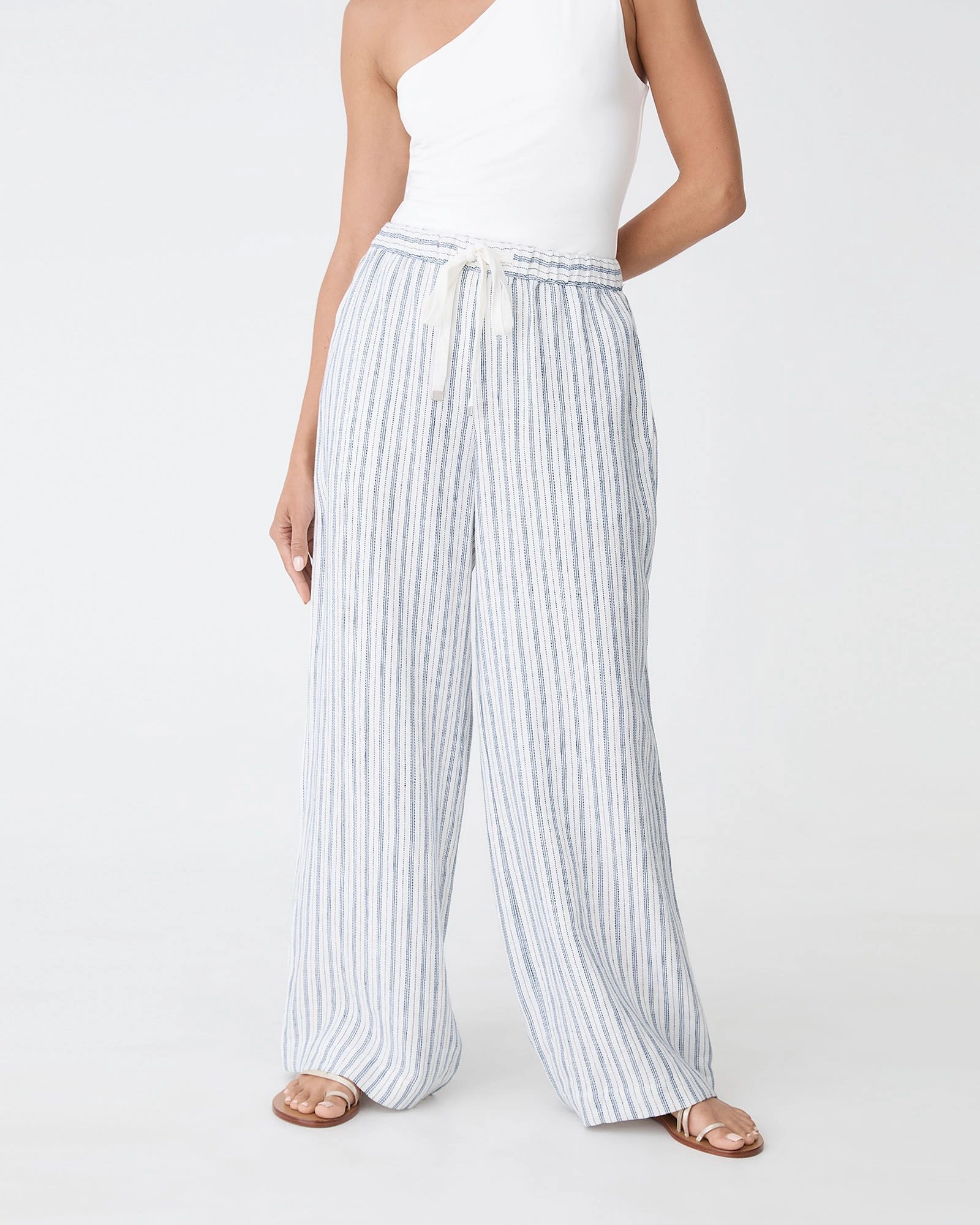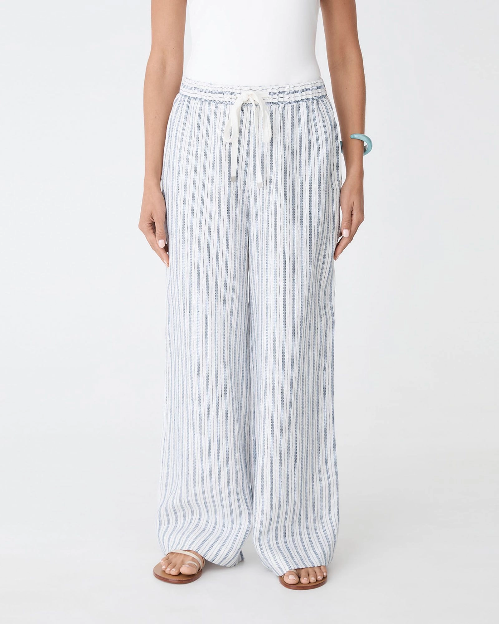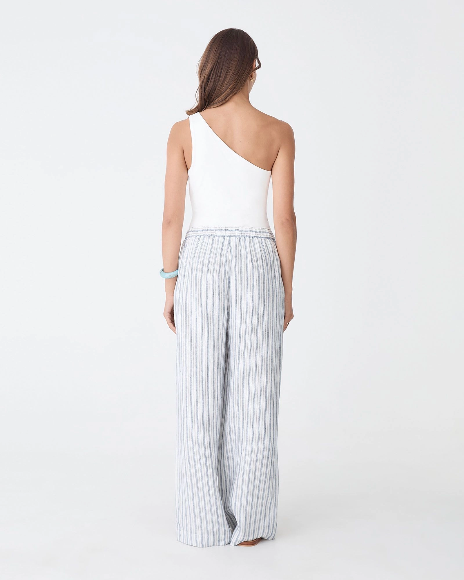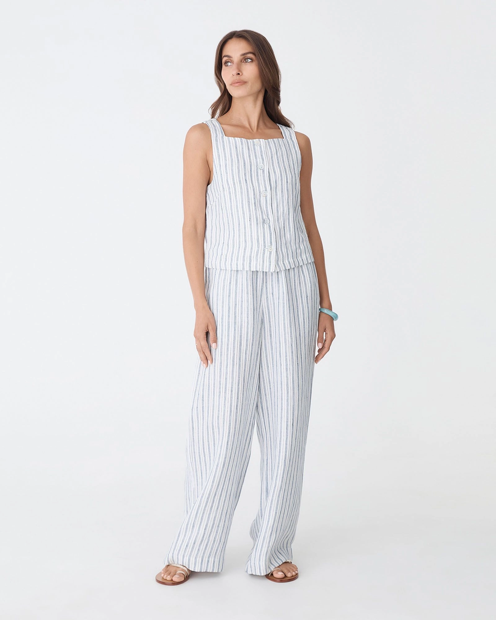 The Milos Wide Leg Linen Pants feature a straight, relaxed wide-leg silhouette, a fully elasticated waistband with an adjustable drawstring, functional side pockets, and a timeless stripe pattern. Designed in 100% Linen fabrication, these pants offer comfort for everyday wear. Pair them with the matching Milos Button Through Shell Top or keep it simple with a tucked-in tee and sandals.